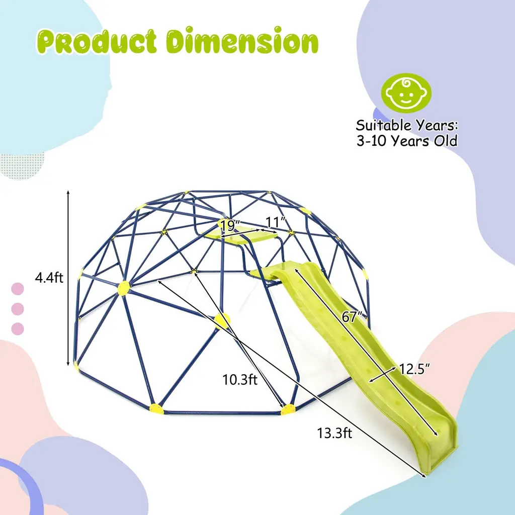 Specifications:Description:This multicolored geometric climbing dome is perfect for children aged 3-10, offering a fun and active play experience. Measuring 13.3 x 10.3 x 4.4 ft with platforms sized at 19" x 11", it provides plenty of room for multiple kids to explore and engage. The extra-long wavy slide delivers a thrilling yet safe descent, encouraging outdoor play and promoting motor skill development. Designed with various climbing spaces, this metal and PE structure allows children to climb, hang, and socialize, while the two built-in rest platforms offer convenient break zones. Constructed with durable, wear-resistant metal pipes and sturdy connectors, the climbing dome ensures long-lasting performance, making it perfect for both indoor and outdoor use. With smooth edges and a focus on safety, this dome climber offers a secure environment for energetic kids to enjoy hours of play.Key Features:● Extra-long Wavy Slide: The geometric climbing dome boasts an extended wavy slide, offering your child an exhilarating yet secure descent. This feature promotes active playtime with a fun sliding experience.● Diverse Climbing Spaces: Designed with different climbing spaces, this decagonal dome climber allows multiple kids to explore and play simultaneously. It’s a perfect structure for energetic youngsters to climb, hang, socialize, and develop vital motor skills.● Built-in Resting Zones: 2 strategically placed rest platforms provide oases of calm within this dynamic metal jungle gym, which are perfect for those moments when your little climbers need to take a break before continuing their adventure.● Stable Metal Construction: Constructed with metal pipes that are wear-resistant and anti-rust, this climbing dome prides itself on sturdiness, and is ideal for indoors and outdoors. Coupled with durable connectors, it will endure rigorous play for years to come.● Safety Design for Children: The geometric dome climber features smooth edges to prevent any playtime mishaps.