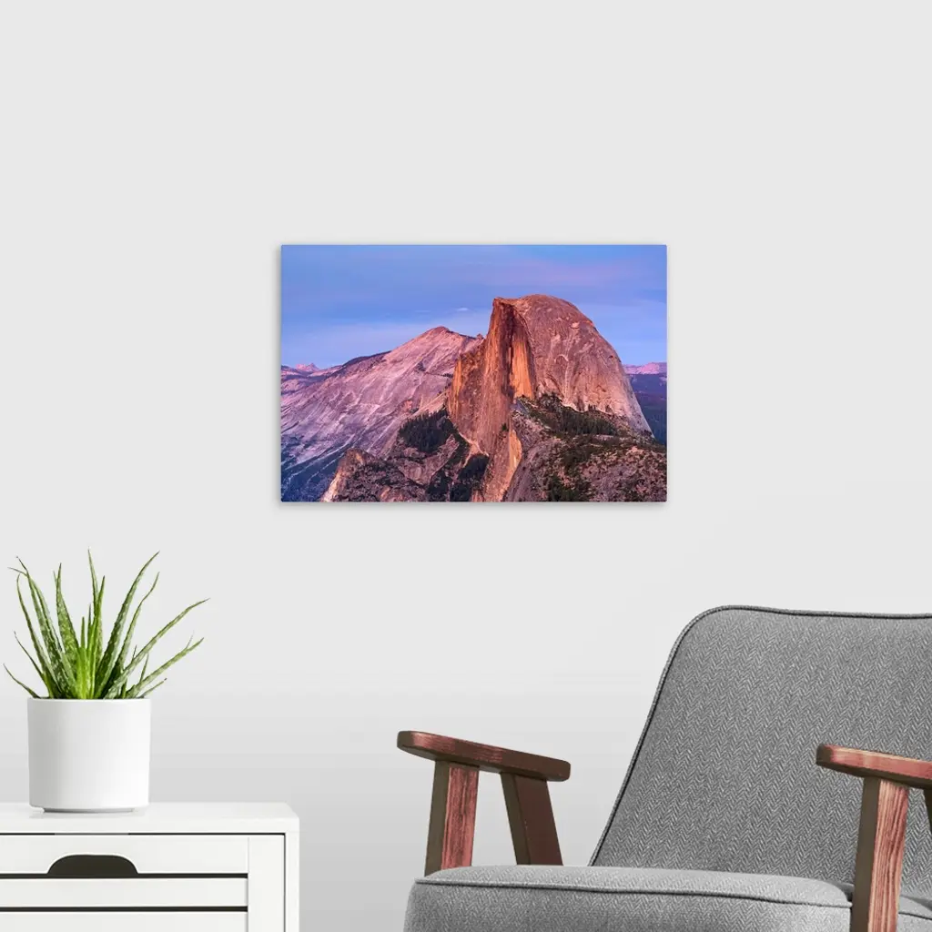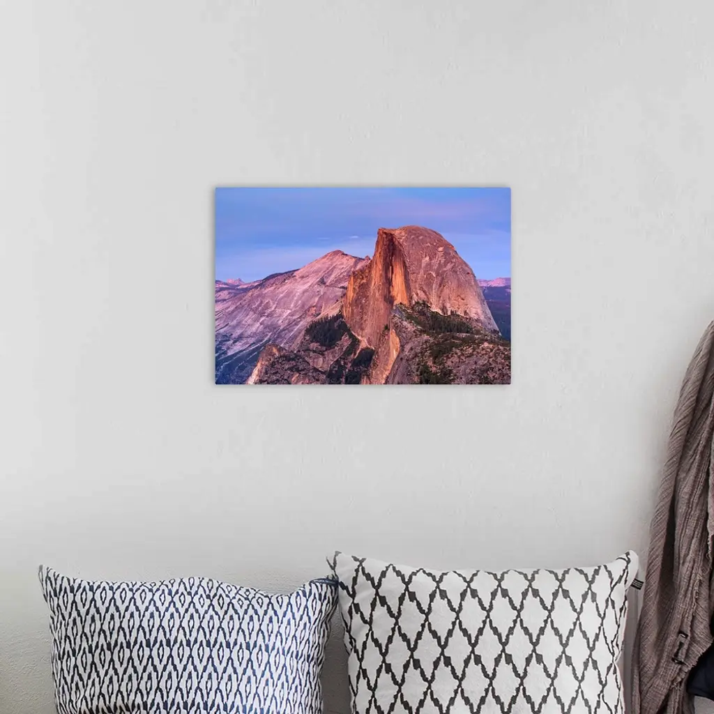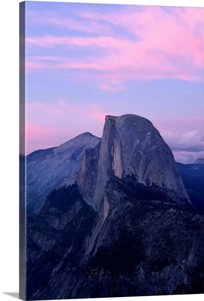 Half Dome in Yosemite bathed in pink light from the sunset.