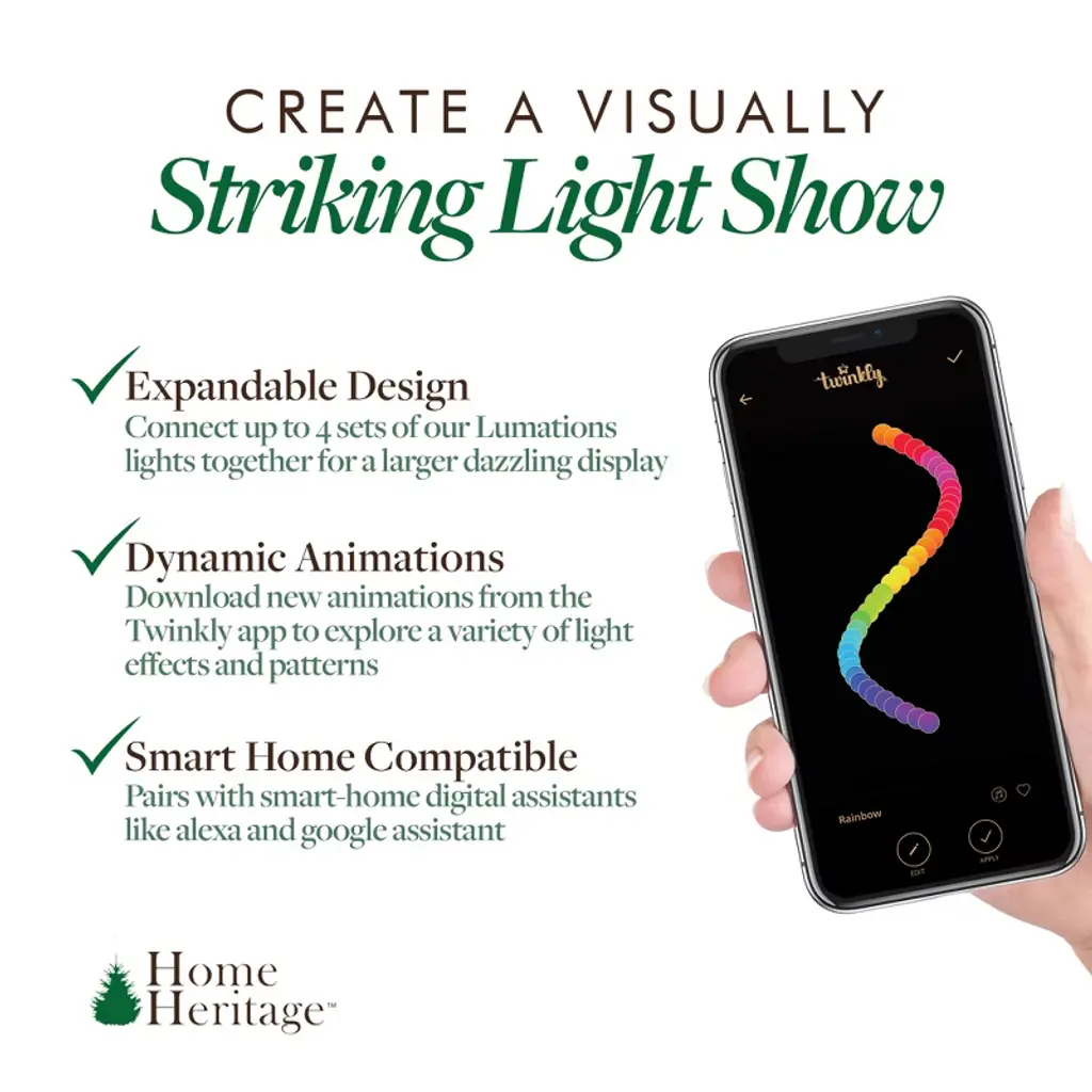 Create an extravagant light show with Home Heritage Lumations line of Twinkly App-Controlled RGB LED Holiday Lights. By using the Twinkly app, the possibilities are endless with the power to change the light effects in the palm of your hand. The string lights combines 100 bright, colorful, RGB LEDs, Bluetooth, and a state-of-the-art Twinkly smartphone application, to perform amazing animations easily and quickly. Choose and download new animations for your lights, or if you’re feeling creative and want to be original, map out the lights using your phone camera, and create new effects yourself. These lights are perfect for any holiday, or you can hang them up in a dorm, bedroom, theater, or gaming space and change the colors with your mood. Suitable for indoor and outdoor use. Create your perfect light display with the Lumations line of Twinkly App-Controlled RGB LED Holiday Lights by Home Heritage.