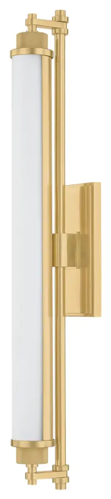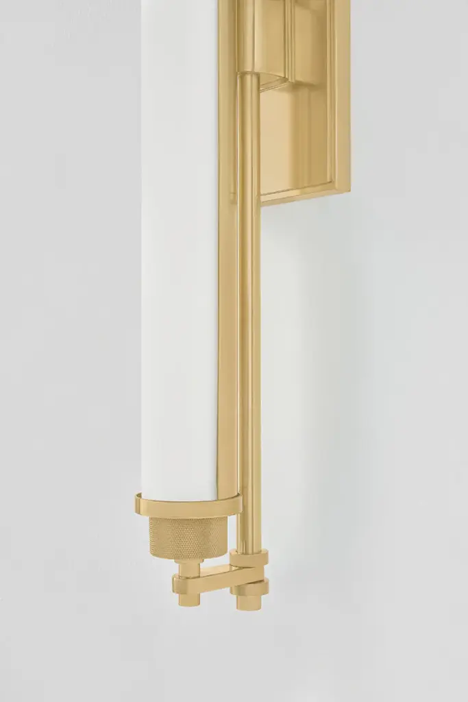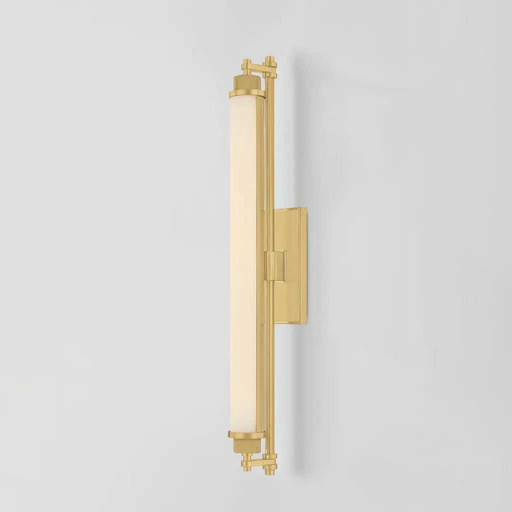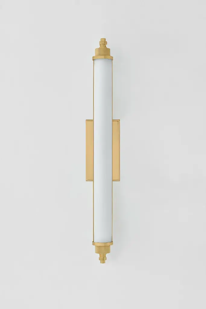 Designed for bath and powder rooms, Plandome is a sleek, machine-inspired sconce with high functionality. Featuring a single LED-lit opal matte glass tube supported by a central stem, this slender fixture can be used individually or in multiples as needed. Finished in Aged Brass or Polished Nickel, the metalwork adds a stylish quality to a thoroughly modern sconce. Available in two sizes.