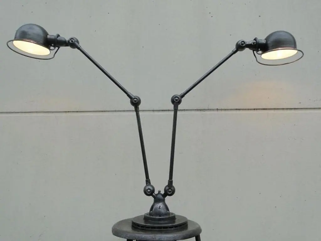2 x 2 armed JIELDE floor lamp Reading lamp French Graphit lampDesigned by Jean-Louis Domecq in the early 1950sORIGINAL Jielde lamp, professionally restored in our workshopThe inside of the shade is coated with heat-resistant paintArms:4 x 15.74 in / 40cmØ of the shade 6.29 in/ 16cmØ with ring 7.87 in / 20cmTotal height adjustable 39.37 in / 100 cmThe lamp stands on a new ventilated brake disc, which guarantees the best stabilityThe electrification has been adapted to today's standard and works with an E27 light bulbWe deliver the lamp with the plug corresponding to your country.The lamp has no damage - slight, normal signs of use after approx. 70 yearsThey are in perfect working order and work whit ALL currents.