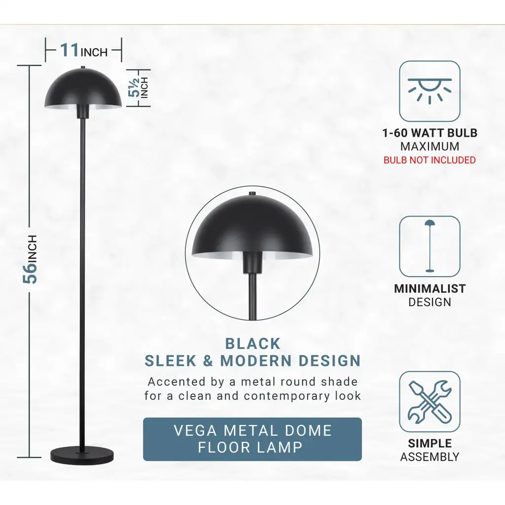The Kenroy Home Vega Floor Lamp offers a sleek and modern minimalist design, making it an ideal accent for any room. This floor lamp brings a fresh and contemporary feel to your space. The metal round shade adds a clean and stylish touch, ensuring the lamp complements a variety of décor styles. Perfect for your living room, office, or bedroom, the Vega Floor Lamp makes a bold statement without overwhelming the room. Its elegant design enhances the ambiance of any space, offering both functional lighting and a striking visual appeal. At Kenroy Home we believe your home should be a reflection of your unique style and a place where beauty meets comfort. Through carefully crafted designs and timeless décor solutions, we help transform everyday spaces into inviting sanctuaries. With an unwavering commitment to quality and functionality, we create pieces that blend seamlessly into the heart of your home. Kenroy Home is proudly an American owned company.Floor Lamp: Crafted from durable metal, ensuring long-lasting use; features a sleek round metal shade that perfectly complements the minimalist design, making it a timeless addition to any roomVersatile Design: With its minimalist design, the white modern floor lamp effortlessly complements a variety of styles, from contemporary to transitionalBulb Requirements: Designed to accommodate 1-60 watt maximum bulb or an LED equivalent, this floor lamp provides ample lighting to brighten your space (bulb not included)For Any Space: Whether you need additional lighting for reading, work, or ambiance, it is both practical and stylish, perfect for enhancing your home, bedroom, office, or living spaceDimensions: Measuring 11" L x 11" W x 56" H, the tall floor lamp stands at the perfect height to provide excellent illumination without overpowering the room; the metal shade itself measures 11" L x 11" W x 5.5" HShade Dimensions: 11 inches depth x 11 inches width x 5.5 inches heightCord Length: 62 inchesSocket Quantity: 1Bulb Shape: A19Socket Type: E26Light Bulb Type: Replaceable LEDLight Bulb Included: NoVoltage: 120Fixture Dimmable: No