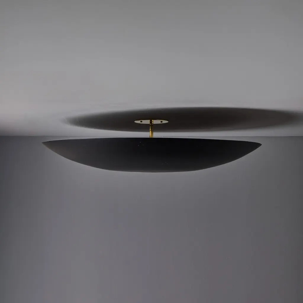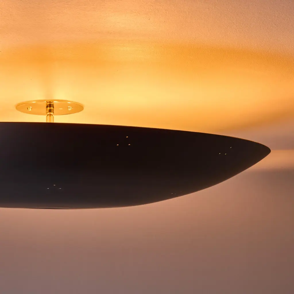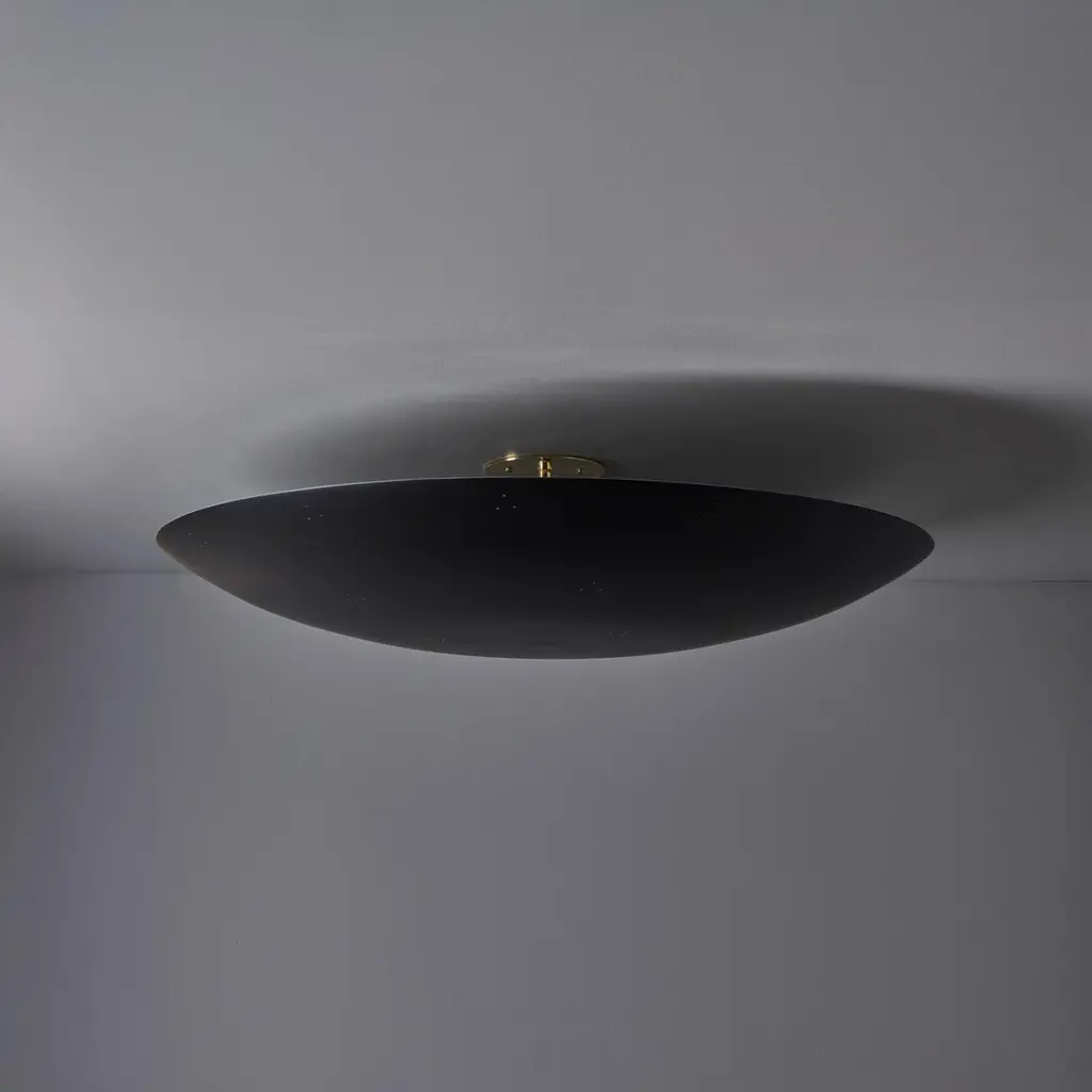 Large Raul Reyes 'Rey 30' Perforated Dome Ceiling Lamp in BlackHand-fabricated in Los Angeles, these highly refined ceiling lamps are reminiscent of the iconic mid-century Finnish designs of Paavo Tynell and Lisa Johansson Pape. Executed in black-painted perforated metal with polished brass hardware.Price is per item. Available in unlimited quantities. Custom sizes available (any diameter from 12" to 34" in 2-inch increments). Also available as a chandelier (with 16" standard drop, customizable) and in polished brass, patinated brass, white, or black variants. Prices vary. This listing is for the 30" flush mount in black with brass hardware.Accommodates 3x maximum 60w equivalent standard E26 medium base LED bulbs (LED only). UL listed. Dimmable according to bulbs (not included).1 lamp in stock. Out of stock lead time can take 4-6 weeks or more. Please note that in-stock availability can change at any time. For time-sensitive orders, kindly inquire prior to purchasing.Please note only one representative example is featured in the photos. This lamp has hardware fabricated in raw and unlacquered brass that will naturally patinate over time and can already show varied signs of patination through exposure to the elements, handling, storage, etc., which may result in variation and irregularities. Patination is a dynamic process which evolves in beautifully unpredictable ways to create a unique look with its own special characteristics. Additionally, the hand crafted perforation layout of each lamp can show variation including in the number of holes present and is also dependent upon the diameter of the lamp itself.Made to order. All sales are final.