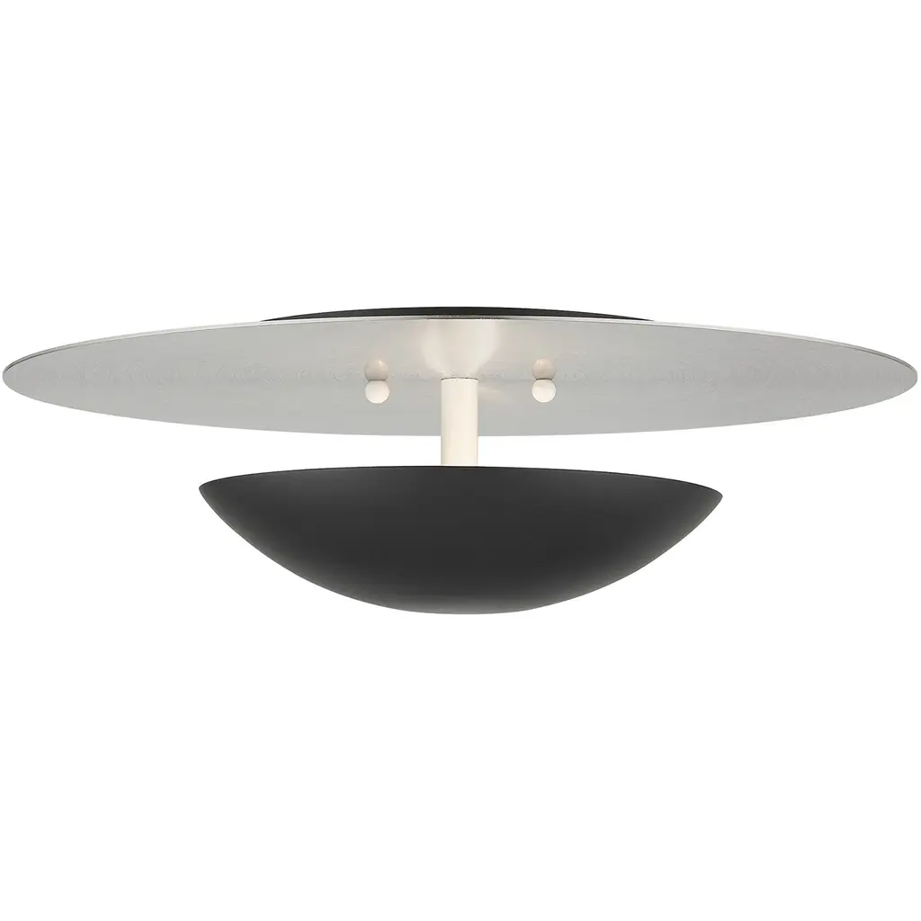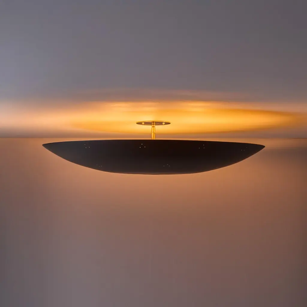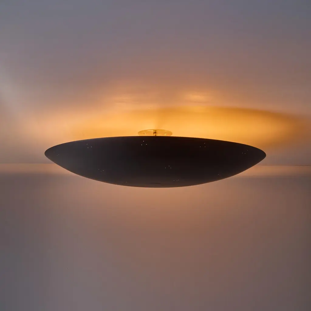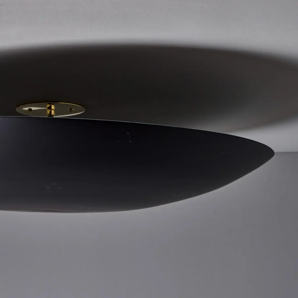 Large Raul Reyes 'Rey 30' Perforated Dome Ceiling Lamp in BlackHand-fabricated in Los Angeles, these highly refined ceiling lamps are reminiscent of the iconic mid-century Finnish designs of Paavo Tynell and Lisa Johansson Pape. Executed in black-painted perforated metal with polished brass hardware.Price is per item. Available in unlimited quantities. Custom sizes available (any diameter from 12" to 34" in 2-inch increments). Also available as a chandelier (with 16" standard drop, customizable) and in polished brass, patinated brass, white, or black variants. Prices vary. This listing is for the 30" flush mount in black with brass hardware.Accommodates 3x maximum 60w equivalent standard E26 medium base LED bulbs (LED only). UL listed. Dimmable according to bulbs (not included).1 lamp in stock. Out of stock lead time can take 4-6 weeks or more. Please note that in-stock availability can change at any time. For time-sensitive orders, kindly inquire prior to purchasing.Please note only one representative example is featured in the photos. This lamp has hardware fabricated in raw and unlacquered brass that will naturally patinate over time and can already show varied signs of patination through exposure to the elements, handling, storage, etc., which may result in variation and irregularities. Patination is a dynamic process which evolves in beautifully unpredictable ways to create a unique look with its own special characteristics. Additionally, the hand crafted perforation layout of each lamp can show variation including in the number of holes present and is also dependent upon the diameter of the lamp itself.Made to order. All sales are final.