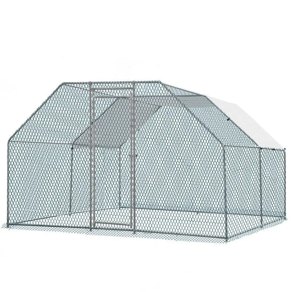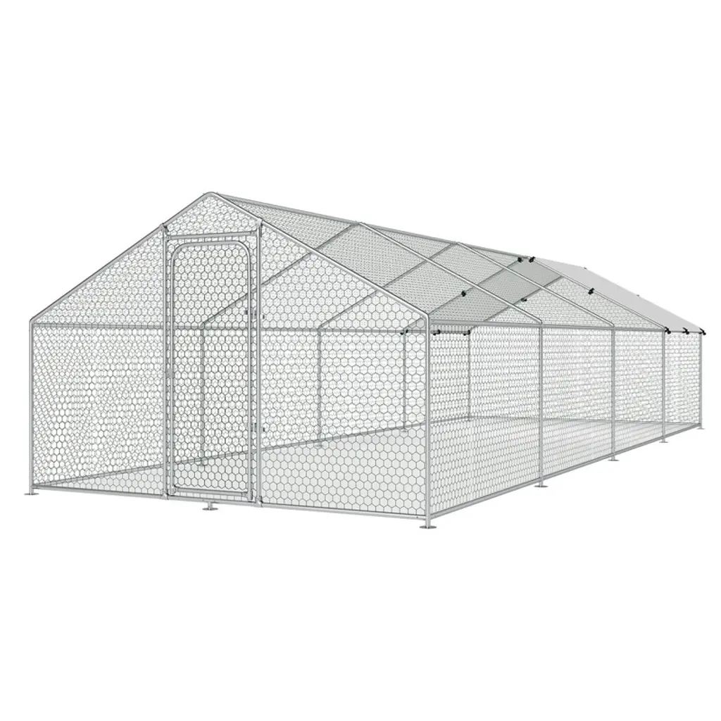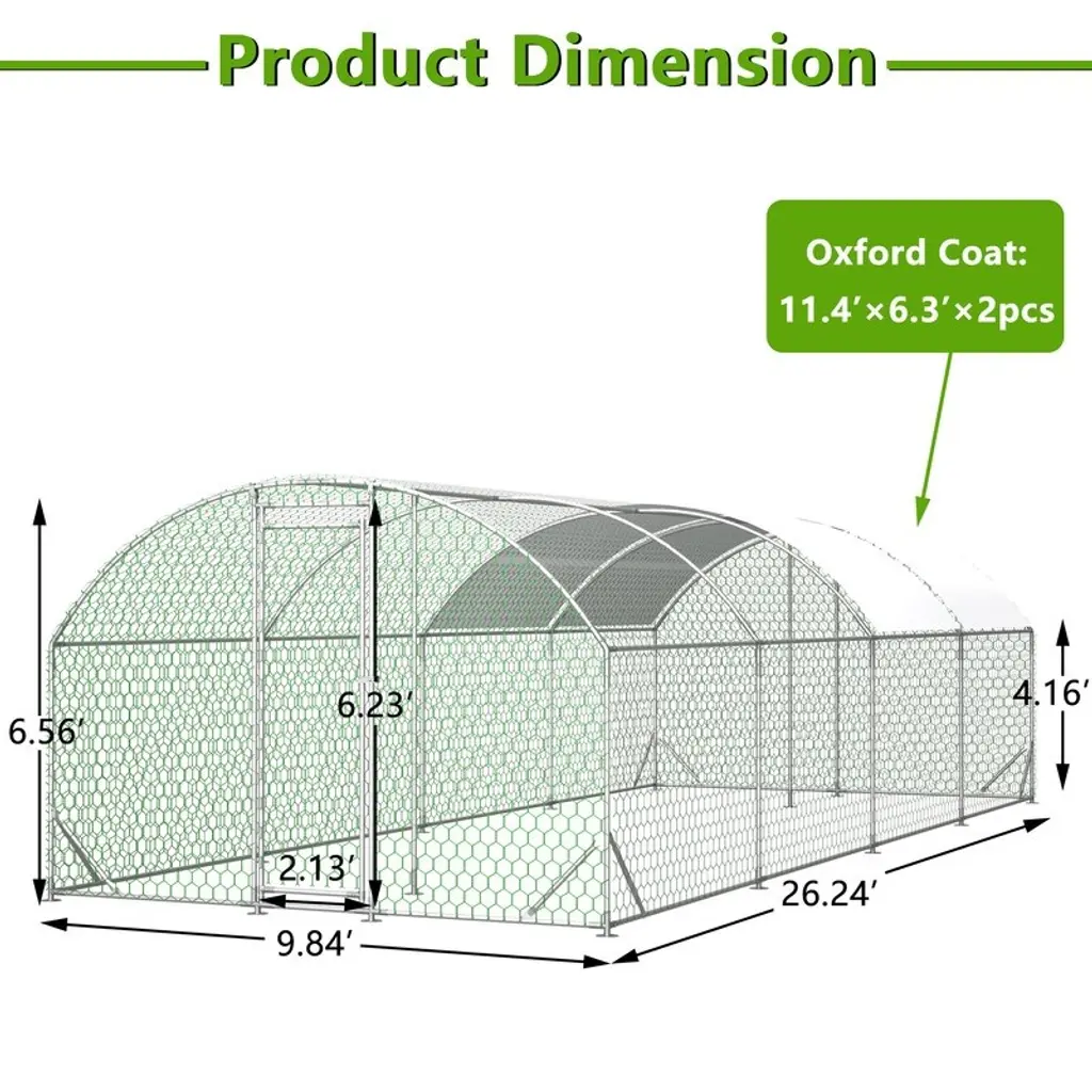 DescriptionOur chicken run manufactured with high quality steel frame, including ground nails, so that the fence can better fixed to the ground.solid enough to keep the poultry from escaping and secure from predators. And this hen run house is also stably stationed to withstand the wind and snow weather. Featuring a durable sun and rain-proof tarp on the top, it is protective for the steel frame, wire mesh and animals under its cover. And the tarp is sturdy enough to avoid tear up or fade over time. With hexagonal wire mesh and the small gaps between meshes, you can prevent your chicken from some predators to make them safety. The spring clasp design requires no-welding for your quick assembly with this large metal chicken run. You can easily understand the installation with a complete set of components and simple instructions we offered. Lockable chicken run house suitable for a variety of animals like for chickens, rabbits, ducks and more.This walk-in metal poultry house has a spacious area for the animal to play and rest in the backyard garden and farm settings.Product Features · Spacious and Enclosed Activity Area: This large metal chicken run is specially designed for domestic animals to exercise and forage outdoors.· Safety Design: Lockable door with a latch makes this large chicken coop extra safety. And the chain link walling features steel wires and a sturdy galvanized steel frame that's resistant to wear and rust, allows you to avoid worrying about small animals being intruded by predators at night. The metal wire is treated with a dipping process that ensures protection against injury.· Shady Roof: The shady roof with spring button clips helps your pet stay cool in the heat while avoiding dehydration and keeping them comfortable. The coverage of this chicken cage also protects them in case of rain showers. It's made from specially treated Oxford cloth with water and UV resistance for survivability in bad weather. Offer your small pet a homier space with a place to stay roofed.· Walk-in Design: This metal chicken pen offers walk-in height. Enter easily and comfortably through a door that locks when you're done. Attach it to a wooden coop for an upgraded shelter.· Chicken Coop Info: Overall Dimensions: 9.84'l x 13.12'w x 6.56'' H. The diameter of galvanized steel pipe: 1" Tube Diameter. Assembly required.3*4mAssembled Length (in.): 118.00Assembled Width (in.): 157.44Assembled Height (in.): 78.72Weight (lbs.): 90.003*6mAssembled Length (in.): 118.00Assembled Width (in.): 236.00Assembled Height (in.): 78.70Weight (lbs.): 107.003*8mAssembled Length (in.): 314.88Assembled Width (in.): 118.08Assembled Height (in.): 78.72Weight (lbs.): 134.77Notes:Assembly RequiredThis product will ship to you in multiple boxes.Disclaimers & Disclosures:Contact US:After-sales Email Address: dhalcomb@doorise.comIf the item comes with any defect, damage(include damaged in transit) or missing partsand, please contact us with detailed images for free replacement or refund.