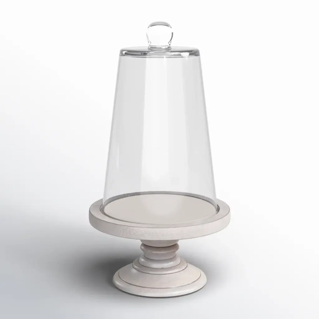 Classic in design with a whitewashed turned wood base, this cloche is light and lovely. A beautiful way to display natural elements, flameless candles or ornaments.