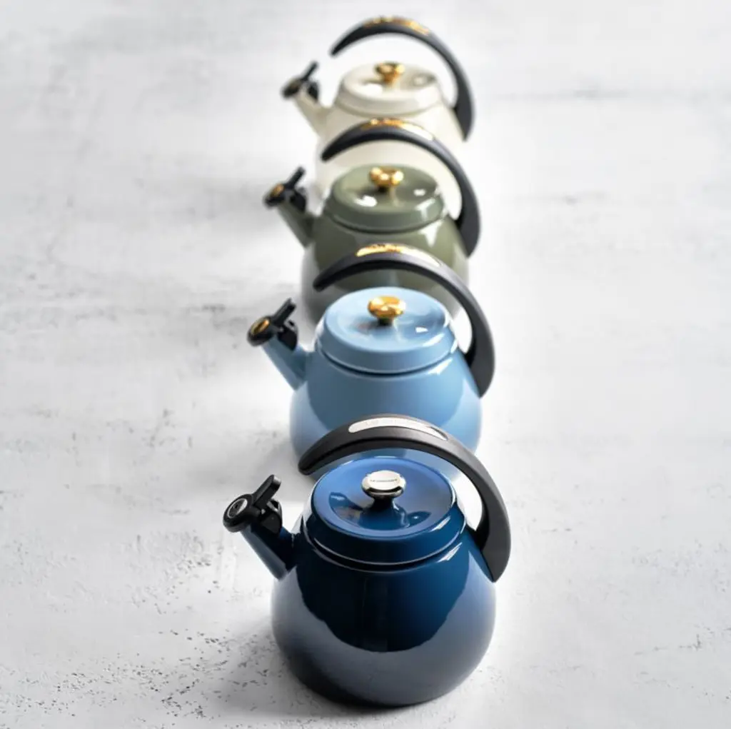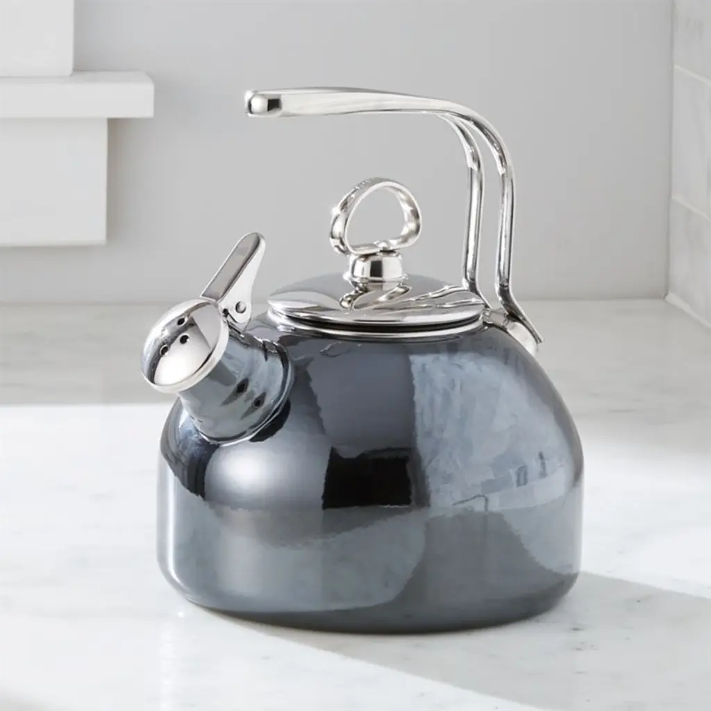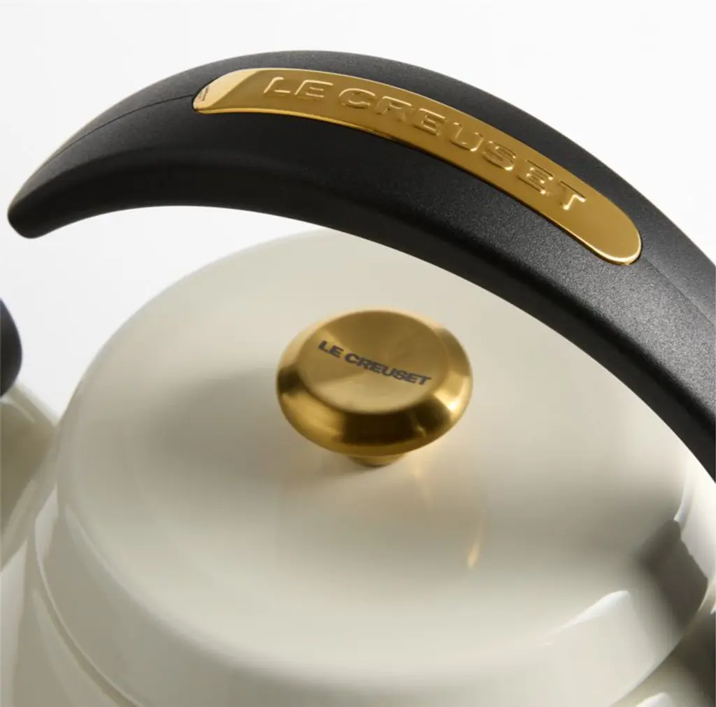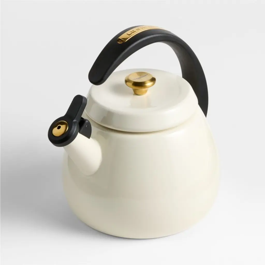 Adorn your stove (and boil water, of course) with this display-worthy kettle coated in creamy enamela Crate & Barrel exclusive. Made of quick-heating carbon steel that works with all stovetops, the kettle announces that water has reached a rolling boil with a classic, charming whistle. The enamel resists chips and stains, and the black handle arcs dynamically for easy pouring and a comfortably cool grip. Gold-finished details give the generously sized kettle a gleaming finishing touch.