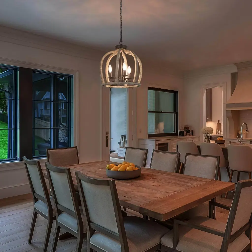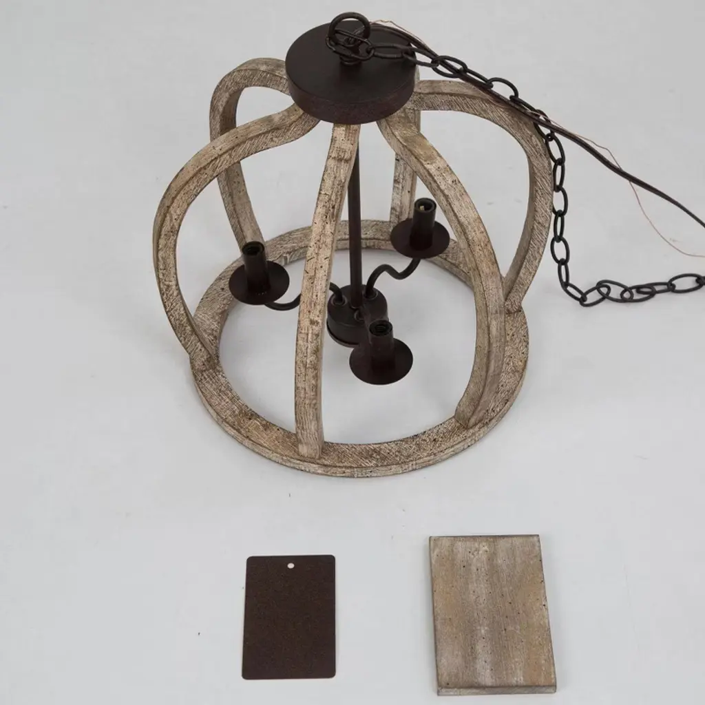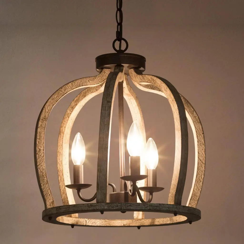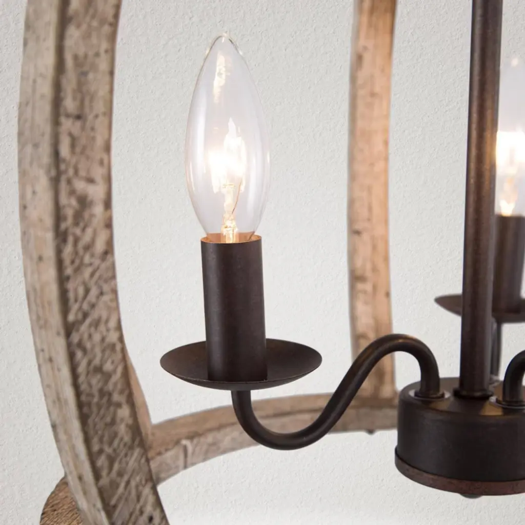 This farmhouse chandelier light is designed in finely mill work pumpkin shape, constructed of durable wrought iron in rusty bronze finish, distressed natural pine wood tone to add much farmhouse retro and with five candelabra base design to boost maximum ambiance to your home place.