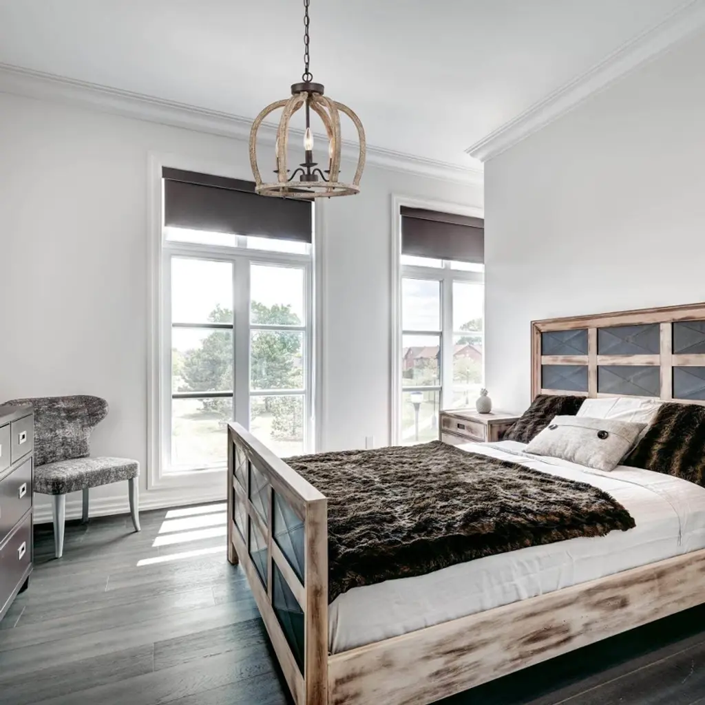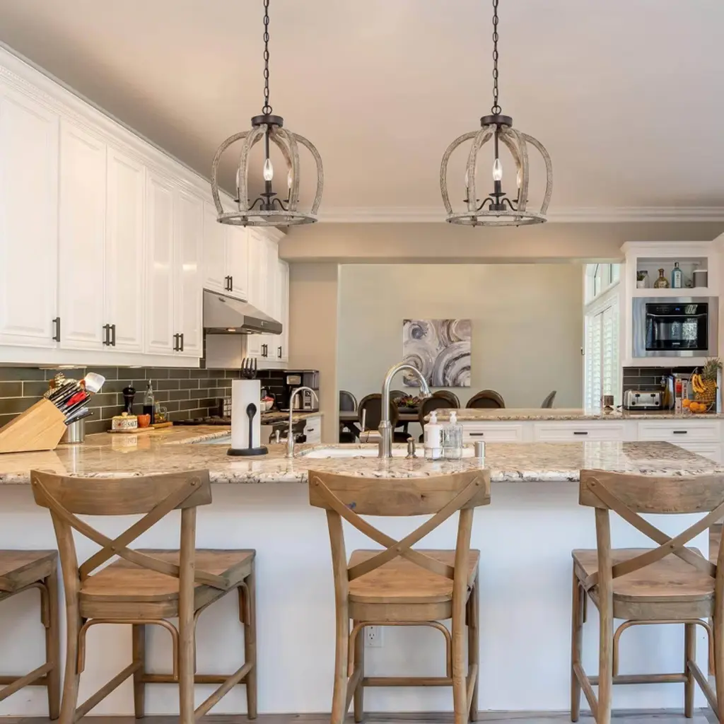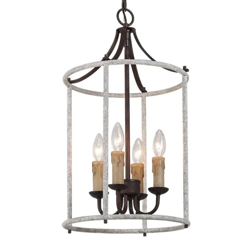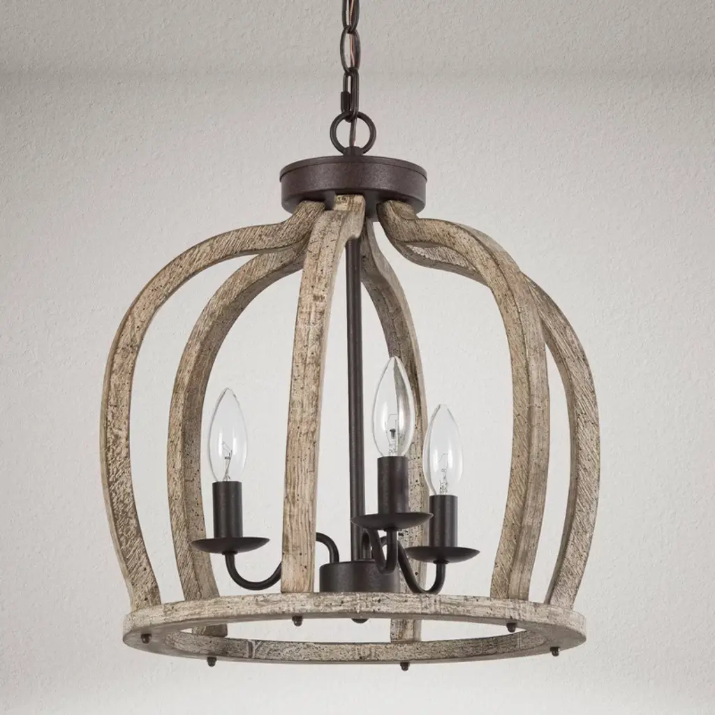 This farmhouse chandelier light is designed in finely mill work pumpkin shape, constructed of durable wrought iron in rusty bronze finish, distressed natural pine wood tone to add much farmhouse retro and with five candelabra base design to boost maximum ambiance to your home place.