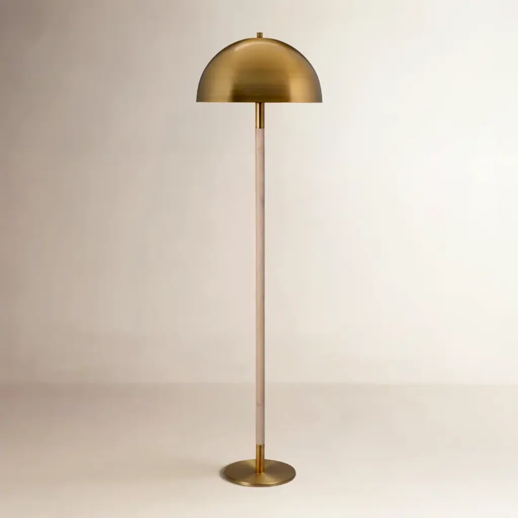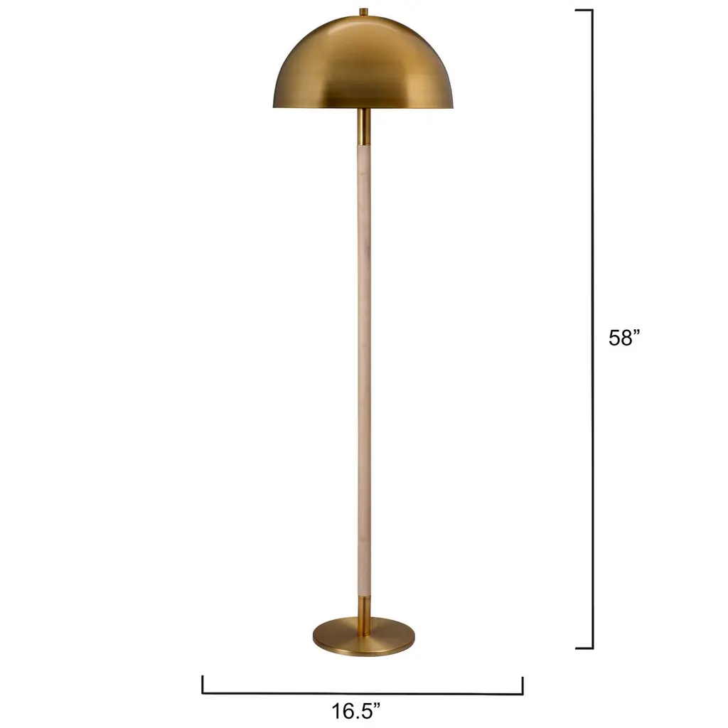 Beautifully burnished metal is the standout design element of this updated version of a classic floor lamp. A simply finished wood base tempers the warmth of the golden shade. It offers filtered and focused illumination, and makes an inspired choice for home or office.