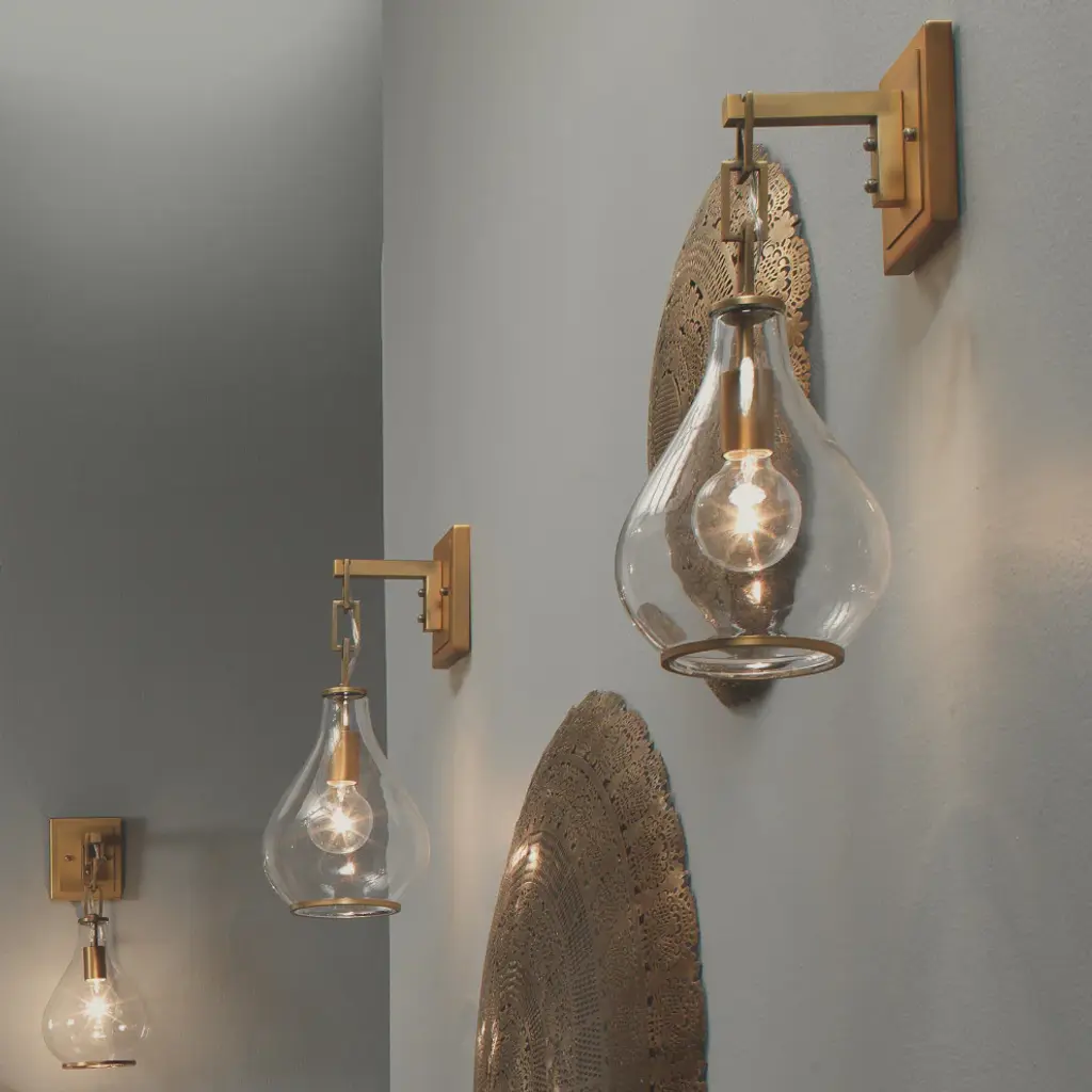 Minimalist Architectural Wall Sconce Glass Tear Drop Hanging Shade Brass Dome