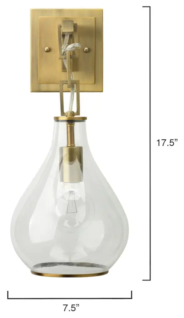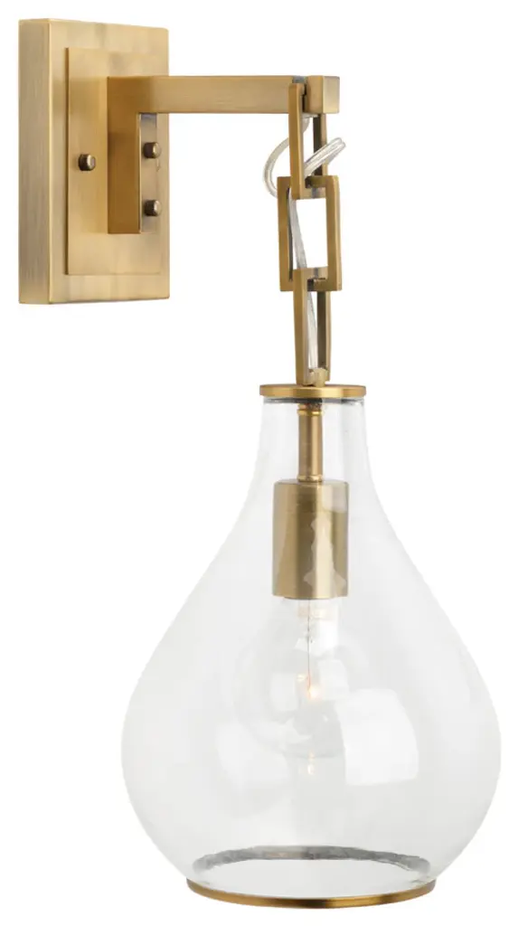 This architectural wall lamp contrasts sleek geometric angles with smooth blown glass. The chain link detail on the Teardrop Wall Sconce adds interest to this silhouette, while exquisite clear glass and antique brass finishes add refined elegance and polish to any space. Available in Brass or Nickel. Coordinating floor lamp and chandelier also available.• 17.5"H x 7.5"W x 9" deep. Weighs 3 lbs. Shade is 7.5"dia x 10"h, 4.5"dia opening• Hand Finished Steel and Glass• UL Listed. Uses 1 max 40 standard Type A bulb (not included). Hardwired.• Heirloom Quality - Expertly hand crafted and hand finished. Due to the hand crafted nature of this piece, each piece may have subtle differences.