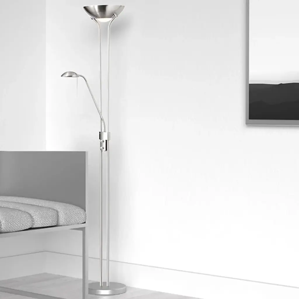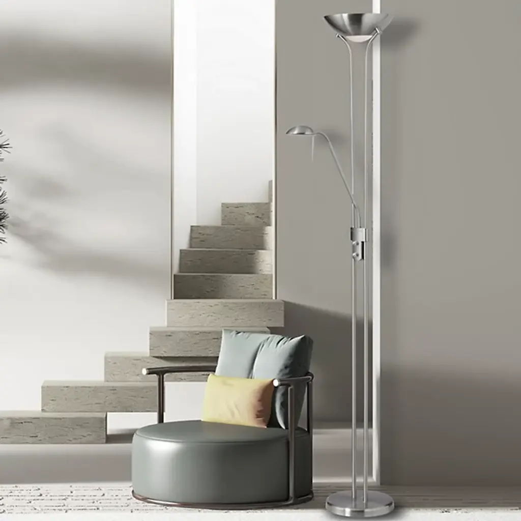 A clean and classically contemporary lighting design. The Mother & Son Dome Floor Lamp by Dainolite includes a torchiere, with an open-bottomed bowl shade providing ambient uplight and downlight, and an adjustable task light for reading. The torchiere and reading light can be turned on and dimmed independently via the rotary dimmer controls set in-between the 2 stems. In a living room or workplace, this floor lamp adds sleek style and versatile functionality.