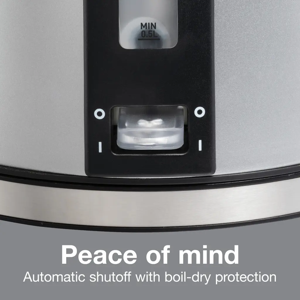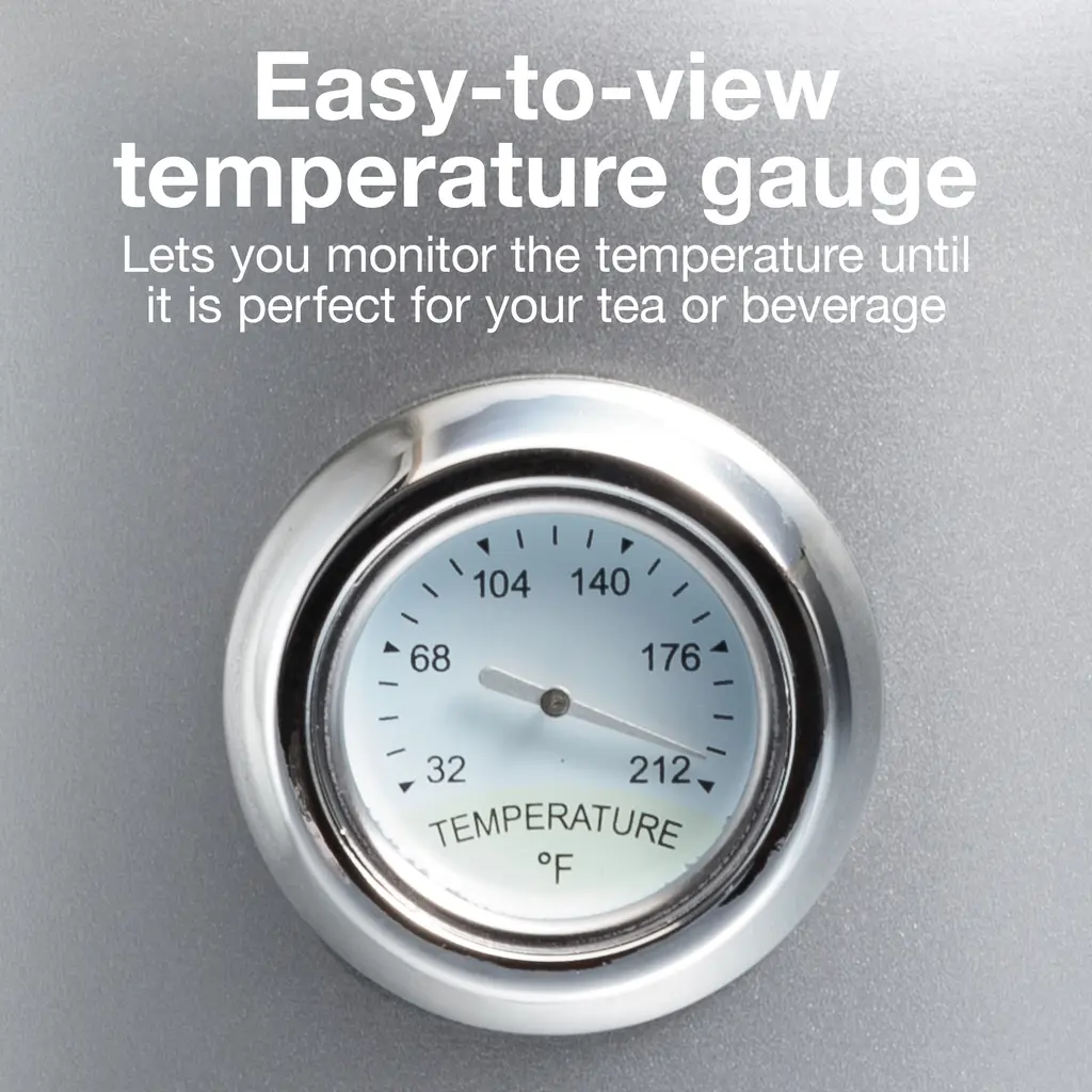 The Proctor Silex® 1.7 Liter Electric Dome Kettle has 1500 watts of power for fast boiling and automatic shutoff with boil-dry protection for peace of mind. The Proctor Silex 1.7 Liter Electric Dome Kettle was designed for simple water heating and boiling. To heat water, simply fill the kettle with water and press the on/off switch down. As the water heats up, you can monitor the easy-to-view temperature gauge until it reaches the perfect temperature for your tea or beverage. If you're simply boiling water, let the water come to a boil and the kettle will shut off automatically. This kettle features convenient cord-free serving so you can bring the kettle to the table or anywhere hot water is needed. The spout's mesh filter helps capture hard-water deposits and removes for easy cleaning. The durable stainless steel construction provides long-lasting performance. An easy-to-view water window allows you to effortlessly monitor the water level while the cord wrap makes storage simple. Backed by a 3 year limited warranty.