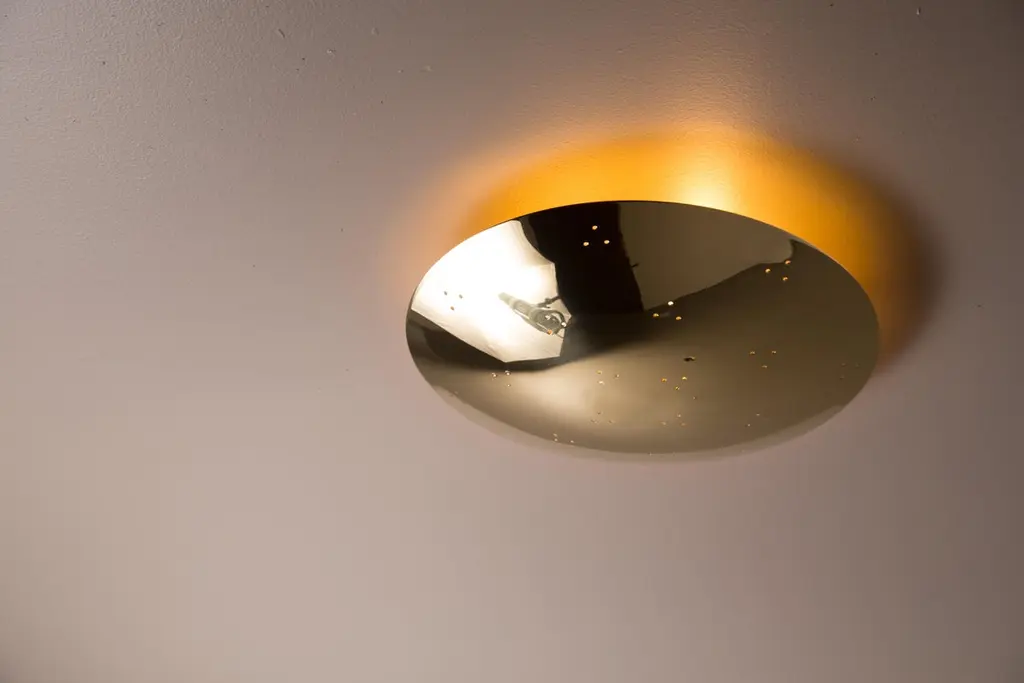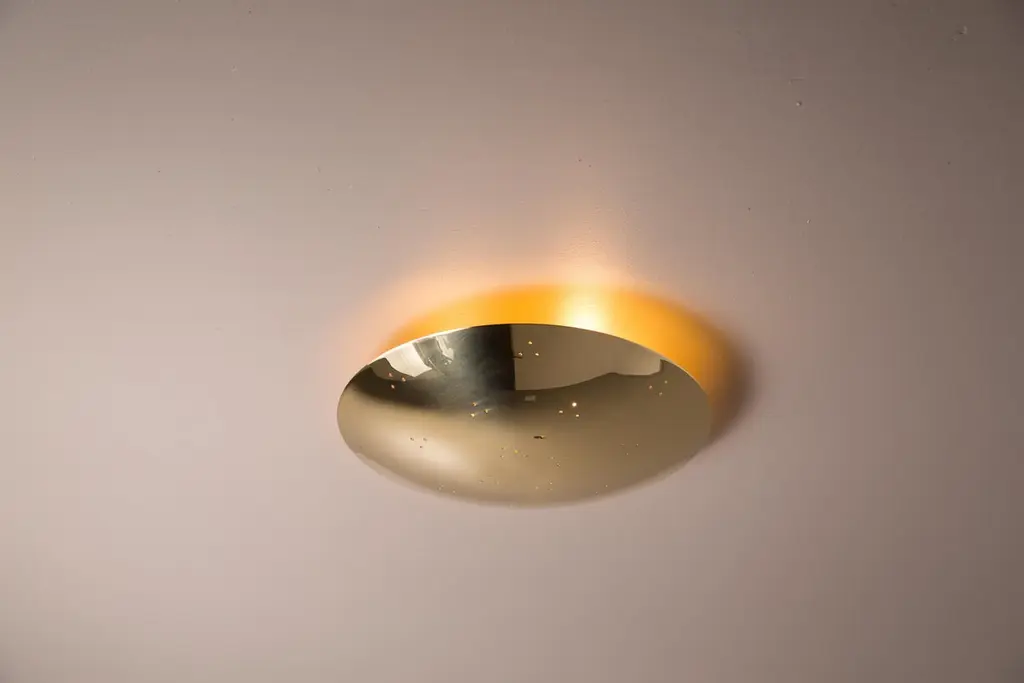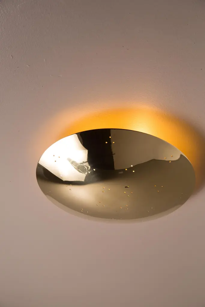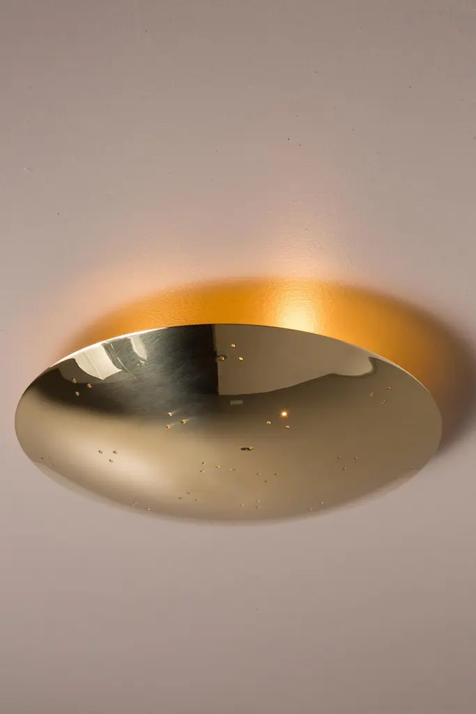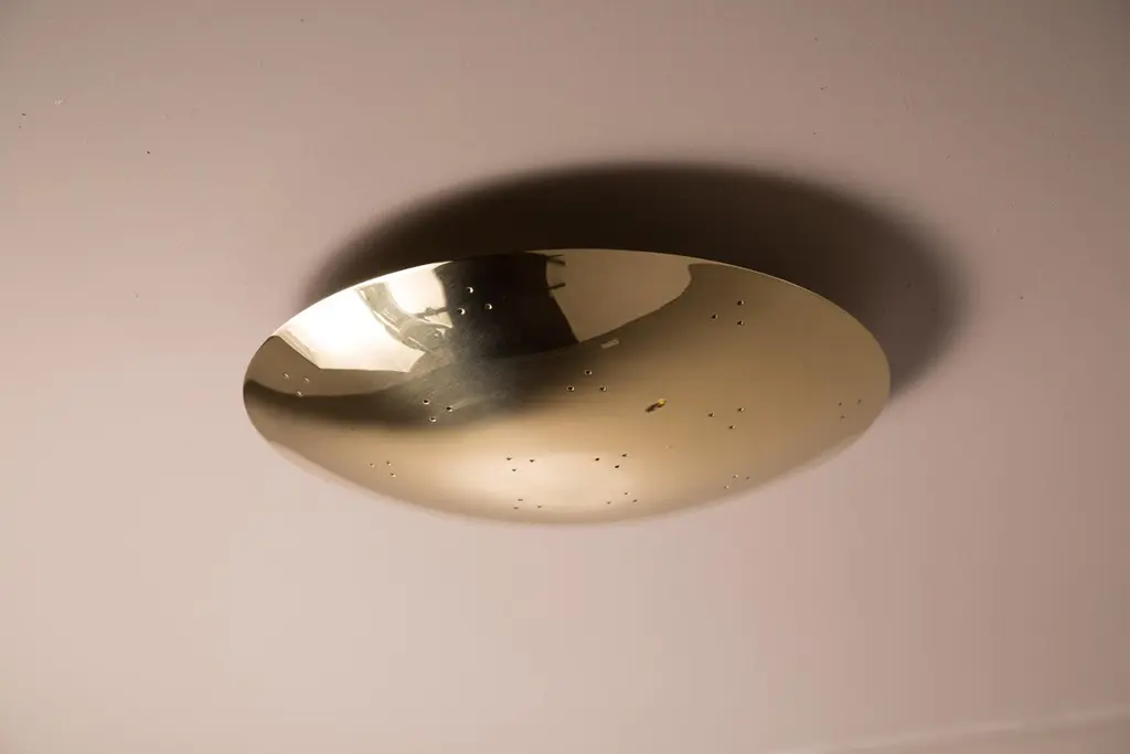 Raul Reyes 'Rey 14' Perforated brass dome ceiling lamp. Hand-fabricated in Los Angeles, these highly refined ceiling lamps are reminiscent of the iconic mid-century Finnish designs of Paavo Tynell and Lisa Johansson Pape. Executed in perforated polished brass with brass hardware.Price is per item. Available in unlimited quantities. Custom sizes available (any diameter from 12" to 34" in 2-inch increments). Also available as a chandelier (with 16" standard drop, customizable) and in polished brass, patinated brass, white, or black variants. Prices vary. This listing is for the 14" flush mount in polished brass.Accommodates 2x maximum 60W equivalent E12 candelabra base LED bulbs (LED only). Dimmable according to bulbs and UL listed.1 lamp in stock. Out of stock lead time can take 4-6 weeks or more. Please note that in-stock availability can change at any time. For time-sensitive orders, kindly inquire prior to purchasing.Please note only one representative example is featured in the photos. This lamp is fabricated in raw and unlacquered brass that will naturally patinate over time and can already show varied signs of patination through exposure to the elements, handling, storage, etc., which may result in variation and irregularities. Patination is a dynamic process which evolves in beautifully unpredictable ways to create a unique look with its own special characteristics. Additionally, the hand crafted perforation layout of each lamp can show variation including in the number of holes present and is also dependent upon the diameter of the lamp itself.Made to order. All sales are final.