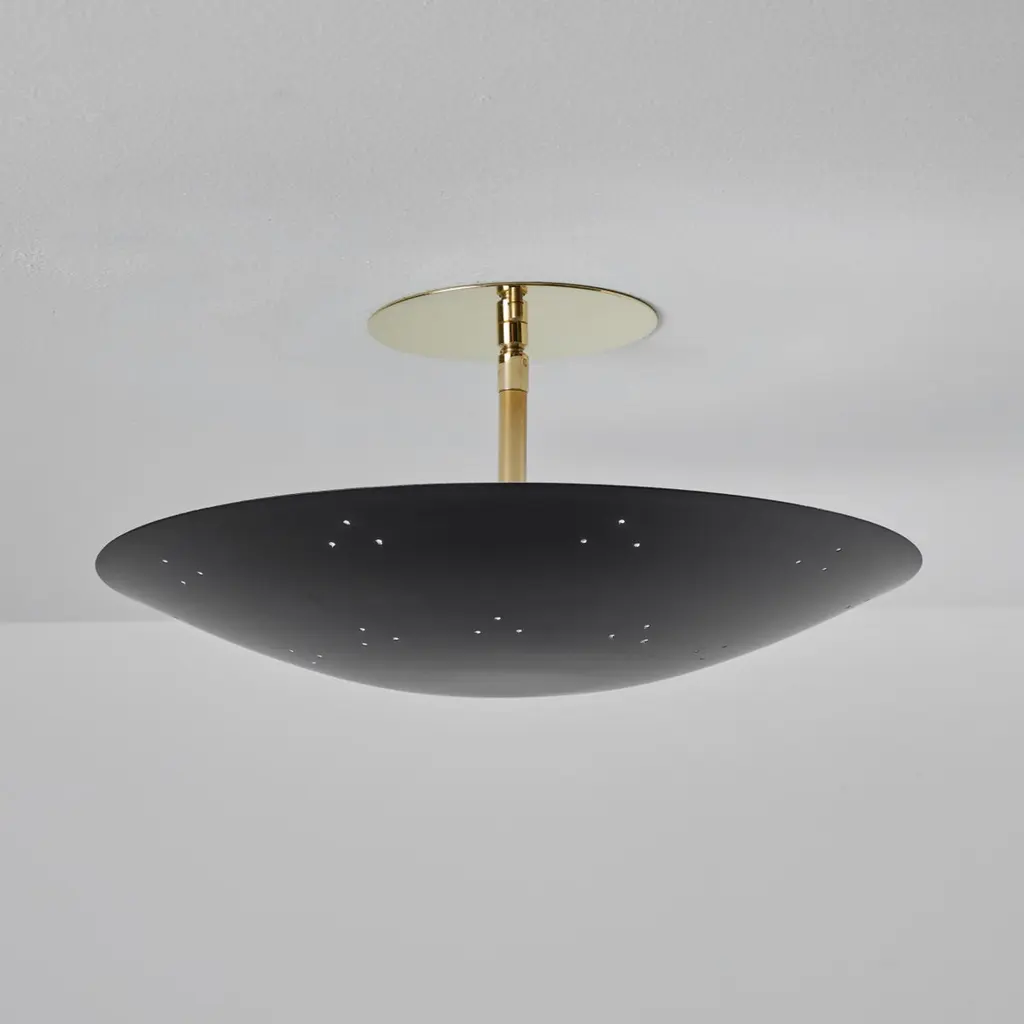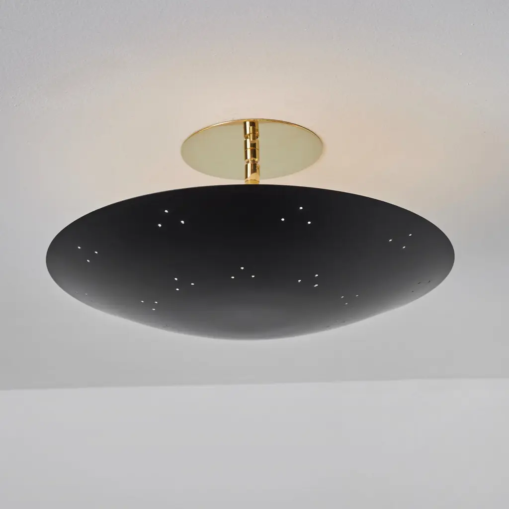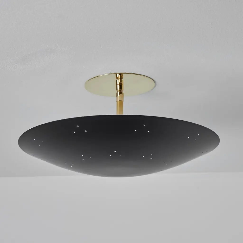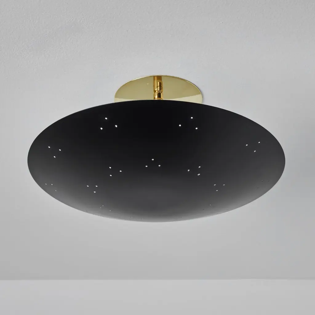 Raul Reyes 'Rey 14' Perforated Metal Dome Ceiling Lamp in Black.Hand-fabricated in Los Angeles, these highly refined ceiling lamps are reminiscent of the iconic mid-century Finnish designs of Paavo Tynell and Lisa Johansson Pape. Executed in black painted metal with brass hardware.Price is per item. Available in unlimited quantities. Custom sizes available (any diameter from 12" to 34" in 2-inch increments). Also available as a chandelier (with 16" standard drop, customizable) and in polished brass, patinated brass, white, or black variants. Prices vary. This listing is for the 14" flush mount in black.Accommodates 2x maximum 60W equivalent E12 candelabra base LED bulbs (LED only). Dimmable according to bulbs and UL listed. 1 lamp in stock. Out of stock lead time can take 4-6 weeks or more. Please note that in-stock availability can change at any time. For time-sensitive orders, kindly inquire prior to purchasing.Please note only one representative example is featured in the photos. The hand crafted perforation layout of each lamp can show variation including in the number of holes present and is also dependent upon the diameter of the lamp itself.Made to order. All sales are final.