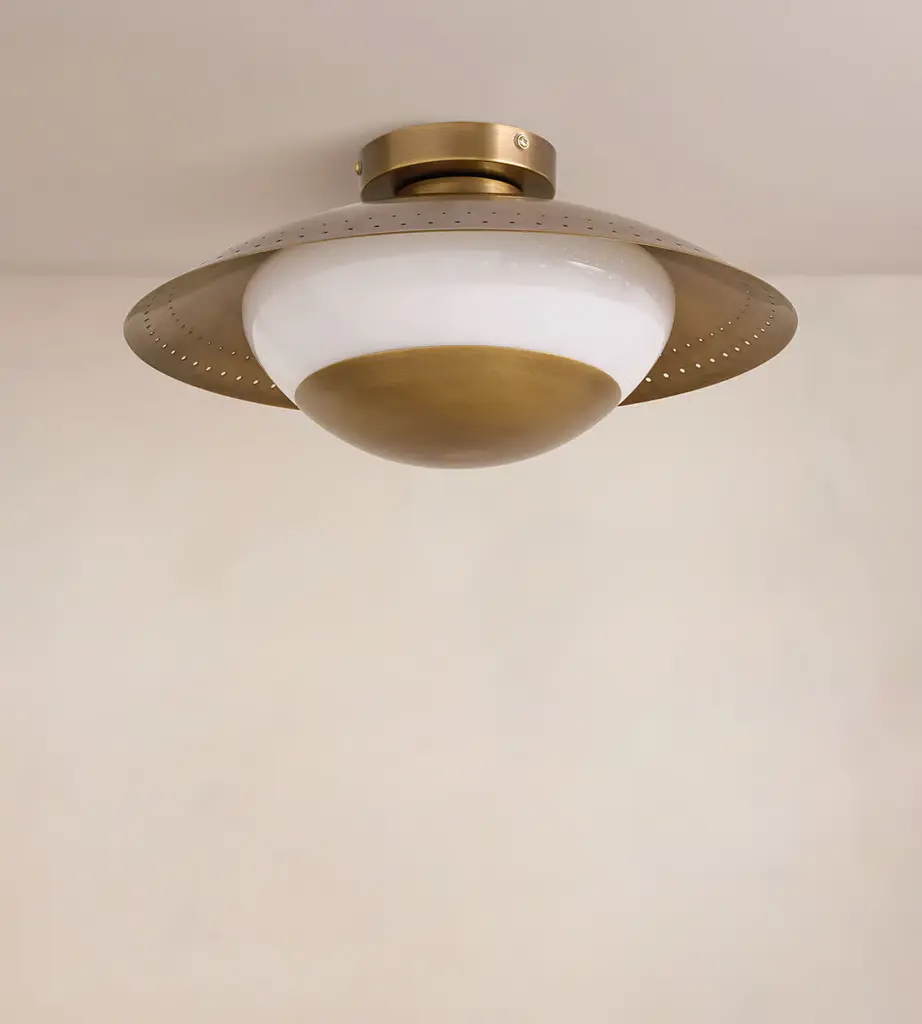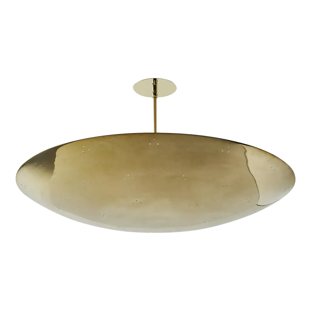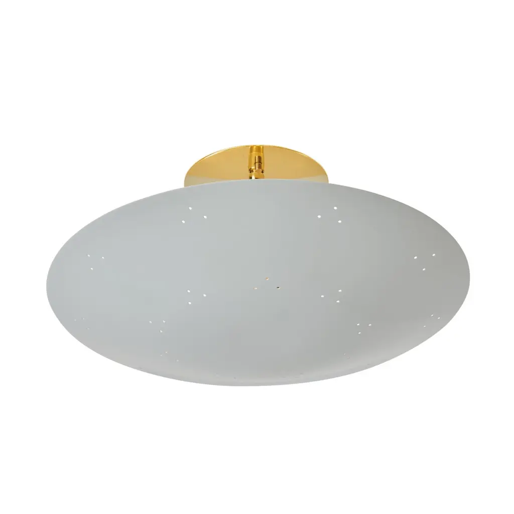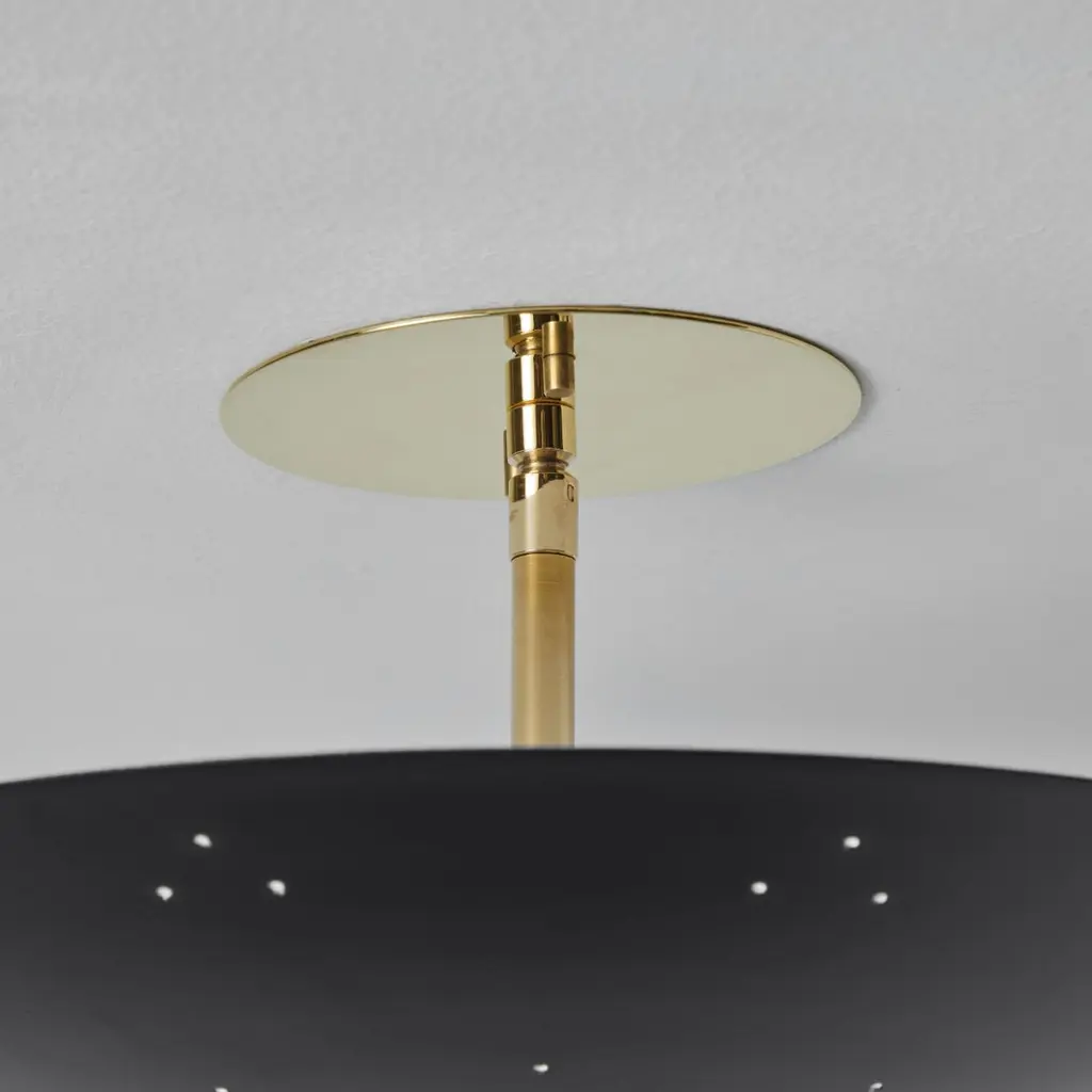 Raul Reyes 'Rey 14' Perforated Metal Dome Ceiling Lamp in Black.Hand-fabricated in Los Angeles, these highly refined ceiling lamps are reminiscent of the iconic mid-century Finnish designs of Paavo Tynell and Lisa Johansson Pape. Executed in black painted metal with brass hardware.Price is per item. Available in unlimited quantities. Custom sizes available (any diameter from 12" to 34" in 2-inch increments). Also available as a chandelier (with 16" standard drop, customizable) and in polished brass, patinated brass, white, or black variants. Prices vary. This listing is for the 14" flush mount in black.Accommodates 2x maximum 60W equivalent E12 candelabra base LED bulbs (LED only). Dimmable according to bulbs and UL listed. 1 lamp in stock. Out of stock lead time can take 4-6 weeks or more. Please note that in-stock availability can change at any time. For time-sensitive orders, kindly inquire prior to purchasing.Please note only one representative example is featured in the photos. The hand crafted perforation layout of each lamp can show variation including in the number of holes present and is also dependent upon the diameter of the lamp itself.Made to order. All sales are final.