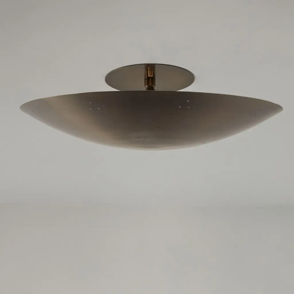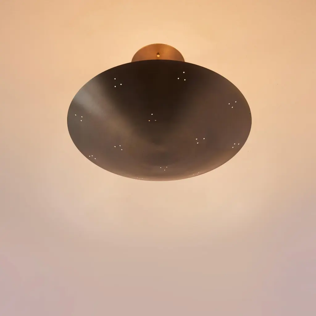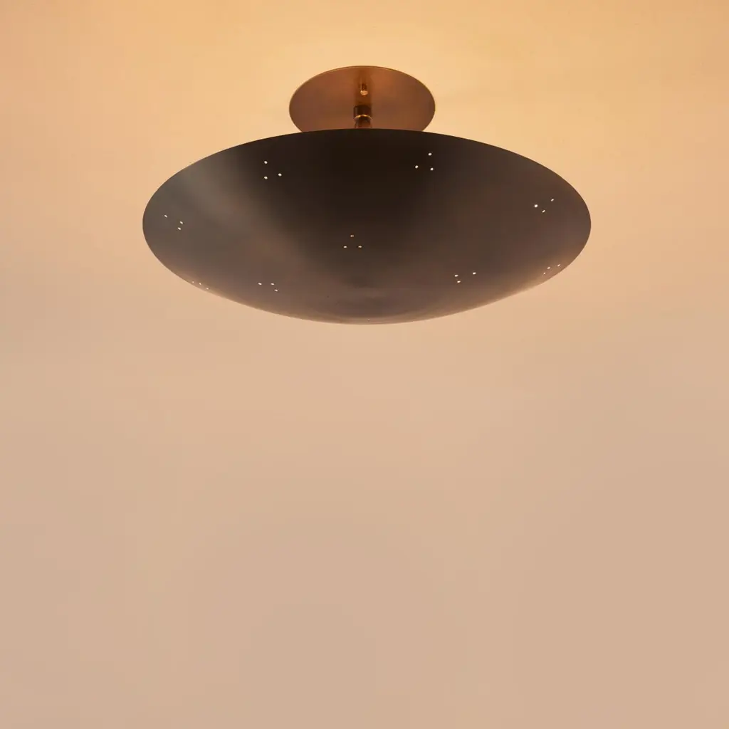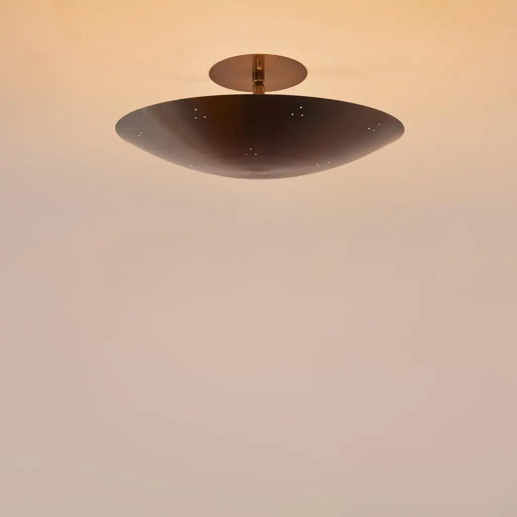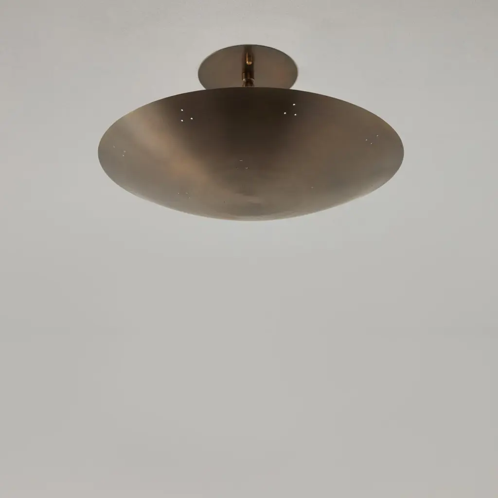 Raul Reyes 'Rey 14' Perforated Patinated Brass Dome Ceiling Lamp.Hand-fabricated in Los Angeles, these highly refined ceiling lamps are reminiscent of the iconic mid-century Finnish designs of Paavo Tynell and Lisa Johansson Pape. Executed in perforated patinated brass with brass hardware.Price is per item. Available in unlimited quantities. Custom sizes available (any diameter from 12" to 34" in 2-inch increments). Also available as a chandelier (with 16" standard drop, customizable) and in polished brass, patinated brass, white, or black variants. Prices vary. This listing is for the 14" flush mount in patinated brass. Accommodates 2x maximum 60W equivalent E12 candelabra base LED bulbs (LED only). Dimmable according to bulbs and UL listed.1 lamp in stock. Out of stock lead time can take 4-6 weeks or more. For time-sensitive orders, kindly inquire prior to purchasing.Please note that the chemical process used for the patinated brass variant can result in unique variation from piece to piece including differing hues, streaking, spotting, discoloration, patchiness and other irregularities outside and inside the dome. Patinas can also change over time due to handling, storage, and exposure to the elements, resulting in further variation and irregularities. Patination is a dynamic process which evolves in beautifully unpredictable ways to create a unique look with its own special characteristics. Additionally, the hand crafted perforation layout of each lamp can show variation including in the number of holes present and is also dependent upon the diameter of the lamp itself.Made to order. All sales are final.