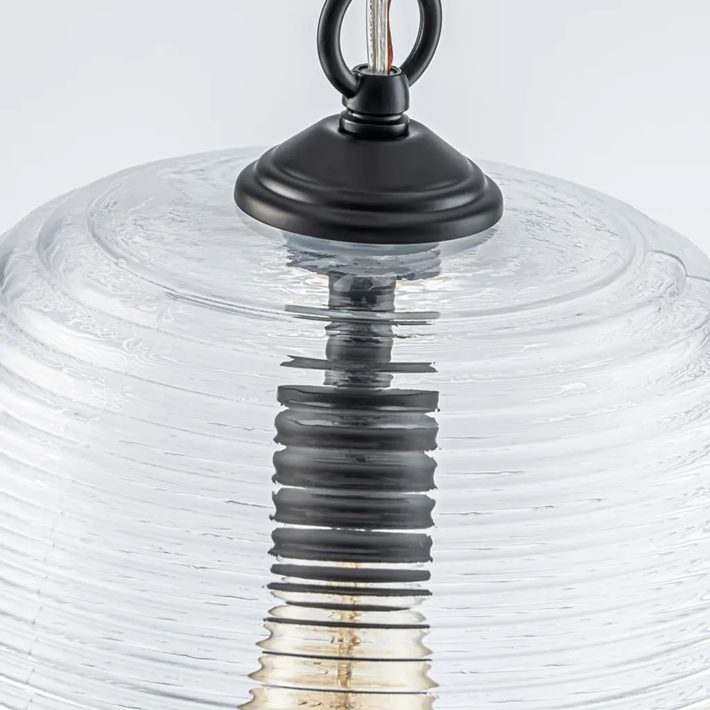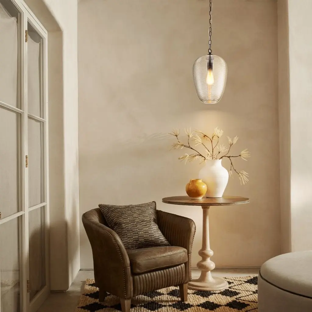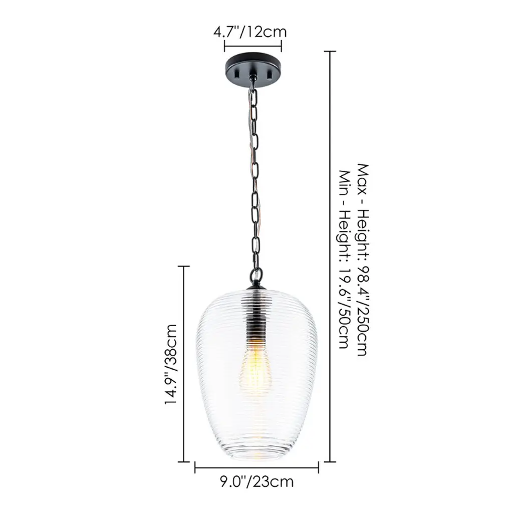 Elevate your space with this cocoon-shaped pendant light, featuring textured glass and horizontal ribbing for a unique, organic look. The hand-blown translucent shade diffuses light beautifully, creating a warm, glare-free ambiance ideal for dining rooms, bedrooms, or reading nooks. Its Scandinavian-inspired silhouette blends minimalist elegance with artistic flair, making it a striking focal point in modern or boho interiors. Crafted for both form and function, it offers soft, ambient lighting while saving space. Compatible with a 60W E26 bulb (not included) and dimmable for personalized brightness. Easy to install with included hardware, this pendant brings a serene, stylish glow to any room.