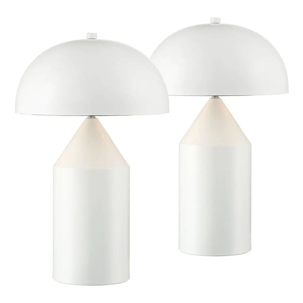 PRODUCT DETAILS: Set of 2 lamps. Each is 19" high. Shades are 13 3/4" wide at the bottom x 5 1/2" high. Bottom bases are 6" wide. Weigh 9.9 lbs. Each lamp uses two maximum 60 watt standard-medium base bulbs. In-line on-off cord switch. Felix modern dome mushroom table lamps. Based on European and Italian lighting designs. From the 360 Lighting brand. White finish bases with a geometric profile. Metal construction. Mushroom, dome-shaped metal shades. 8-foot long clear cords. DESCRIPTION: Elegant, modern vibes make up the Felix white table lamps set of two with dome-shaped shades. From the 360 Lighting brand, the tapered metal bases showcase a beautiful white finish. Matching white dome-shaped shades complete the contemporary look.