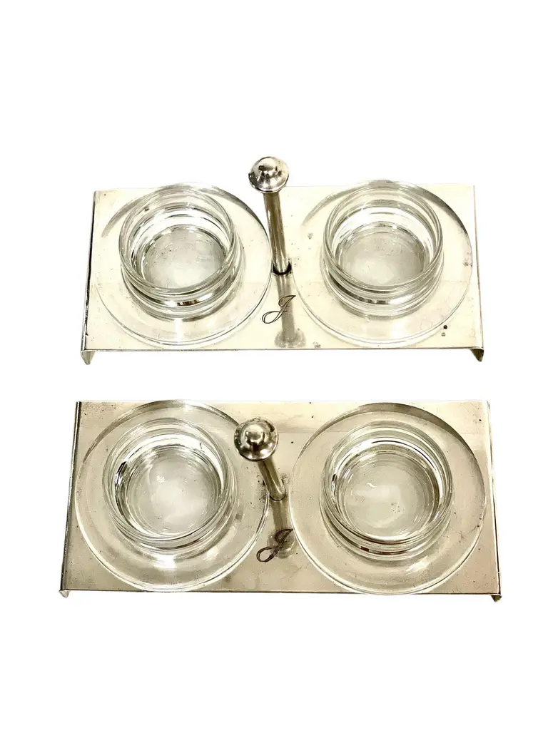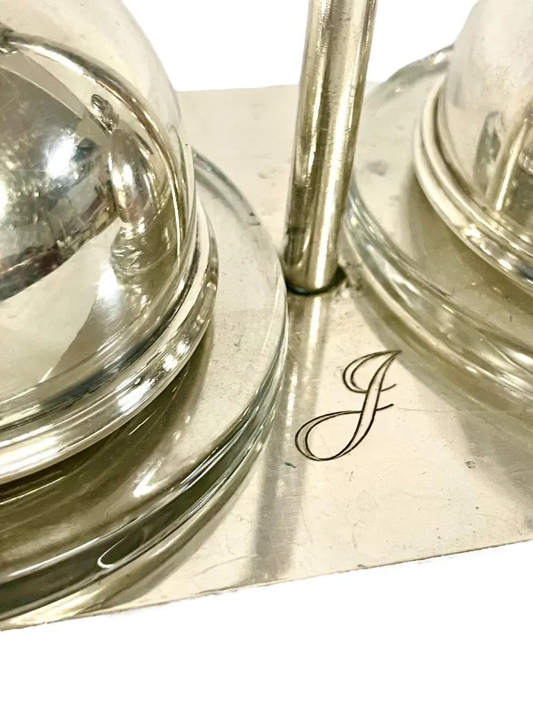 A rather stylish 1950s double butter dome, its silver-plated cloches mounted on a raised rectangular base, with central carrying handle. Each dome lifts off to reveal a (modern) glass dish, which makes the service extremely easy to clean. The set is engraved with a capital letter 'J', which can be attributed to its former life adorning the opulent breakfast tables of the Hotel 'Juana' in Juan Les Pins, near Antibes.Price is per item