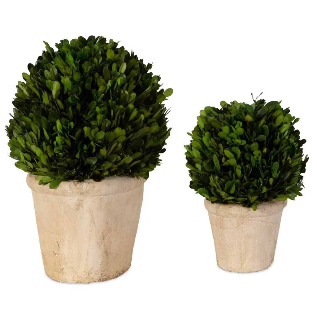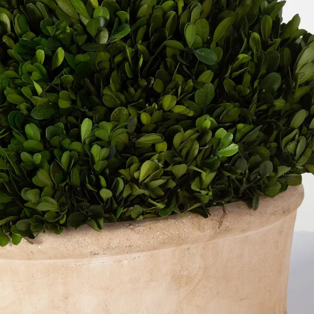 Uttermost Preserved Boxwood Oval Domes Set/2, 14×12×8 in & 10×8×6 in, Green Mossy Terracotta Indoor Planters Preserved while freshly picked, these natural evergreen boxwoods look and feel like living plants. Each planter is potted in a mossy, stone-finished terracotta container. This set includes two oval domes: a large planter measuring 14×12×8 in and a small planter measuring 10×8×6 in. Ideal for adding greenery to indoor spaces with minimal maintenance. Crafted from durable boxwood foam and terracotta, these planters require no watering. Perfect for home décor, offices, or gifting, they bring a touch of nature indoors without the upkeep. Key Features : Realistic Foliage: Lifelike preserved boxwood adds natural greenery indoors. Set of 2 Planters: Comes as a pair of oval domes in mossy stone-finished terracotta. Low Maintenance: No watering or sunlight required for hassle-free décor. Versatile Placement: Ideal for tables, shelves, or office spaces. Durable Materials: Long-lasting construction designed for indoor use.
