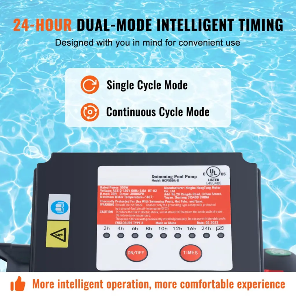 Sand Filter Pump for Above Ground Pools, 14-inch, 3000 GPH, 3/4 HP Swimming Pool Pumps System & Filters Combo Set with 6-Way Multi-Port Valve & Strainer Basket, for Domestic and Commercial Pools Description: Efficient Performance: Are you ready to enjoy your pool this summer? Our 3/4 HP sand filter pump provides a large water flow of up to 3000 gallons per hour, ensuring efficient water circulation speed. With the ability to cycle the entire pool in a short amount of time, you can enjoy a clean and secure swimming experience. Multi-function & Intelligent Timing: The sand pump has 6 different functions, including filter, rinse, backwash, waste, closed, and winter modes, providing you with various options to choose from. With its 24-hour dual-mode intelligent timing function (continuous and single cycle mode), the operation is easy and hassle-free. Easy to Maintain and Clean: Our sand filter pump system includes a filter basket to effectively filter out impurities, which can be easily detached and assembled for quick cleaning. With the transparent lid, you can visually observe the internal status for timely maintenance. It's important to note that we recommend using 20# sand for optimal performance. Durable Motor and Material: Our sand pool pump has a copper wire motor that features overload protection for long-lasting running and extended service life. It's built with reinforced thermoplastic housing, making it portable, corrosion-proof, and ideal for promoting clean water quality all day long. Meet All Your Pool Needs: pool sand pump is versatile and suitable for both domestic and commercial pools, including courtyard pools, community pools, small water parks, and above-ground pools. The complete set includes a pool pump, sand filter, 6-way multi-port valve, and other necessary accessories for your convenience. Package Content: 1 x Pool Pump 1 x Sand Filter