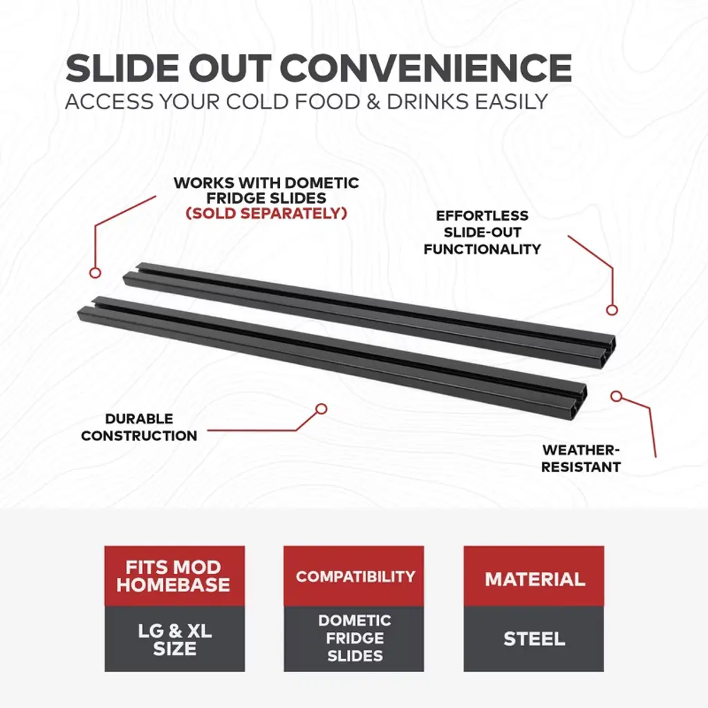 Transform your outdoor chilling experience with the seamless integration of the Dometic Fridge Slides into the MOD HomeBase system (both sold separately) using the Yakima MOD Fridge Slide Mounting Bracket Kit. Ideal for camping trips, backyard barbecues, or tailgate parties, this slide kit brings everything within easy reach. Crafted for adventurers and outdoor enthusiasts alike, this innovative kit transforms your MOD HomeBase LG or XL into a well-organized oasis for all things chilled. Designed to work harmoniously with the Dometic Fridge Slides (sold separately), this travel essential ensures that your cold food and beverages are always accessible, whether you're lounging by the campfire or hosting a backyard bash. Plus, with the option to pair this camping accessory next to a Topper, you can optimize your space and keep your setup sleek and stylish. But it's not just about convenience, this bracket kit is also about quality and durability. This fridge slide kit is built to withstand the rigors of outdoor life, so you can count on it to hold up trip after trip, season after season, and with dimensions of 31.5 x 2 x 0.5, it's perfectly sized to fit your MOD HomeBase without sacrificing precious space. Integrate the Dometic Fridge Slides (sold separately) to the MOD HomeBase to create an easier way to access your cold food and beverages using the Yakima MOD Fridge Slide Mounting Bracket Kit.