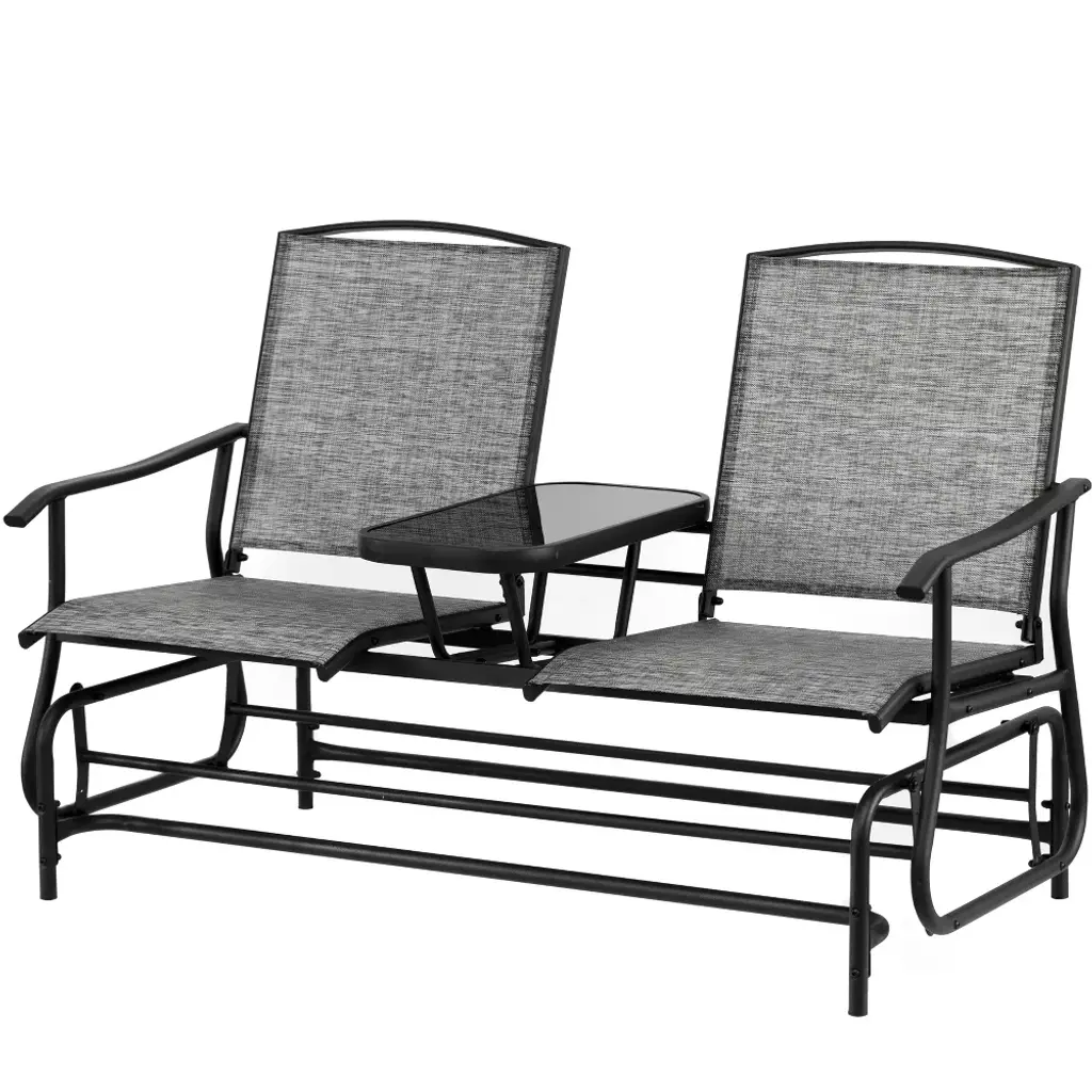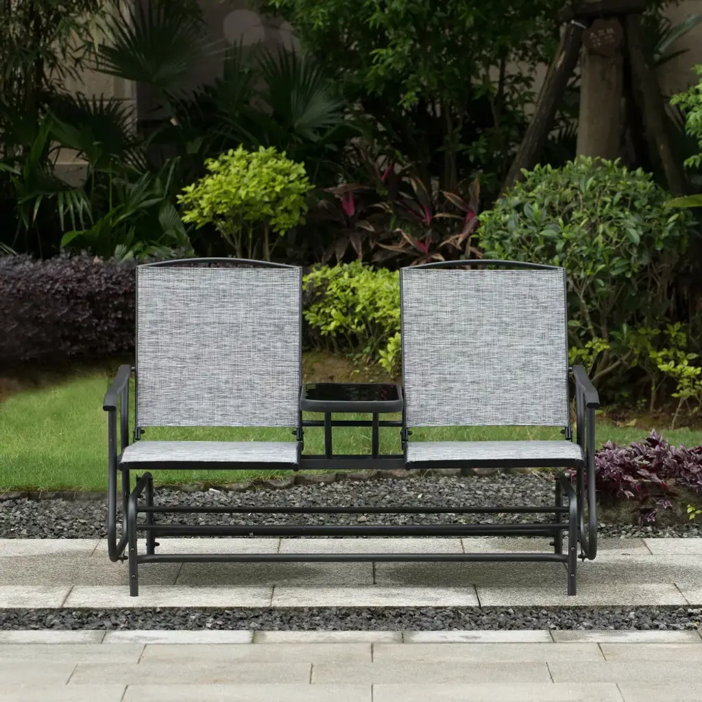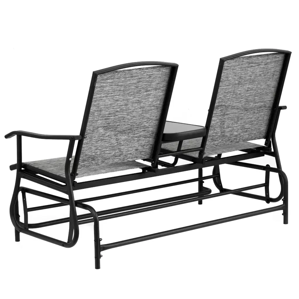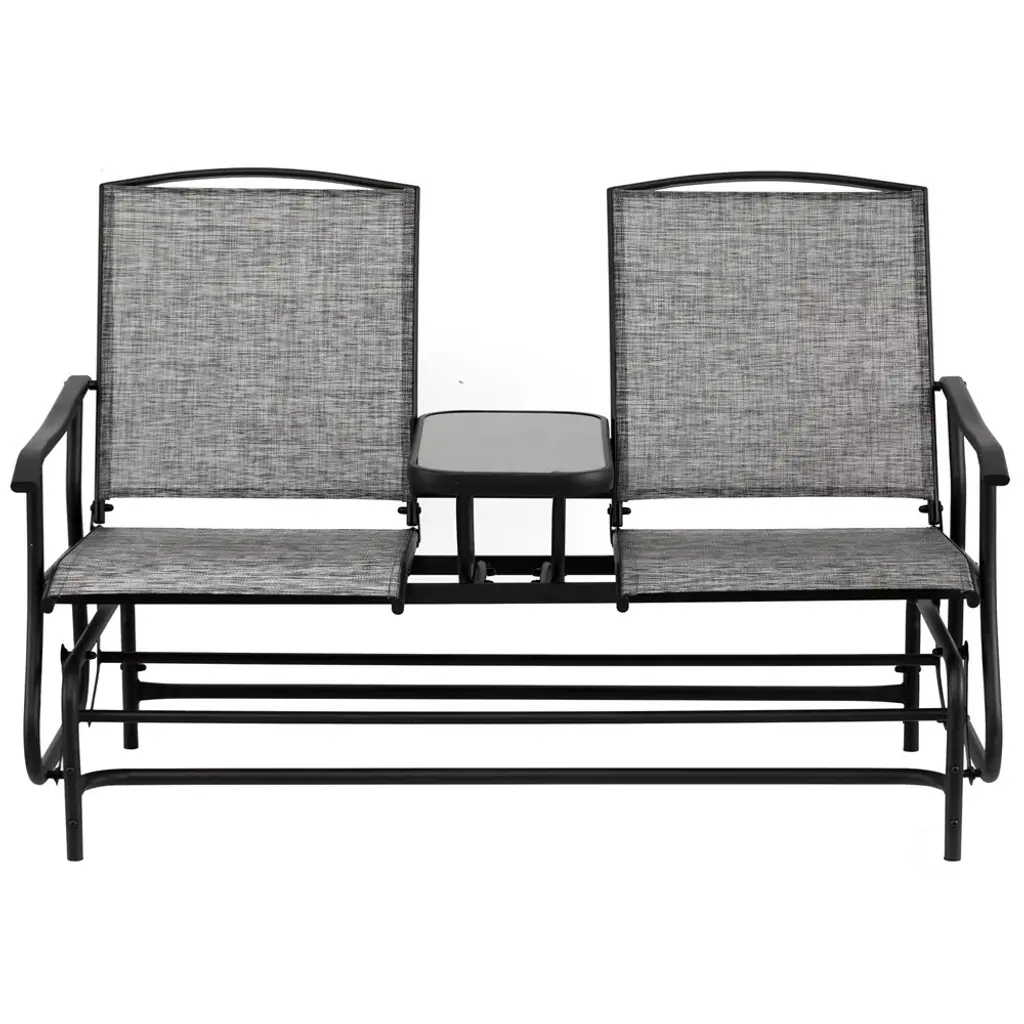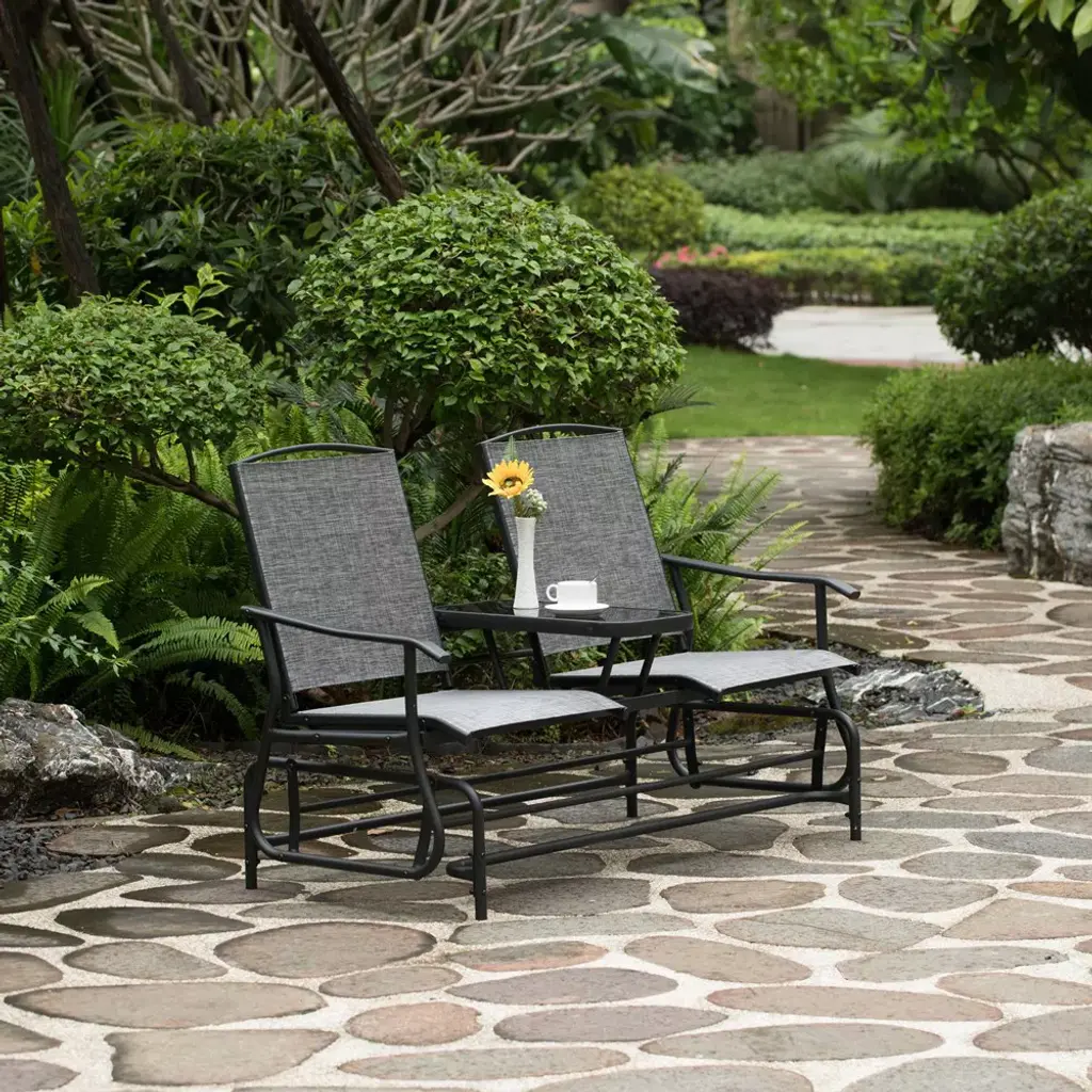 This two person glider chair with good weight capacity of 880 lbs will give you the most comfortable rocking experience, and add color to your outdoor living space. The tabletop in the middle of the seat is made of tempered glass, which is beautiful and can be used to put food and drinks. The armrests on each side of chair are ergonomically designed to relax your arms and hands. This model seats two so invite a friend over for a double fun day in the sun.