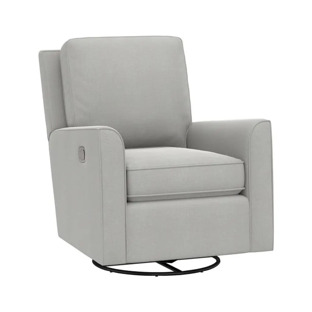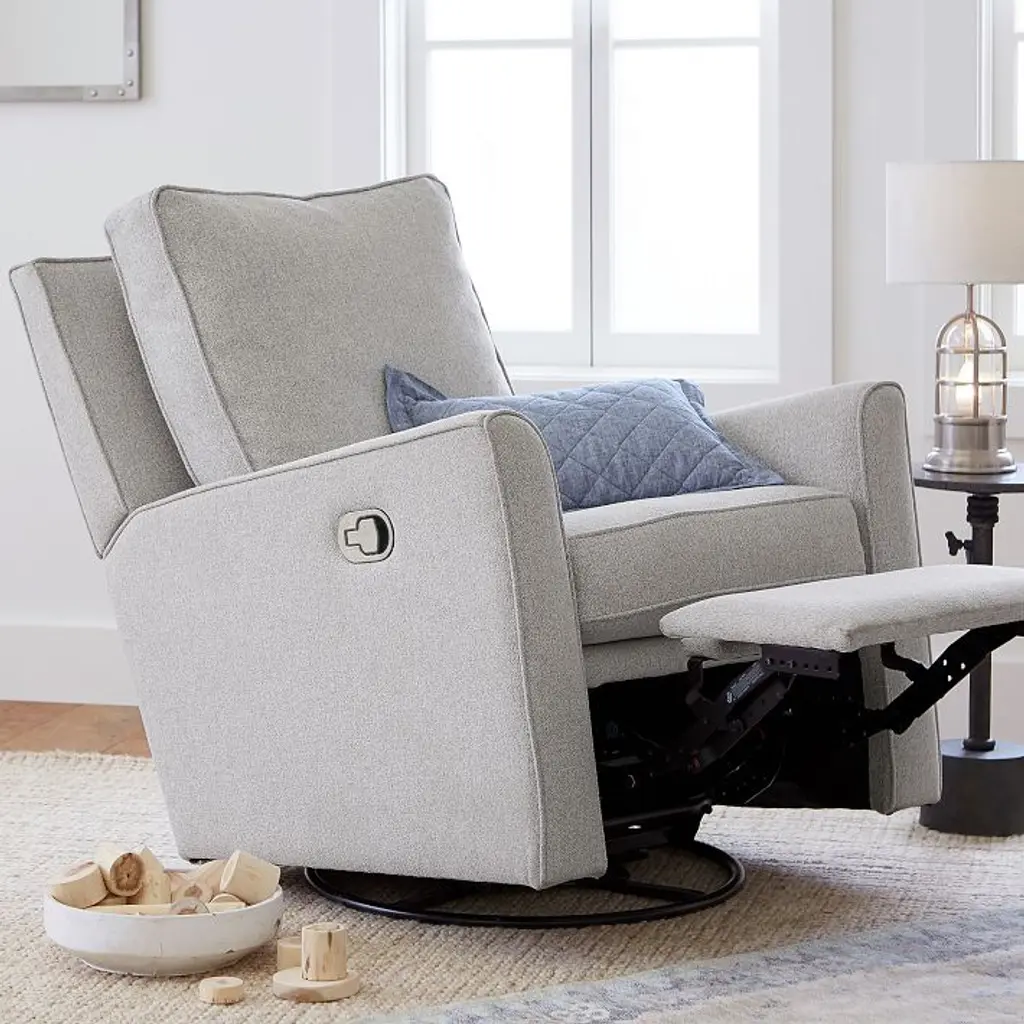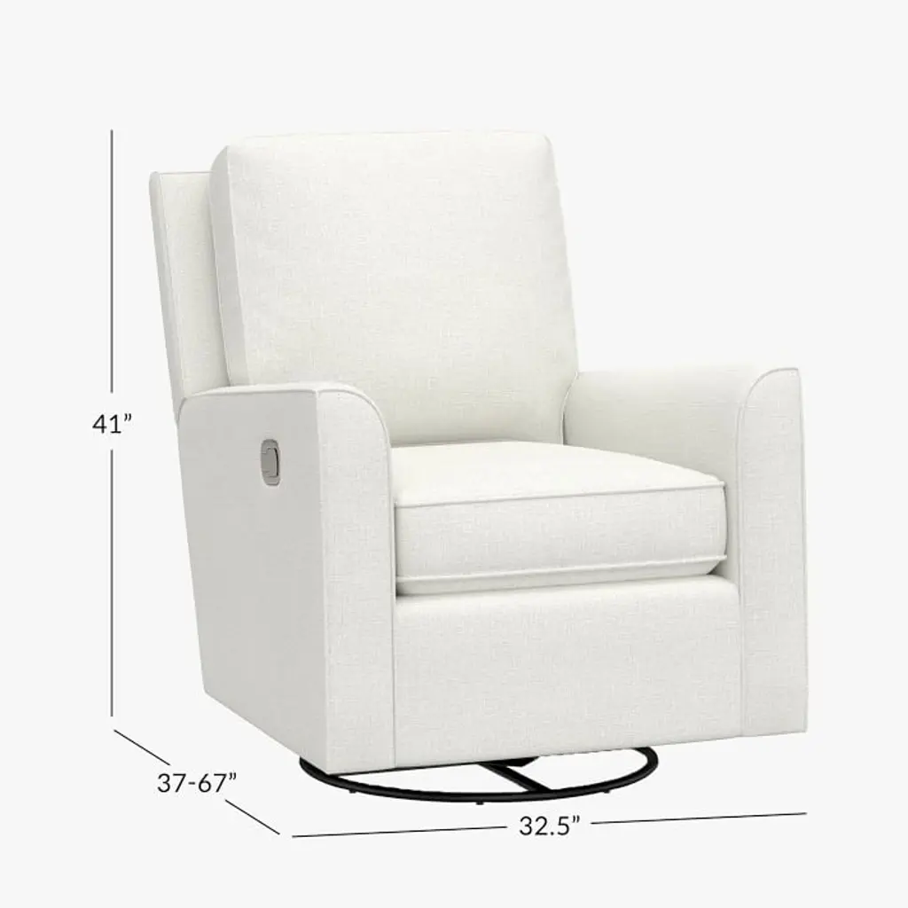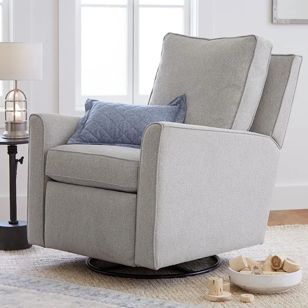 Brought to you in collaboration with Pottery Barn Kids. Kiln-dried solid and engineered hardwood frame. Foam cushions and polyester padding with down wrap. No-sag steel sinuous spring seat support. Loose seat cushion, fixed back cushion. Metal base reclines, glides and swivels (360 degrees). Manual recline with 3 positions: fully reclined, partly reclined and fully upright. GREENGUARD Gold Certified. This low-emitting product has been screened for over 10,000 chemicals and VOCs. Made in China.