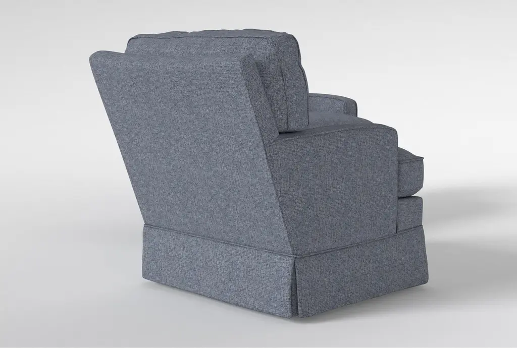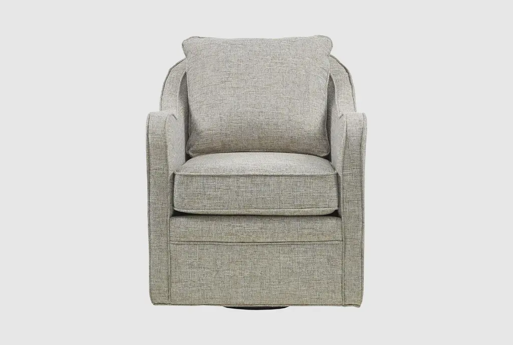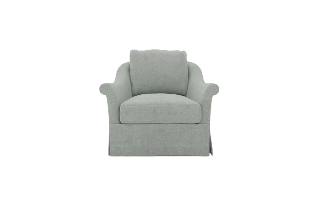 Enjoy classic style and comfort while you unwind in our Bailey track arm skirted swivel glider. The timeless design features track arms and a skirted base that bring fresh traditional flair to this chair. In addition to moving front to back, it swivels around so you can reach the perfect position for relaxation. Through our Special Order program, you can customize the fabric at no extra cost.