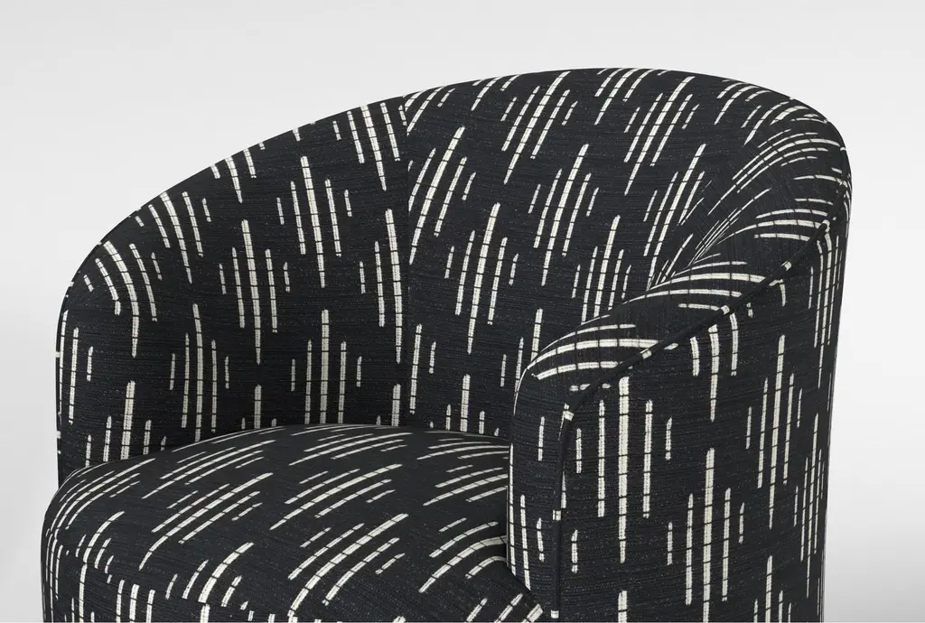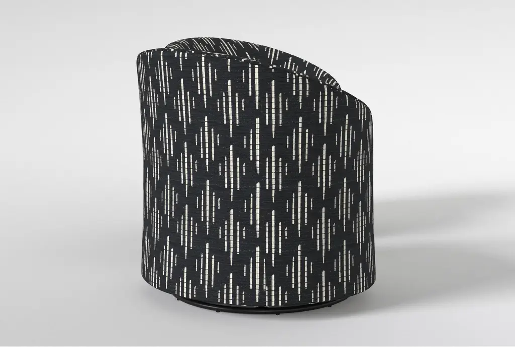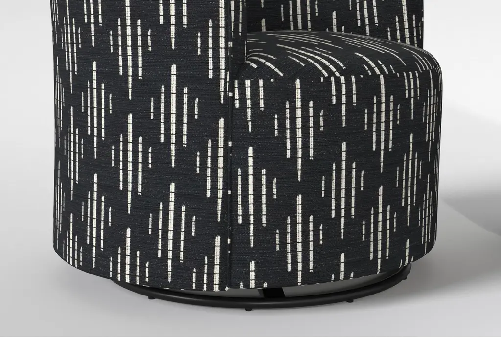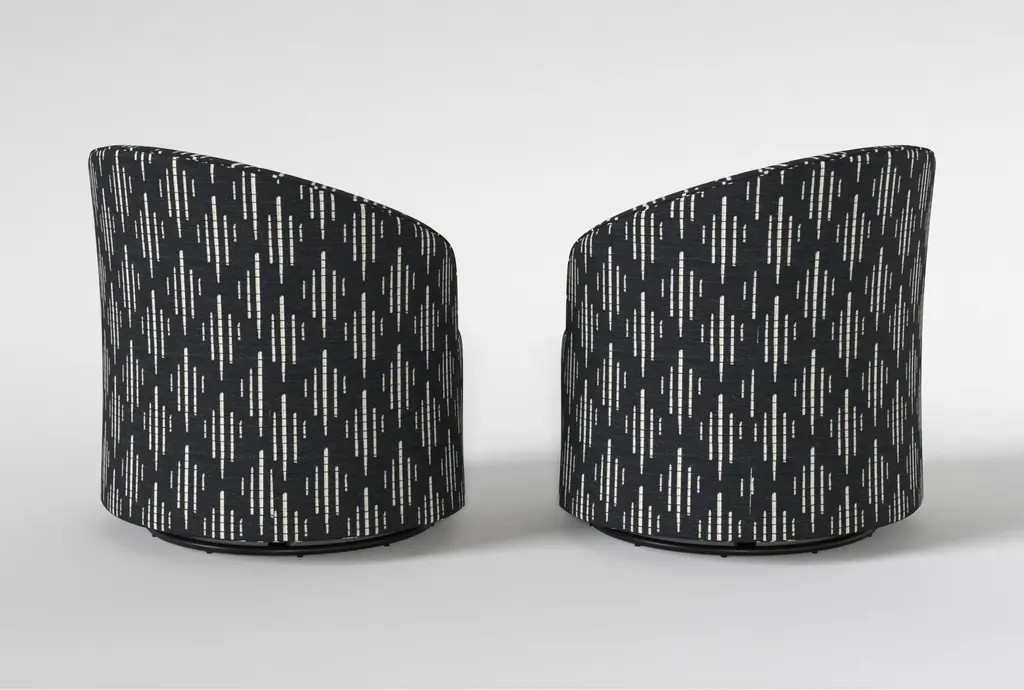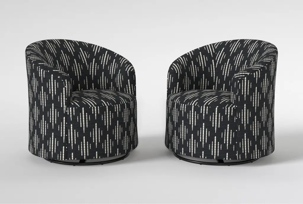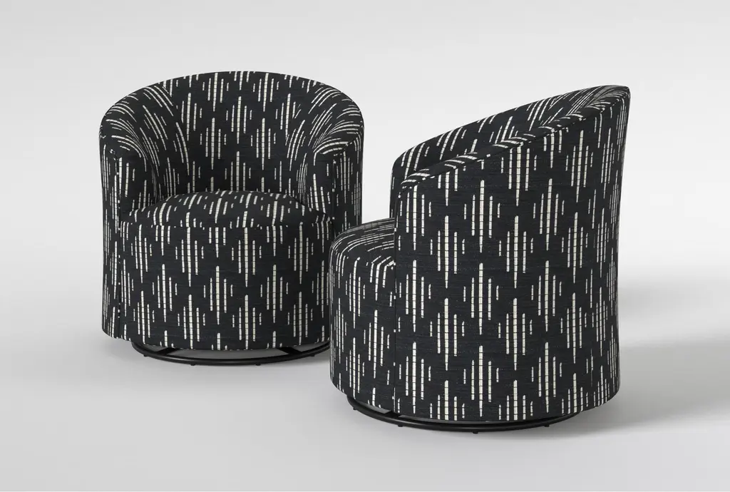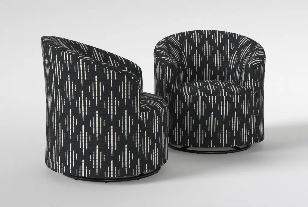 Introducing the Kestrel Black Fabric Swivel Barrel Glider Accent Arm Chair Set of 2, perfect for adding a modern touch to your living room. These chairs feature a sleek, round shape and are upholstered in a striking black patterned fabric. Designed for comfort and style, they offer a firm seating experience with a tight back and curved silhouette.