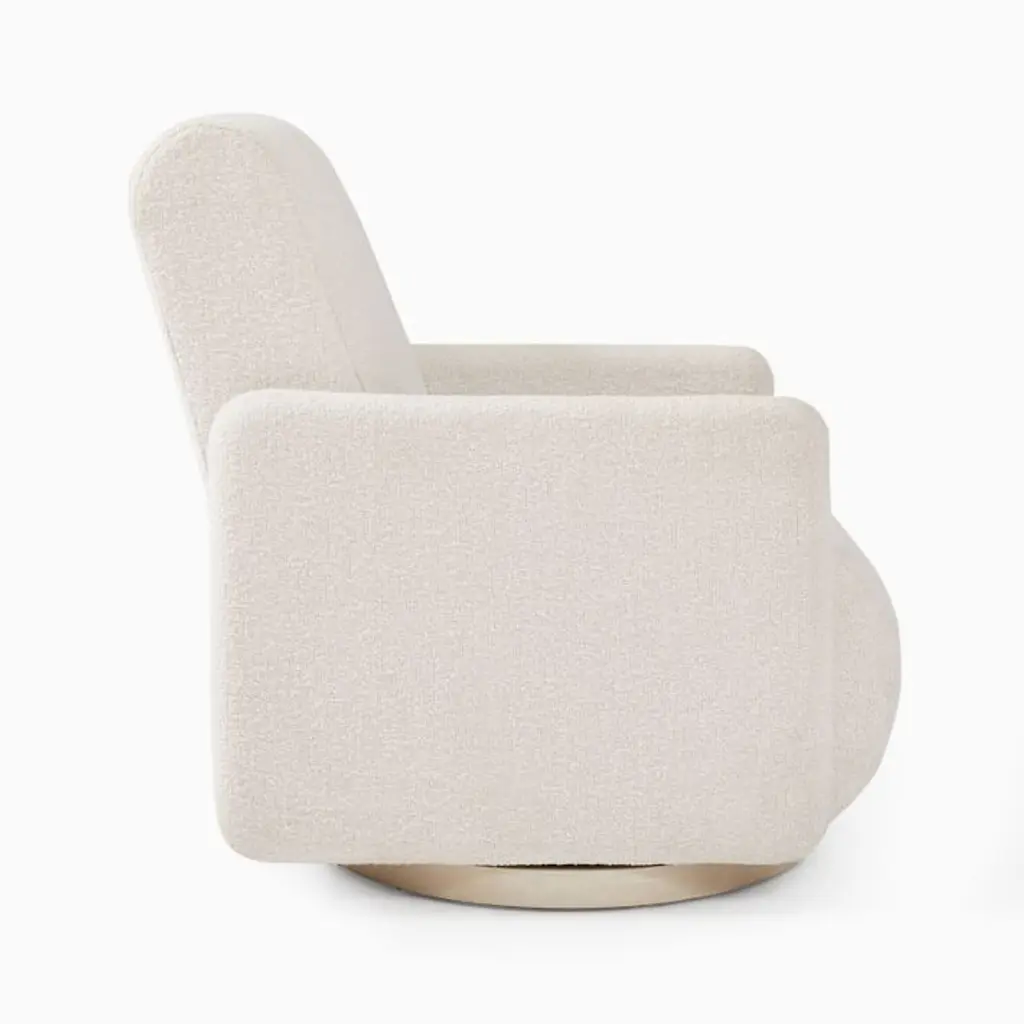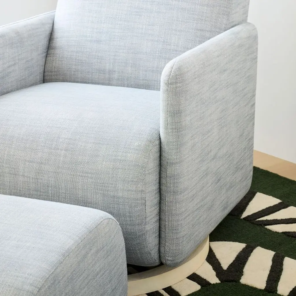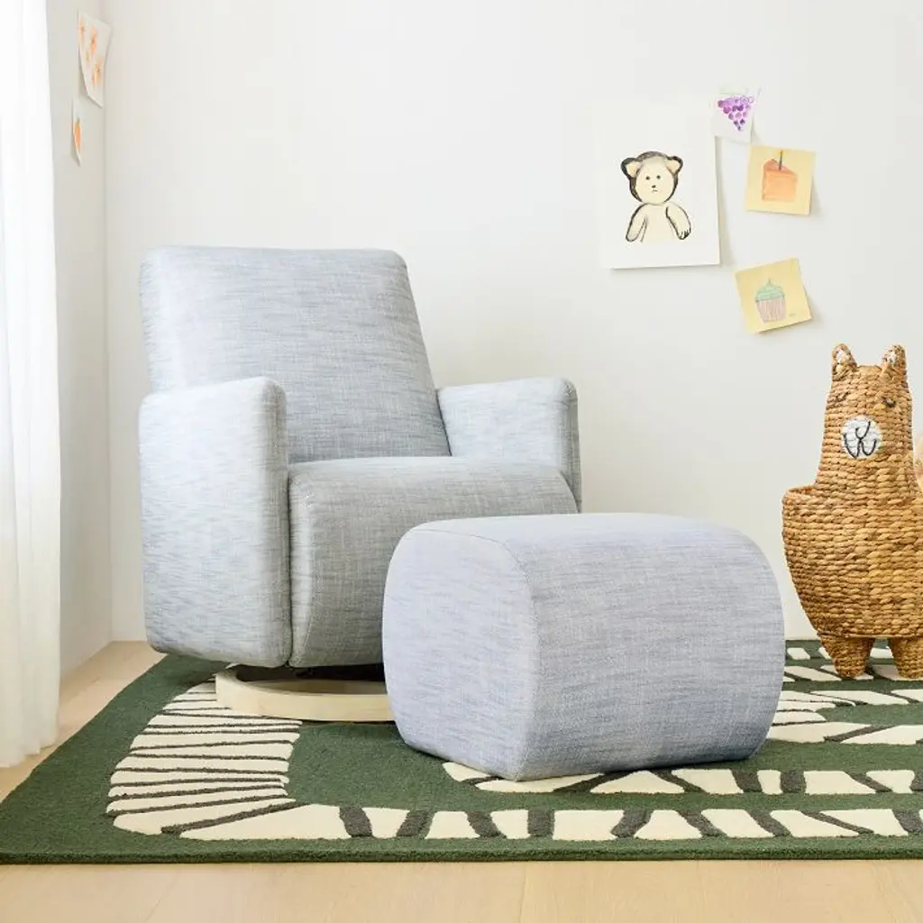 Created in collaboration with Sarah Sherman Samuel, a multidisciplinary designer specializing in interiors, and Pottery Barn Kids. Kiln-dried solid and engineered wood frame. Fully upholstered on all sides in your choice of fabric. Foam cushion and polyester padding. No-sag steel sinuous spring seat support. Webbed back support. Glides and swivels; does not recline. Pairs with Sarah Sherman Samuel Glider Ottoman (sold separately). Hand assembled with hand-finished upholstery. GREENGUARD Gold Certified. This low-emitting product has been screened for over 10,000 chemicals and VOCs. Rigorously tested to meet or exceed all required and voluntary safety standards. Made in China.
