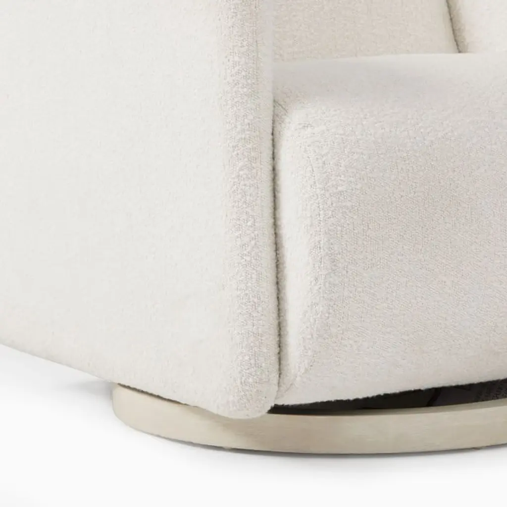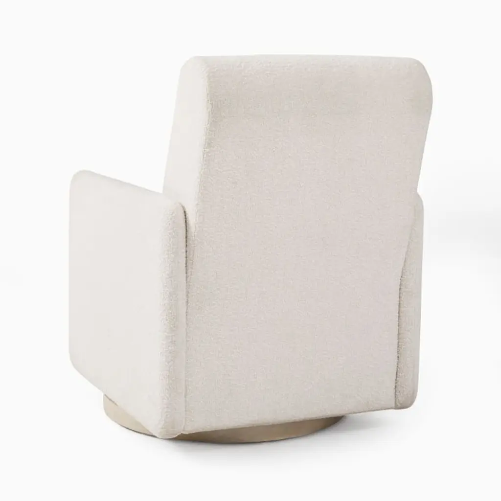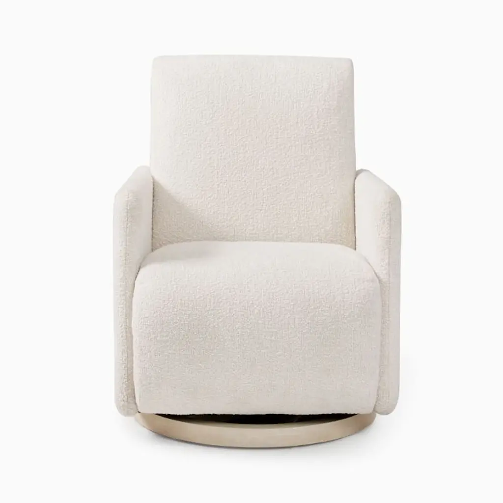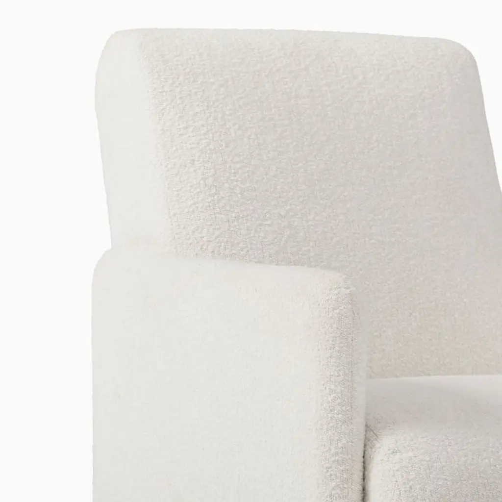 Created in collaboration with Sarah Sherman Samuel, a multidisciplinary designer specializing in interiors, and Pottery Barn Kids. Kiln-dried solid and engineered wood frame. Fully upholstered on all sides in your choice of fabric. Foam cushion and polyester padding. No-sag steel sinuous spring seat support. Webbed back support. Glides and swivels; does not recline. Pairs with Sarah Sherman Samuel Glider Ottoman (sold separately). Hand assembled with hand-finished upholstery. GREENGUARD Gold Certified. This low-emitting product has been screened for over 10,000 chemicals and VOCs. Rigorously tested to meet or exceed all required and voluntary safety standards. Made in China.