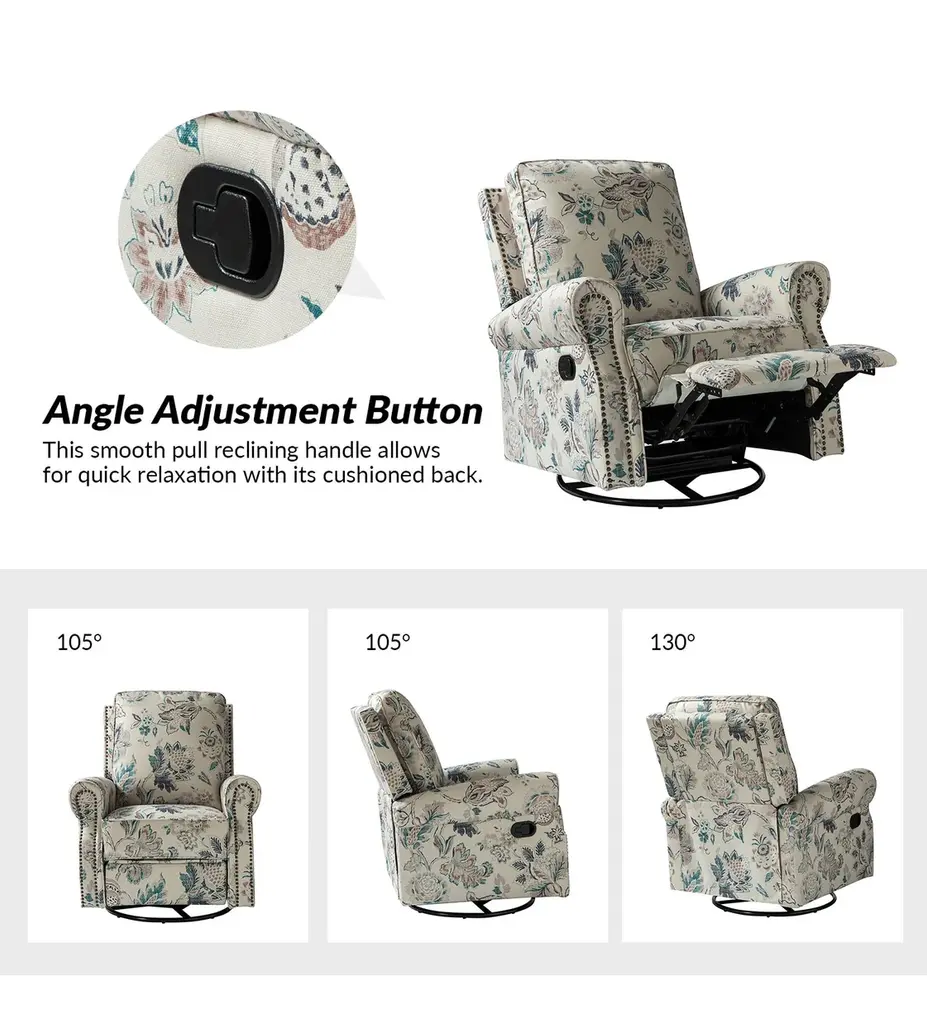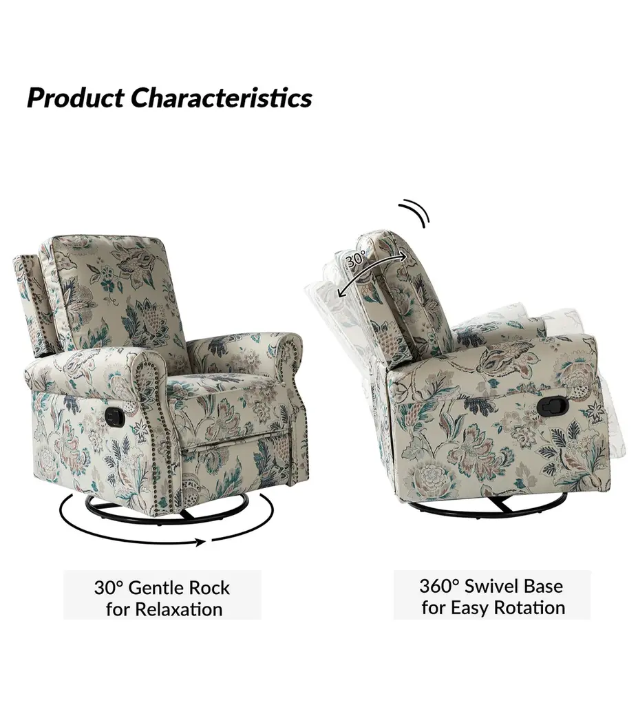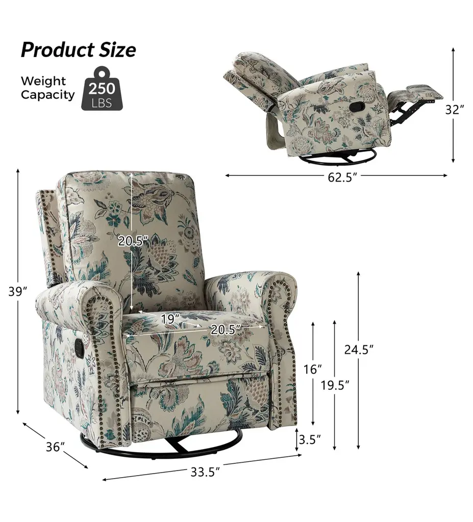 Crafted with human needs in mind, this recliner set features 360 swivel motion, a gliding function, and pop-up leg rest to provide comfort for resting. Ideal for discovering the perfect position that is most comfortable for you, this recliner set will quickly become your new favorite seat in the house. Constructed of soft and durable polyester fabric decorated with chic nail head trims, it offers a timeless design and can be used well for years. This recliner set can be used on many occasions, such as you can sit on it in the living room to enjoy watching TV or you can put it in your study room to enjoy reading books.Product Including: One recliners, assembly required.Relaxation and Comfort: With cozy backrest support, multiple reclining positions, 360�� swivel, and smooth gliding motion, this recliner set is designed to provide full comfort to your body.Strong build: This recliner set has a solid metal base that easily supports swivel rotation and gliding capabilities. It is covered with an easy-to-clean durable polyester fabric with foam filling.Easy Push Design: Use the easy-to-reach lever to control the footrest. Simply push back against the backrest for a comfortable recline.Safety Reminder: Due to the design of the process, all recliners will have a small gap between the left and right sides of the back and the seat cushion. For safety reasons, please pay special attention to the use of children at home to prevent pinching.Product DetailsWeight Capacity: 250lbsLevel of Assembly: Partial AssemblyFrame Material: Manufactured Wood and metalSeat Fill Material: FoamWeights and DimensionsItem Size: 33.5"Wx36"Dx39"HSeat Size: 20.5"Wx19"Dx19.5"HBack height to seat:20.5Item weight: 93.5SpecificationsUpholstered: YesArms Included: YesPillows Included: NoInstructions:Because the size of the product is measured manually, there may be errors.Country of Origin: China