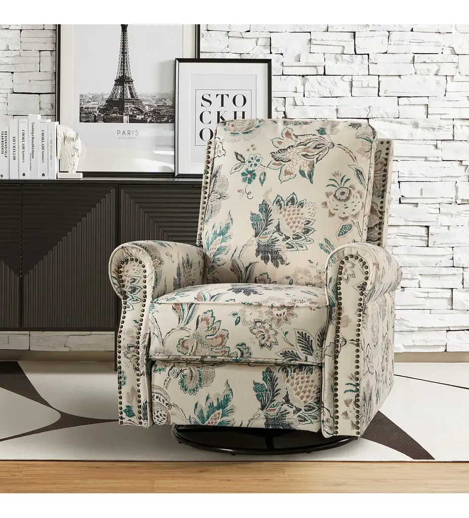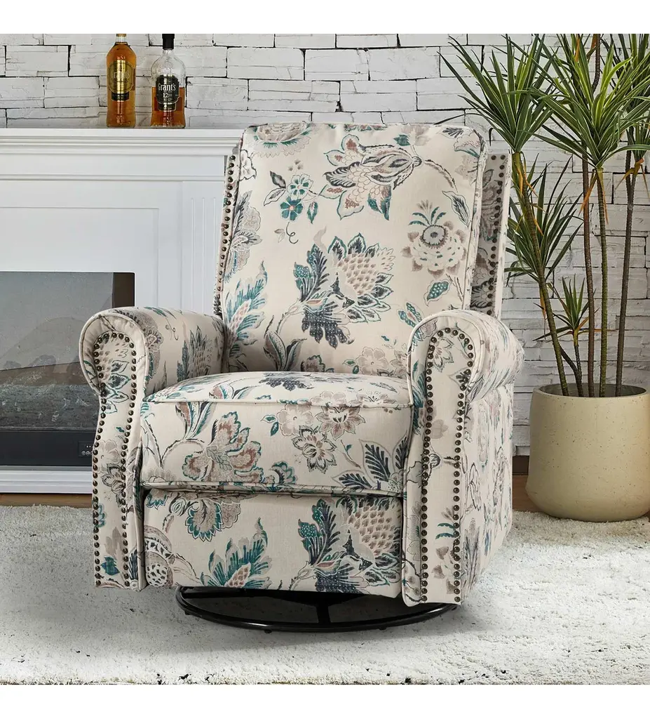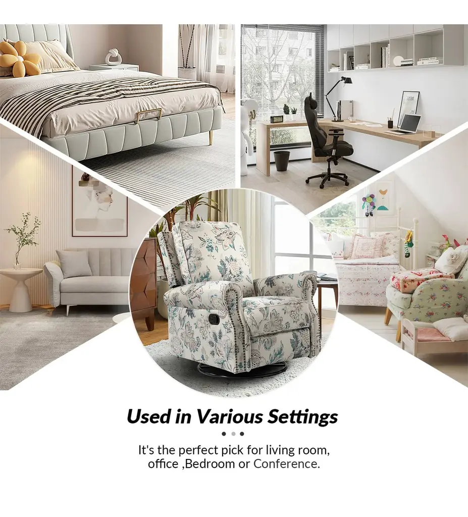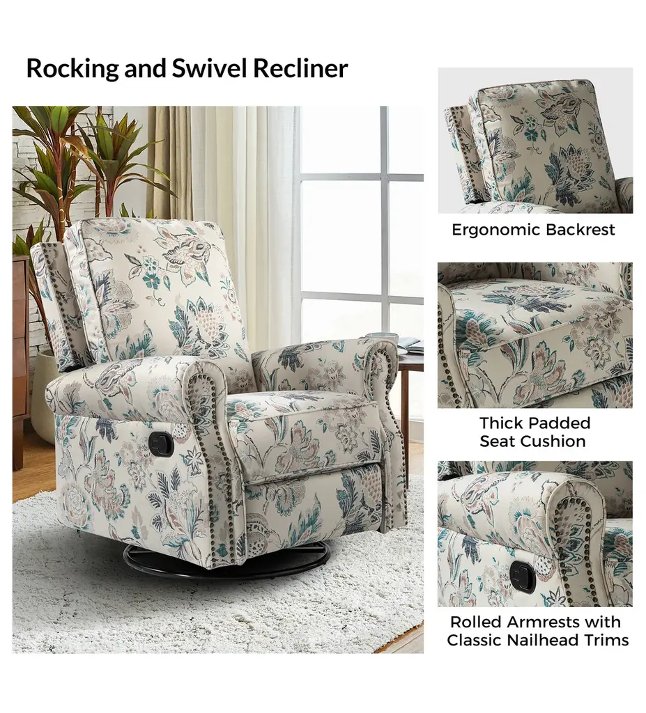 Crafted with human needs in mind, this recliner set features 360 swivel motion, a gliding function, and pop-up leg rest to provide comfort for resting. Ideal for discovering the perfect position that is most comfortable for you, this recliner set will quickly become your new favorite seat in the house. Constructed of soft and durable polyester fabric decorated with chic nail head trims, it offers a timeless design and can be used well for years. This recliner set can be used on many occasions, such as you can sit on it in the living room to enjoy watching TV or you can put it in your study room to enjoy reading books.Product Including: One recliners, assembly required.Relaxation and Comfort: With cozy backrest support, multiple reclining positions, 360�� swivel, and smooth gliding motion, this recliner set is designed to provide full comfort to your body.Strong build: This recliner set has a solid metal base that easily supports swivel rotation and gliding capabilities. It is covered with an easy-to-clean durable polyester fabric with foam filling.Easy Push Design: Use the easy-to-reach lever to control the footrest. Simply push back against the backrest for a comfortable recline.Safety Reminder: Due to the design of the process, all recliners will have a small gap between the left and right sides of the back and the seat cushion. For safety reasons, please pay special attention to the use of children at home to prevent pinching.Product DetailsWeight Capacity: 250lbsLevel of Assembly: Partial AssemblyFrame Material: Manufactured Wood and metalSeat Fill Material: FoamWeights and DimensionsItem Size: 33.5"Wx36"Dx39"HSeat Size: 20.5"Wx19"Dx19.5"HBack height to seat:20.5Item weight: 93.5SpecificationsUpholstered: YesArms Included: YesPillows Included: NoInstructions:Because the size of the product is measured manually, there may be errors.Country of Origin: China