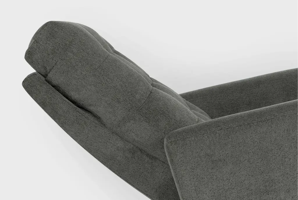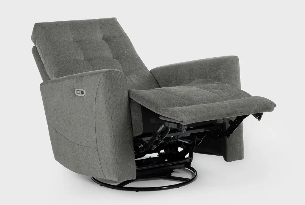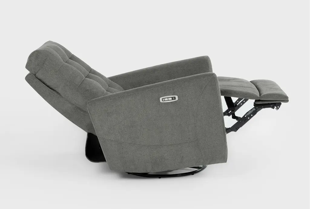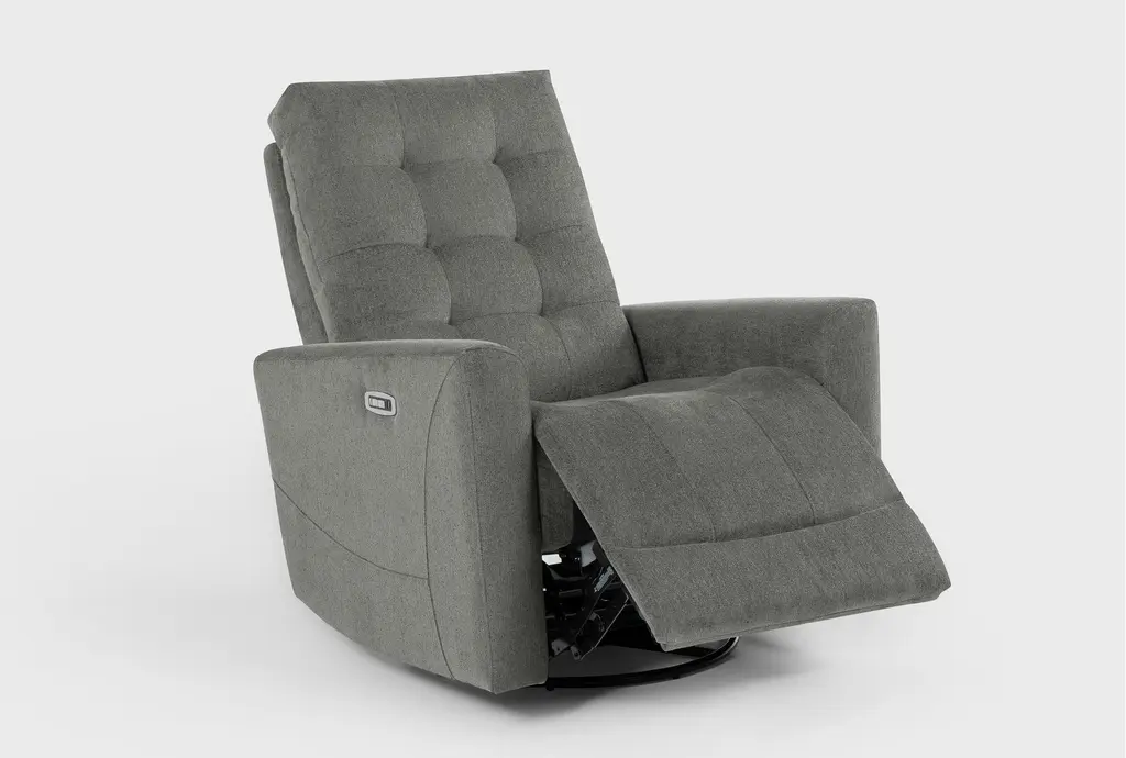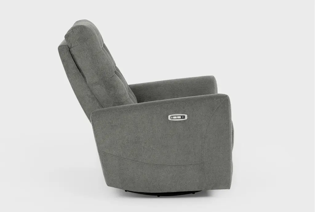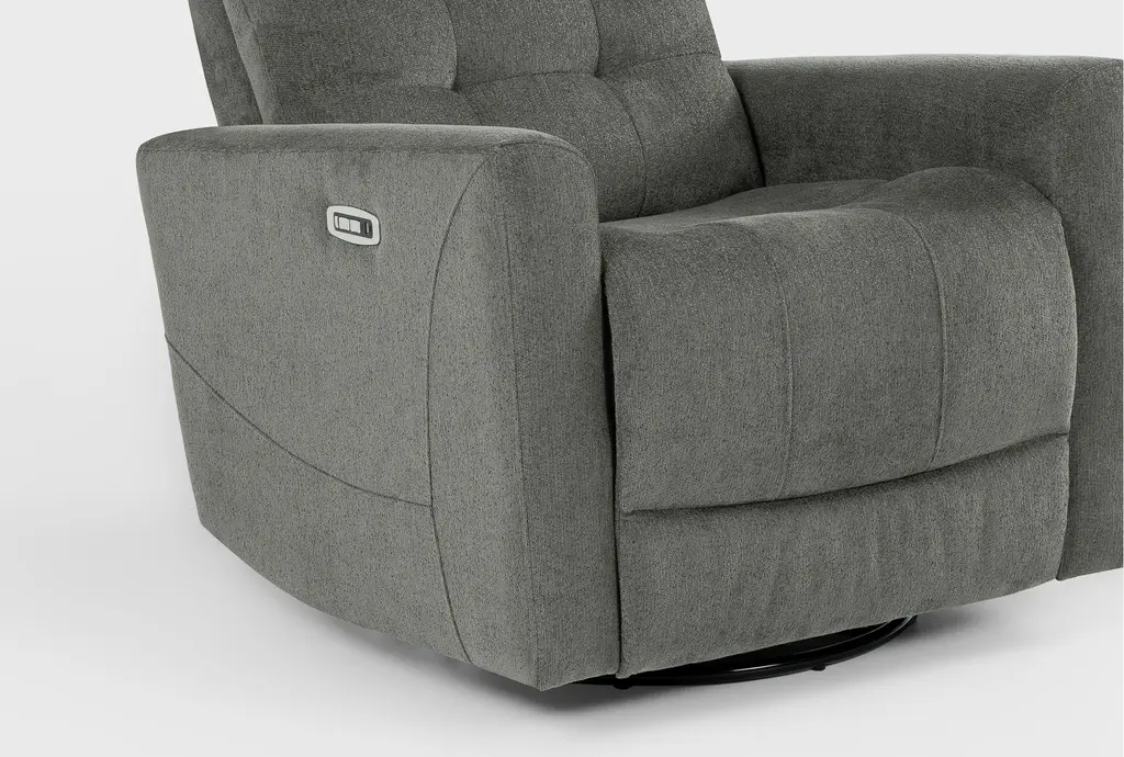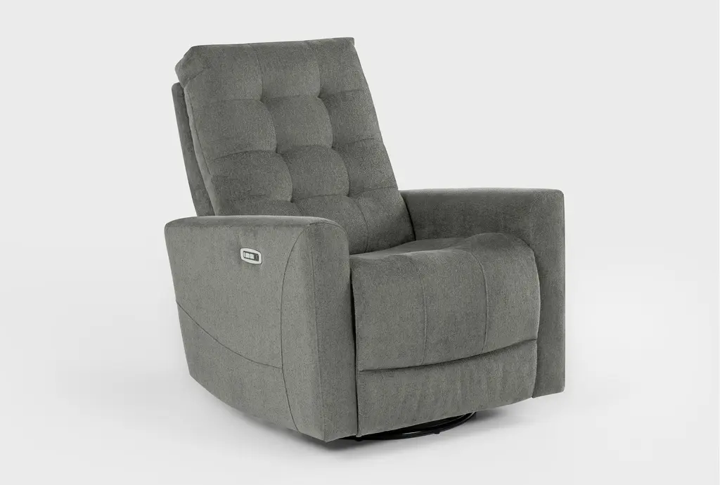 With multiple designs and colors to choose from, our Ansel reclining collection offers a variety of options for your lounging pleasure. The power swivel glider recliner with power headrest and USB boasts clean, modern lines with smooth track arms and grid tufting detail. A strong, sturdy frame is reinforced with wood, plywood and corner-blocking, while the seating promises exceptional support thanks to a foam core with innerspring coils and Dacron wrap. Soft and durable, the upholstery is tailored perfectly.