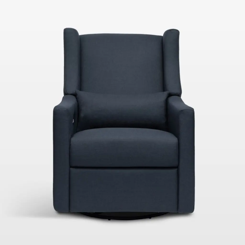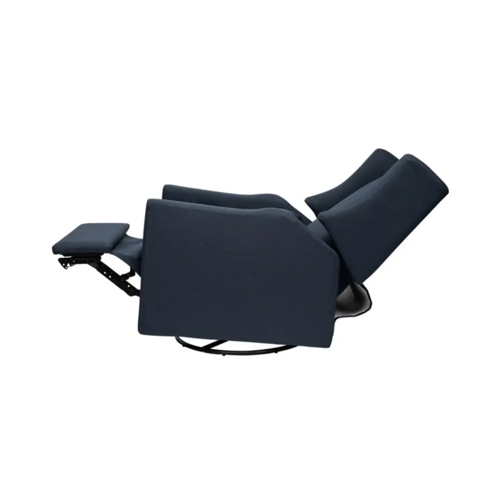 The Babyletto Kiwi Navy Blue Power Recliner Glider provides nurseries with sleek style, comfort and even some peace and quiet. A hidden control panel in the armrest features buttons that control reclining, plus a USB port, so you can have electronics conveniently on hand. And it swivels with a smooth gliding motion, so you won't disrupt your little one's sleep while you get comfortable. Its cozy performance upholstery is both stain-resistant and water-repellent, and it contrasts with the metal swivel base for a subtle touch of luxury.