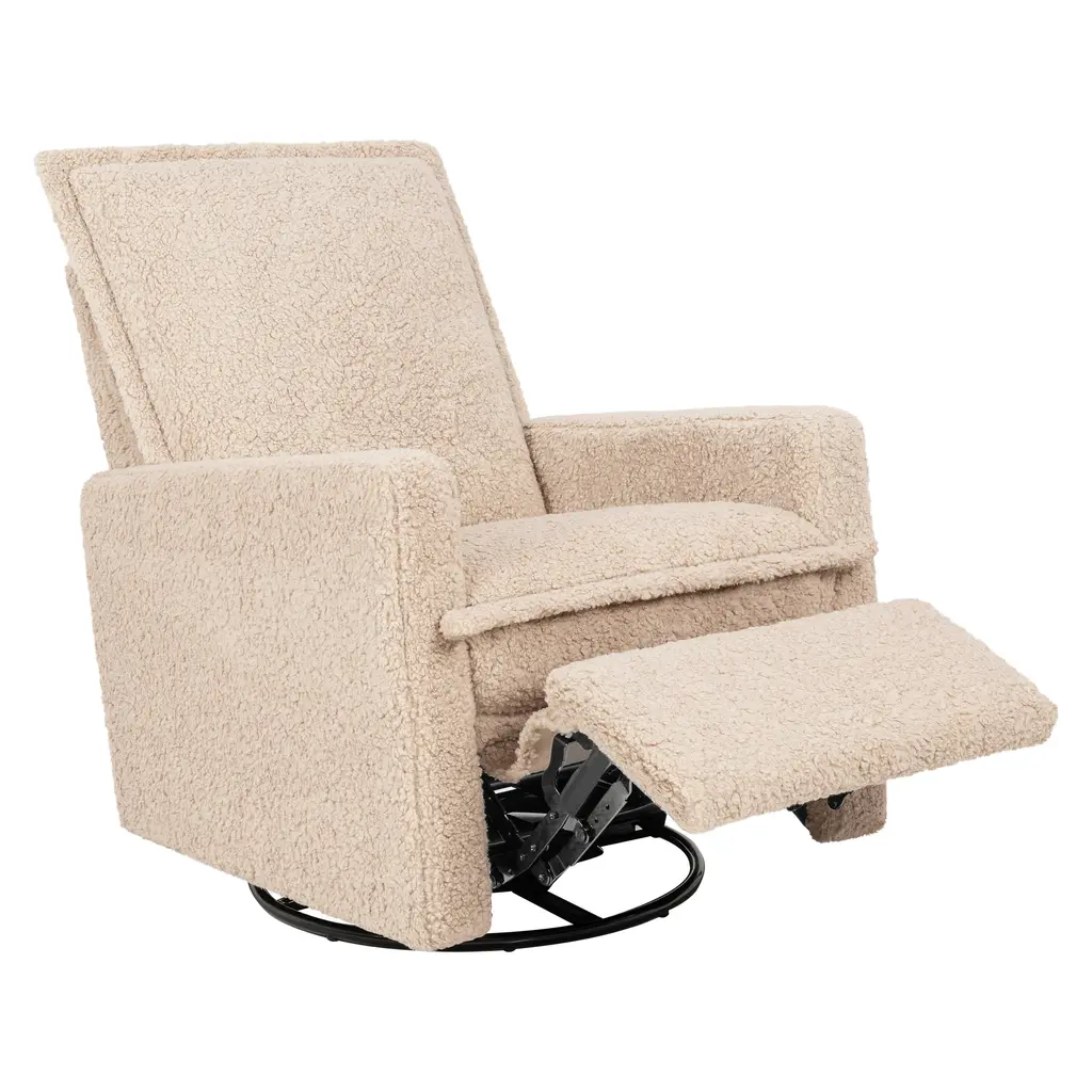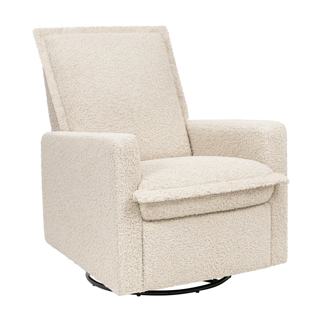 Thoughtfully designed for every feed, snuggle, and storytime, the Cali Flange Recliner and Swivel Glider from Babyletto is the ultimate nursery companion. This cozy chair gently glides, swivels 360 degrees, and features a hidden reclining mechanism for ultimate comfort. Upholstered by hand in a texture-rich shearling fabric with a plush pillowback for head and neck support, it's GREENGUARD GOLD Certified to support cleaner indoor air. A fusion of thoughtful design and safety, it’s the perfect spot to relax with your little one. Highlights: