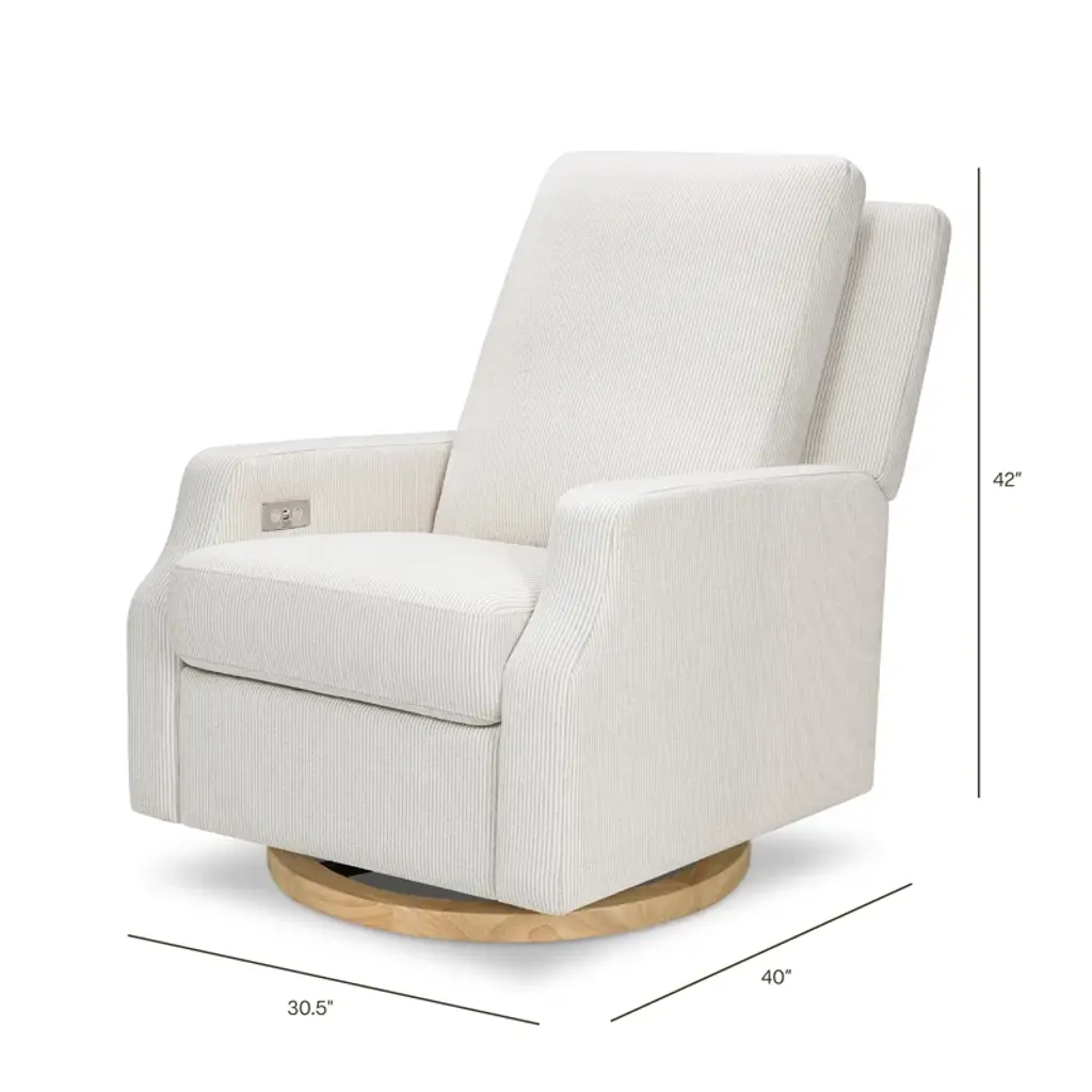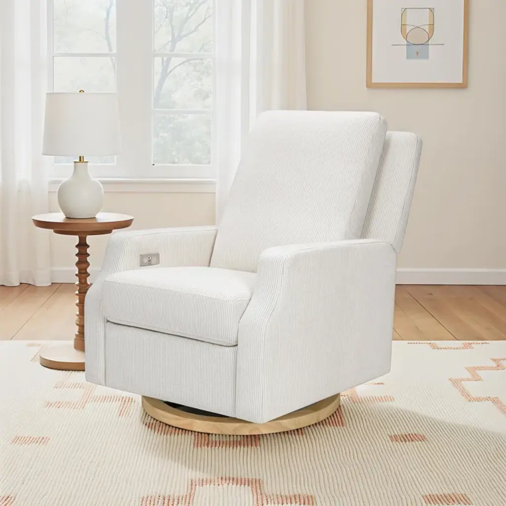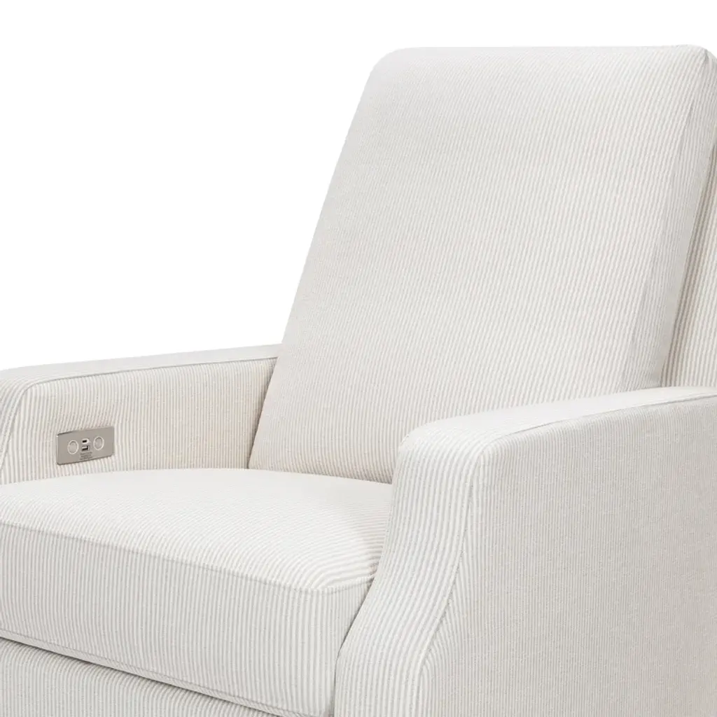 The Crewe recliner blends form and function with its crisp, contemporary design and comfortable seat. Its smooth, back-and-forth gliding motion helps you rock your baby to sleep with ease, while the plush back cushion, electronic recline mechanism, and convenient swivel create an inviting repose for both you and your baby.
