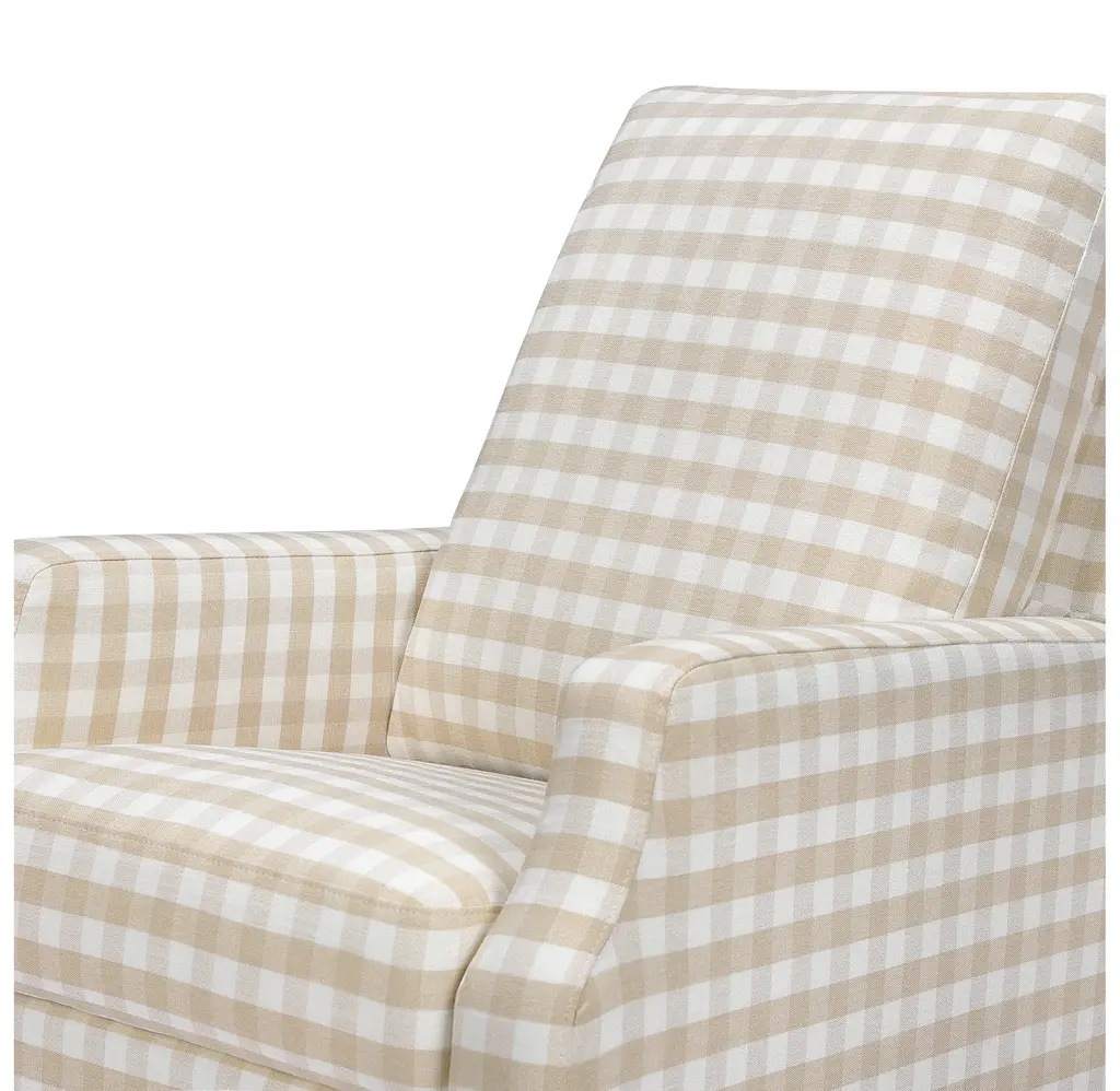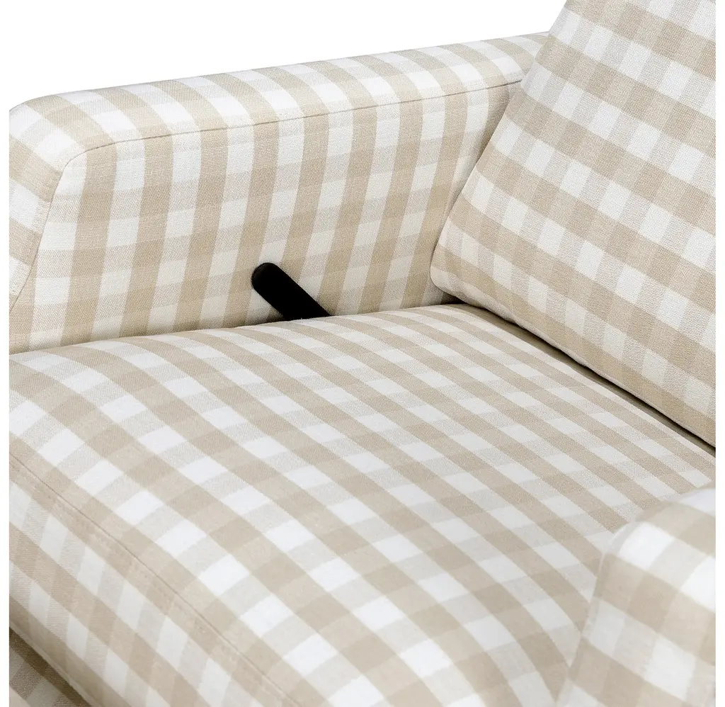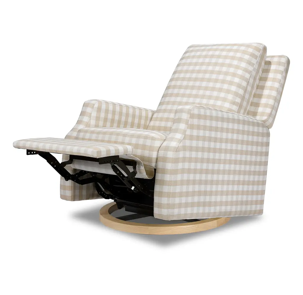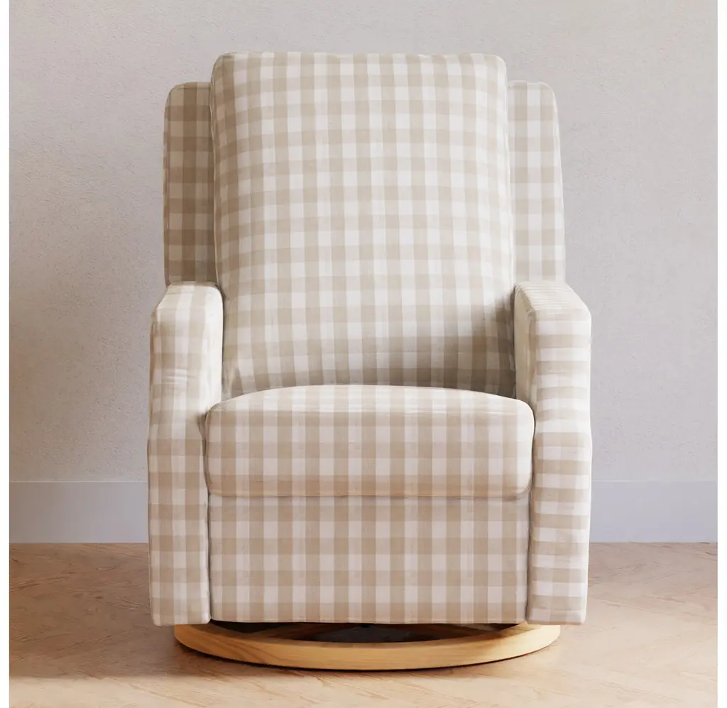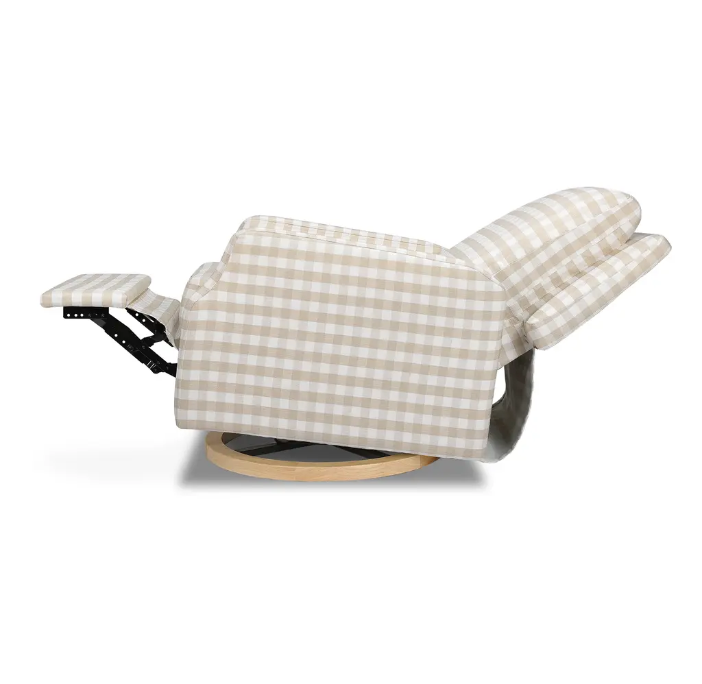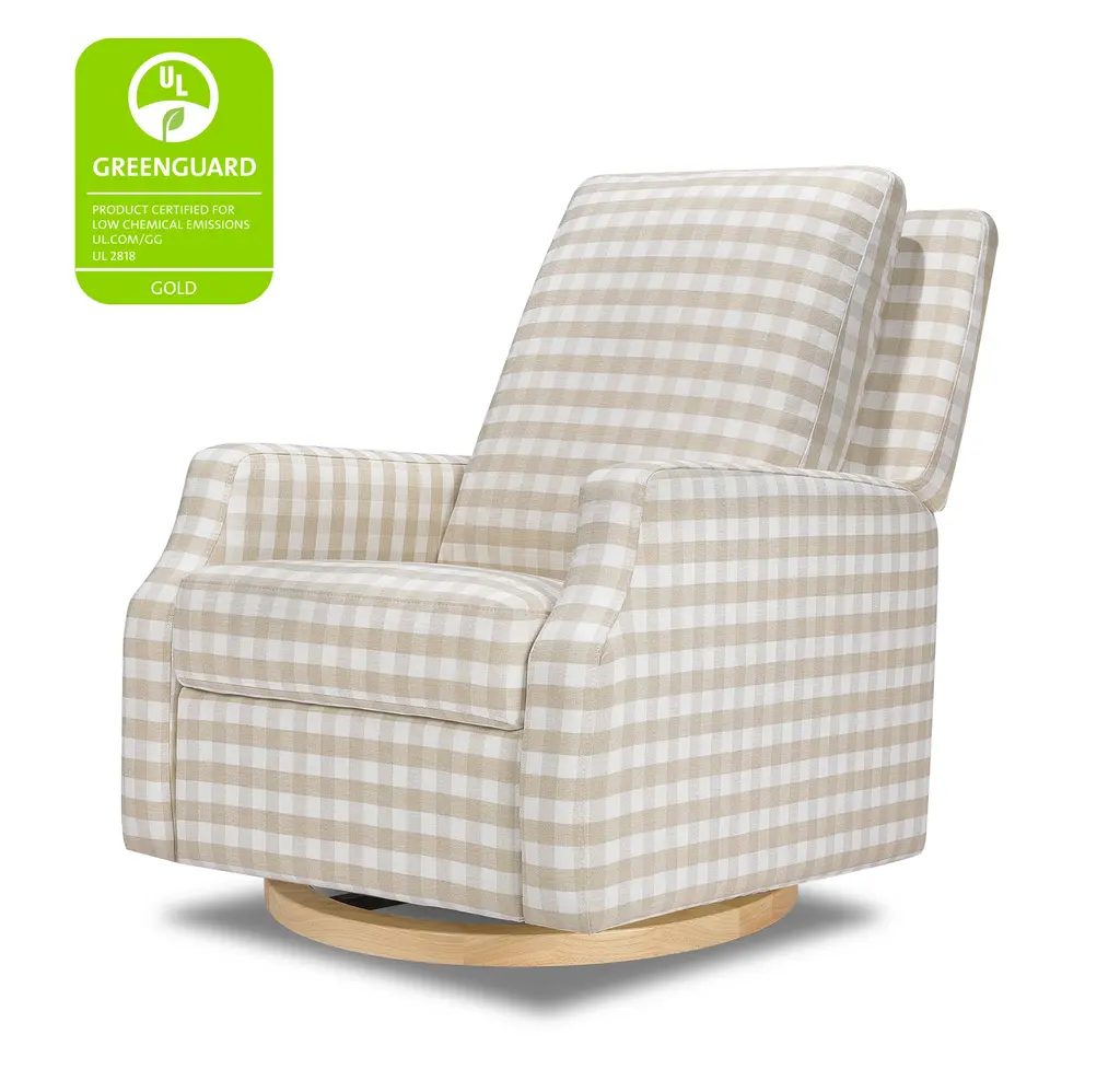 The Crewe Recliner blends form and function with its crisp, contemporary design and comfortable seat. Its smooth, back-and-forth gliding motion helps you rock your baby to sleep with ease, while the plush back cushion, hidden recline mechanism, and convenient swivel create an inviting repose for both you and your baby.The Crewe Recliner blends form and function with its crisp, contemporary design and comfortable seat. Its smooth, back-and-forth gliding motion helps you rock your baby to sleep with ease, while the plush back cushion, hidden recline mechanism, and convenient swivel create an inviting repose for both you and your baby.FEATURES:GREENGUARD GOLD CERTIFIED: This product has been tested for over 10,000 chemical emissions and VOCs, undergoing rigorous scientific testing to meet some of the world's most stringent chemical emissions requirements. It contributes to cleaner indoor air to ensure the health and safety of your family and home.EASY RECLINE and EFFORTLESS GLIDE: Cuddle up, recline, and get cozy. Our hidden reclining mechanism maintains a clean design while offering traditional comfort. Whether you are feeding baby or rocking baby to sleep, our metal base allows for a smooth and gentle 360 degree swivel motion as well as forward and backward gliding.COMFORTABLE and DURABLE: This recliner features plush arm rests and a soft back for extra comfort.BREATHE EASY: Foam used in the seat meets all CA TB117-2013 flammability requirements and is CertiPUR-US certified, certifying the foam is made without PBDE or Tris flame retardants, heavy metals, formaldehyde, CFCs and phthalates regulated by the CPSC.FSC CERTIFIED WOOD: Wood used in the frame of this product comes from well-managed, FSC-certified forests. The FSC label means that wood has been harvested to benefit communities, wildlife, and the environment.TIMELESS STYLE: Our highly sought-after Crewe Glider designed in a classic gingham fabric. A nursery statement piece created with traditional details and timeless style in mind.EASY SET UP: Just a few simple steps - no tools required.