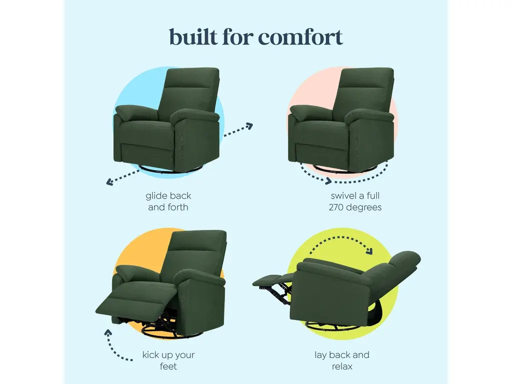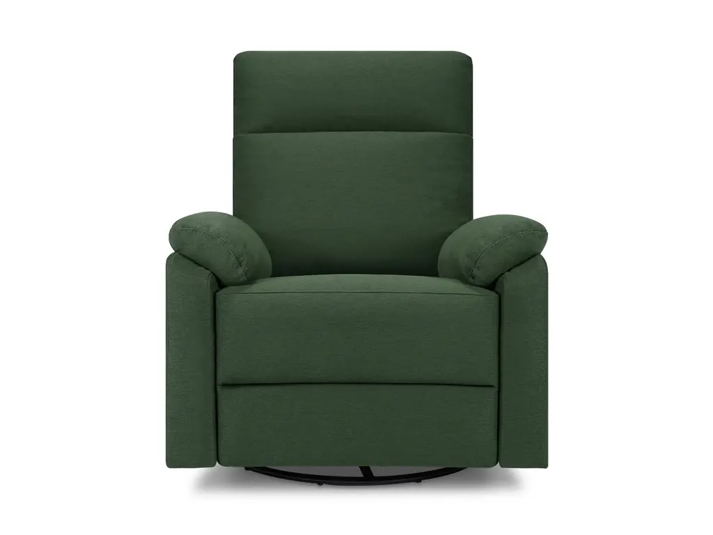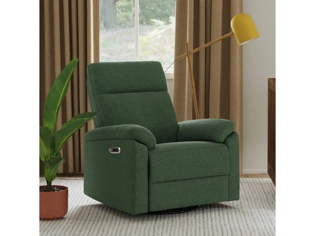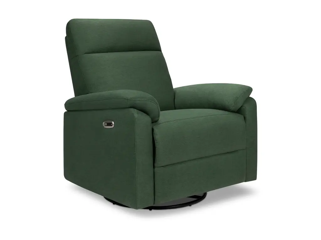 The Suzy Electronic Recliner and Swivel Glider has been thoughtfully crafted with cushioned armrests to provide optimal support and comfort to meet parent's and baby's feeding time needs. Moms and dads can rest easy in this comfortable, durable chair that swivels and has an automatic recline button that ensures a seamless transition from sitting to a peaceful reclined resting position. Designed with a high pillowback for head and neck support and a USB port for convenience, you'll find yourself wanting to drift off into a peaceful slumber. This modern and versatile design can easily transition to your home in the later years.