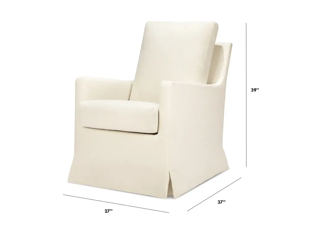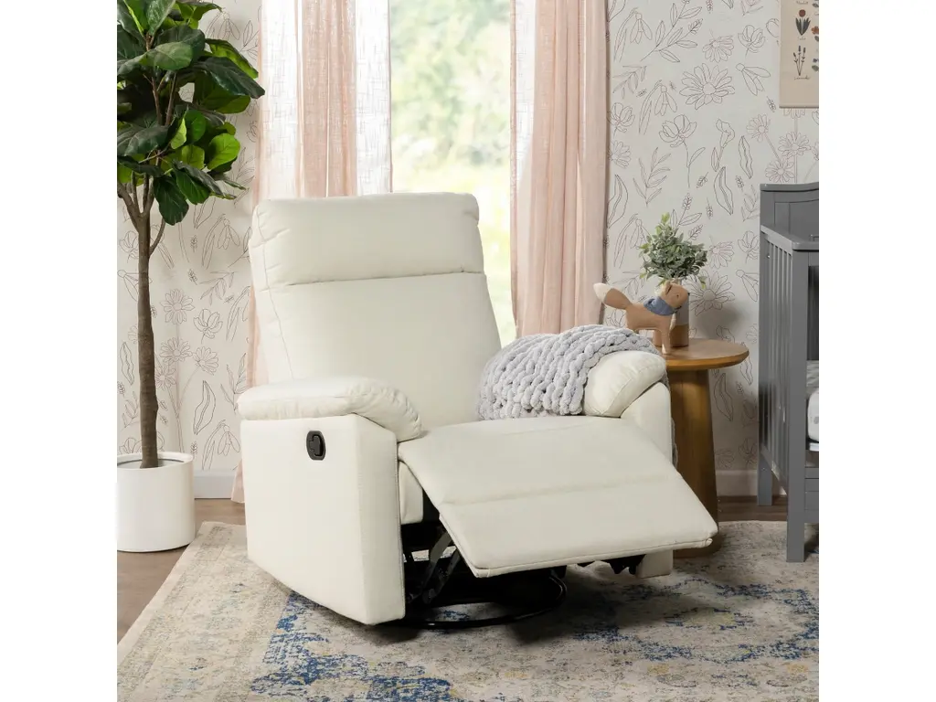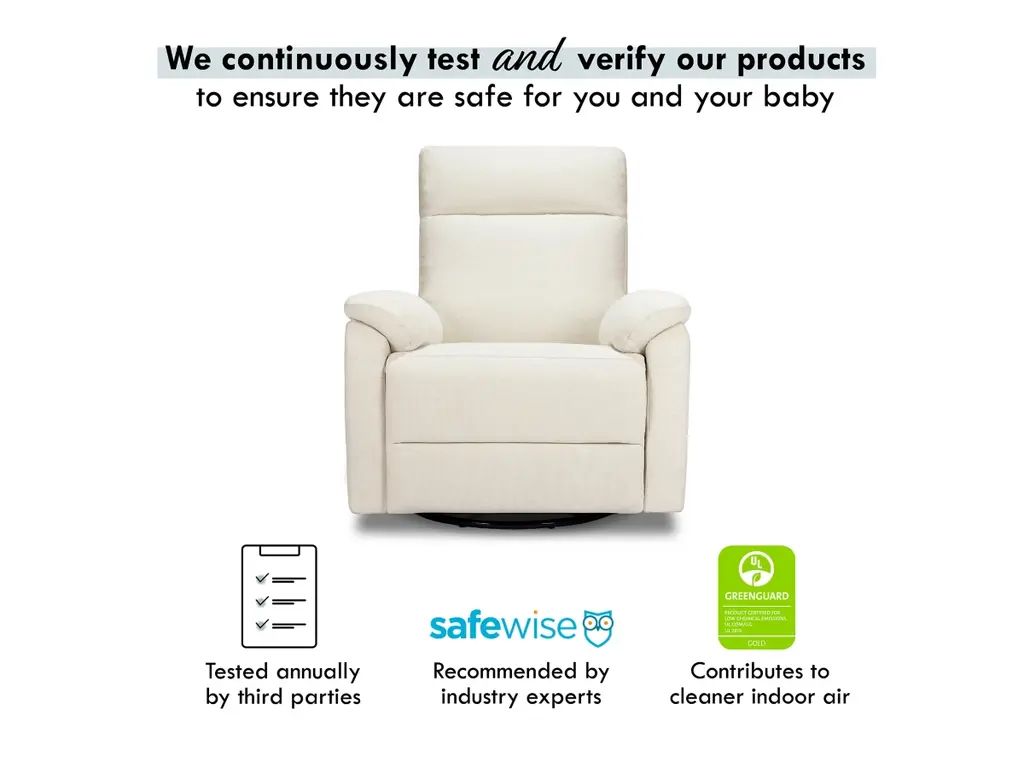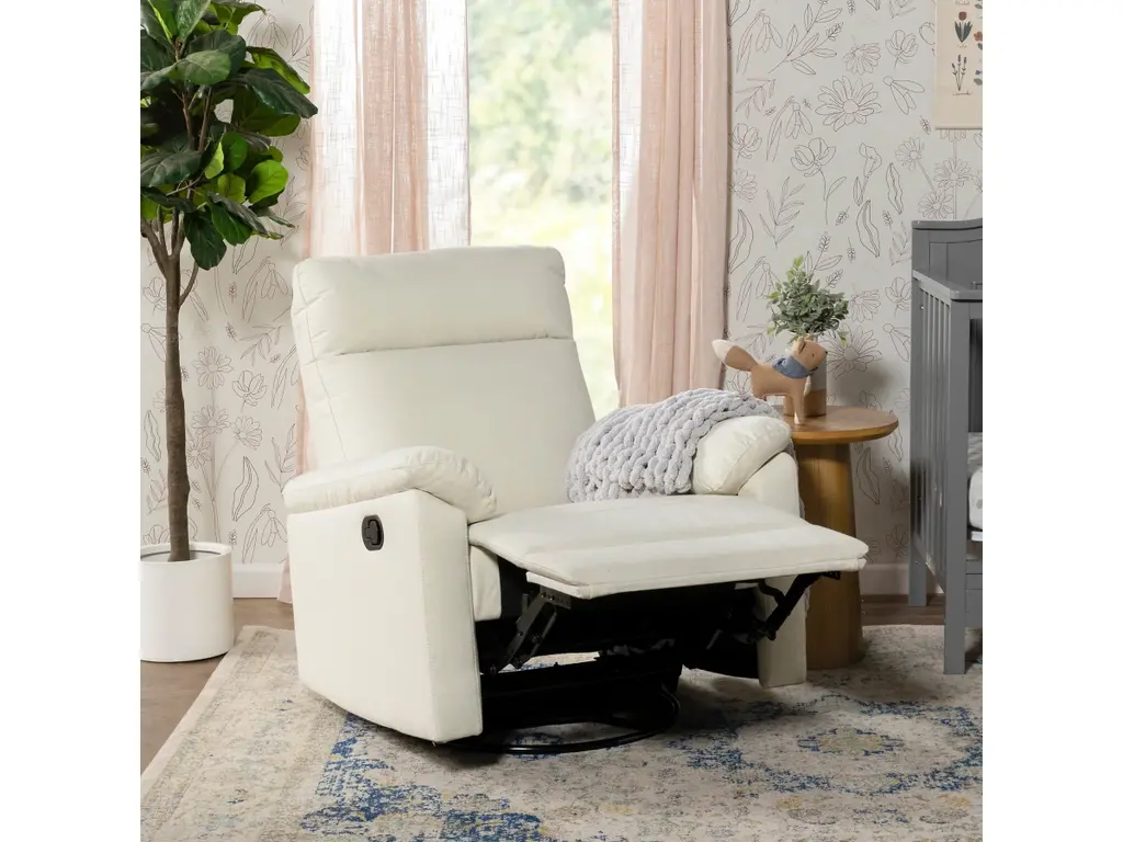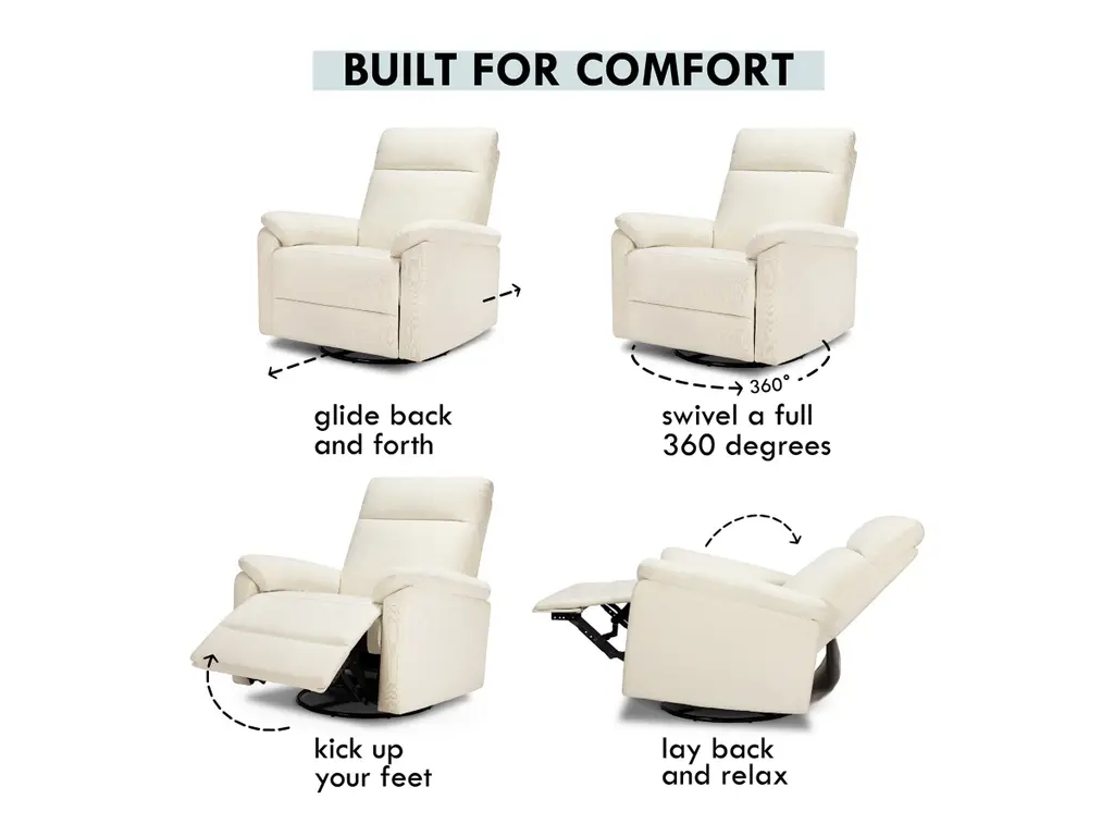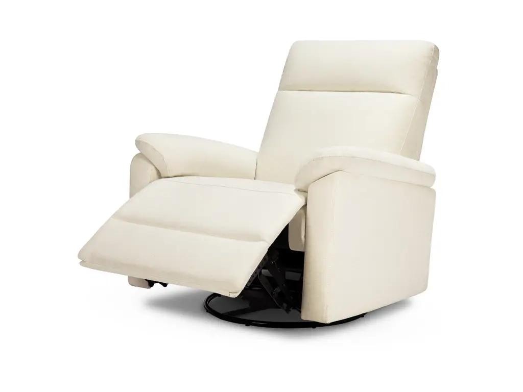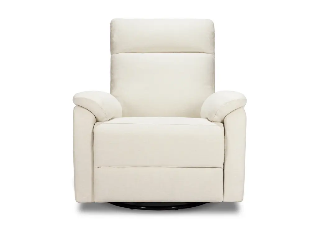 The Suzy recliner and swivel glider has been thoughtfully crafted with cushioned armrests to provide optimal support and comfort to meet parent’s and baby’s feeding time needs. Moms and dads can rest easy in this comfortable chair that swivels and has a smooth and easy-to-use mechanism that ensures a seamless transition from sitting to a peaceful reclined resting position. Designed with a high pillow back for head and neck support, you'll find yourself wanting to drift off into a peaceful slumber. This modern and versatile design can easily transition to your home in the later years.