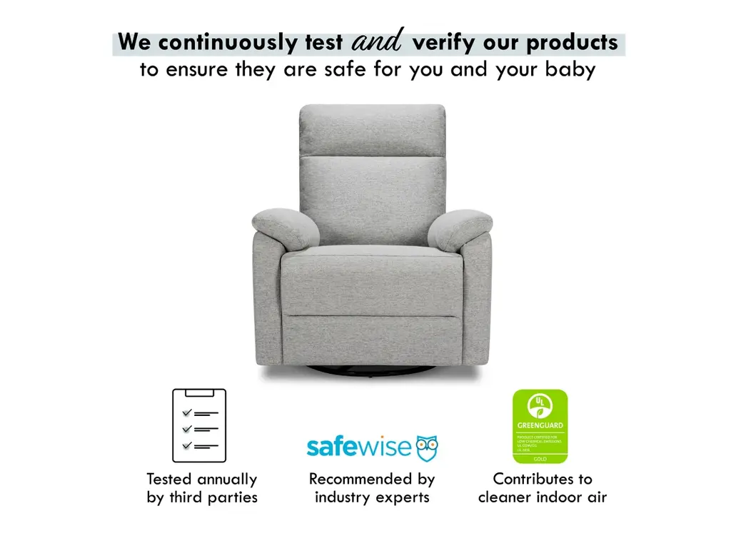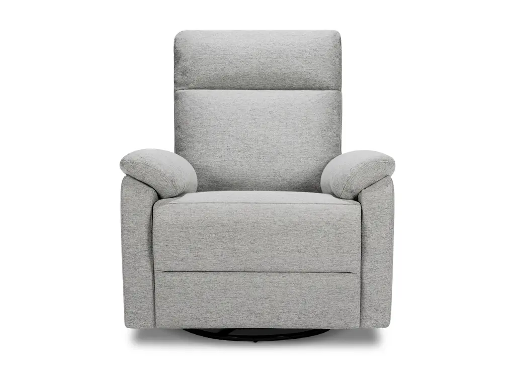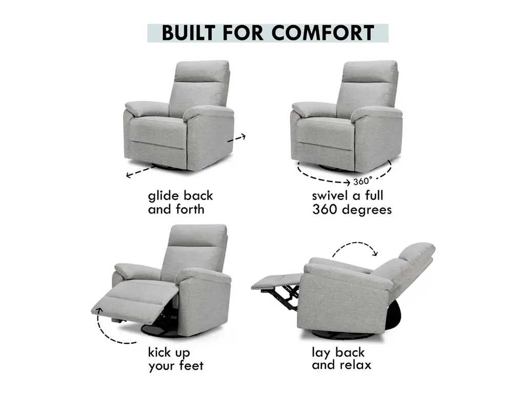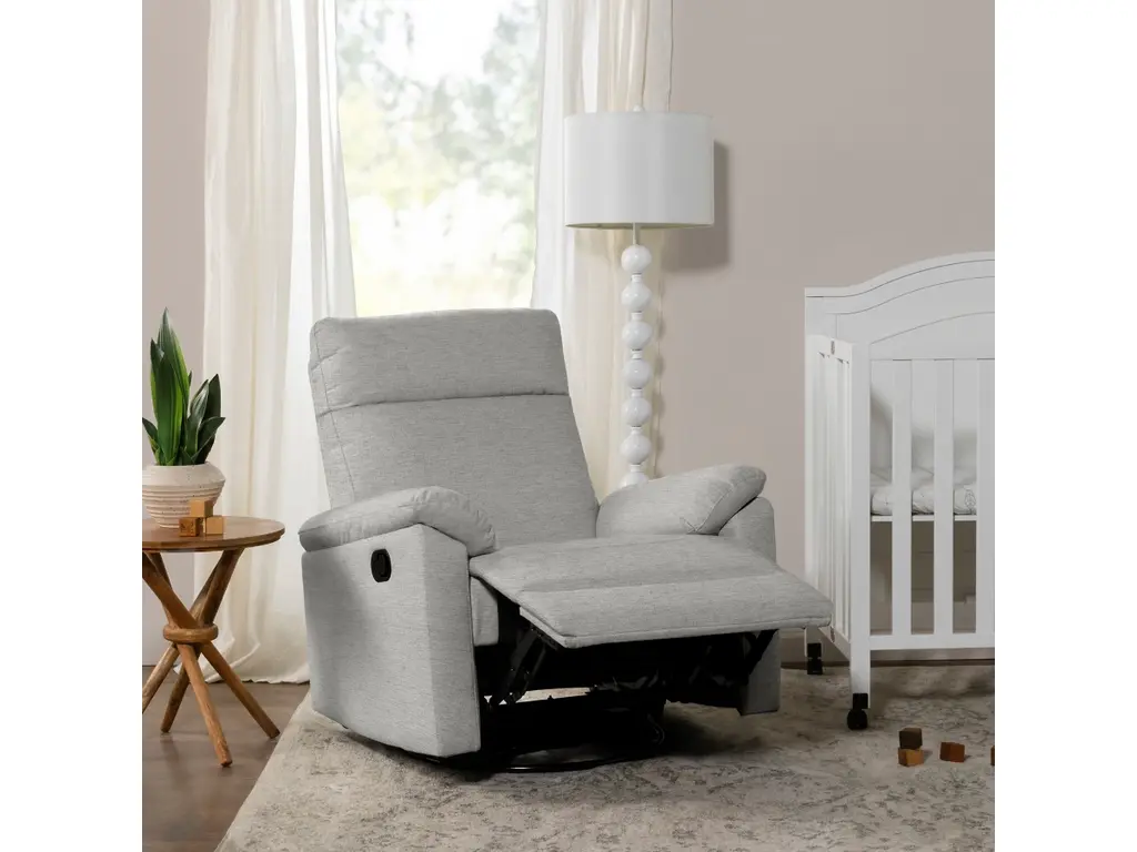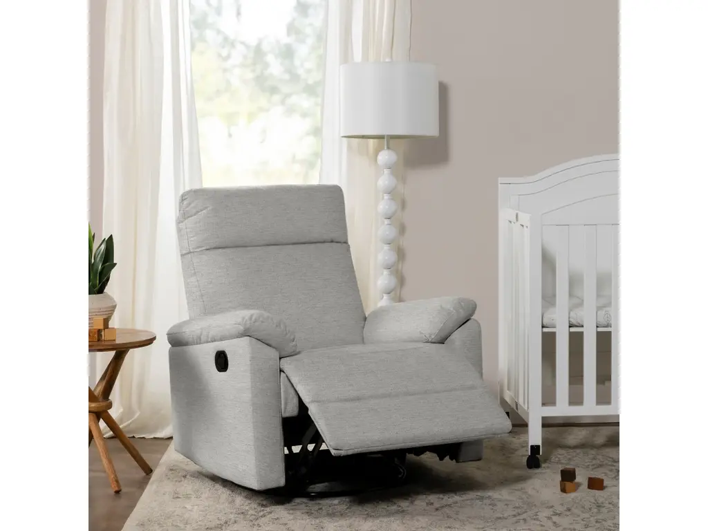 The Suzy recliner and swivel glider has been thoughtfully crafted with cushioned armrests to provide optimal support and comfort to meet parent’s and baby’s feeding time needs. Moms and dads can rest easy in this comfortable chair that swivels and has a smooth and easy-to-use mechanism that ensures a seamless transition from sitting to a peaceful reclined resting position. Designed with a high pillow back for head and neck support, you'll find yourself wanting to drift off into a peaceful slumber. This modern and versatile design can easily transition to your home in the later years.