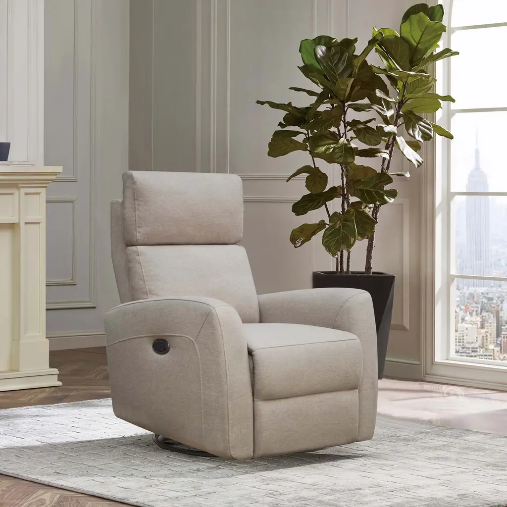Upholstered in soft camel fabric, the Dillan also includes a built-in USB charger, making it an ideal choice for nurseries or any room where convenience and comfort are priorities.
