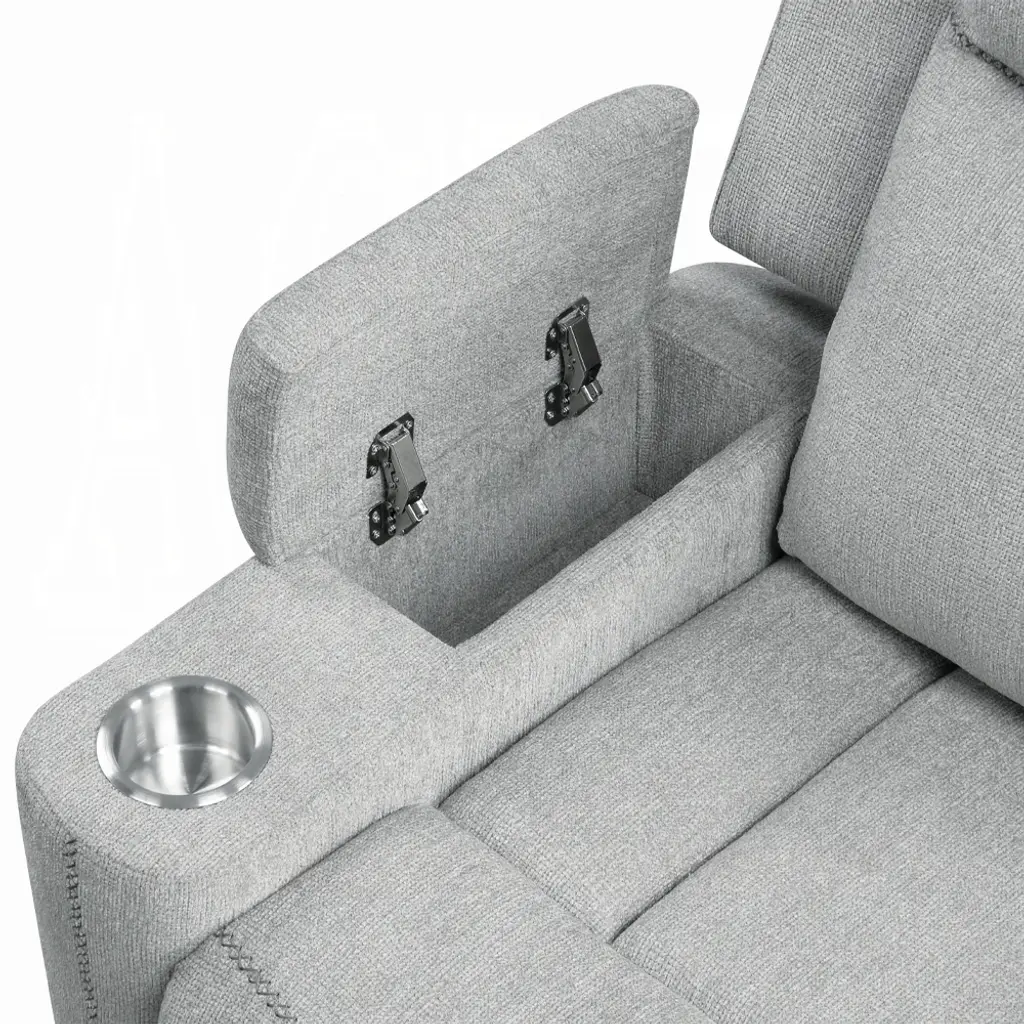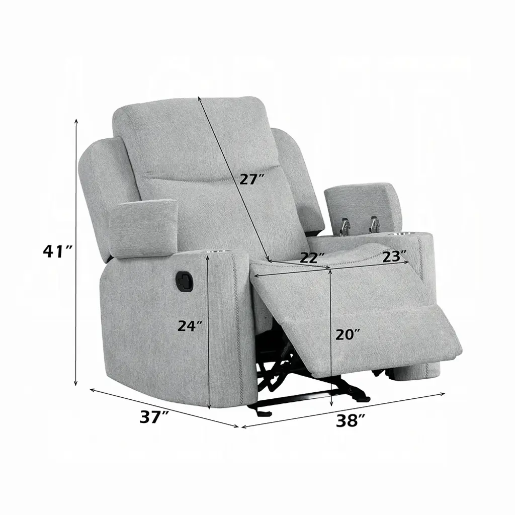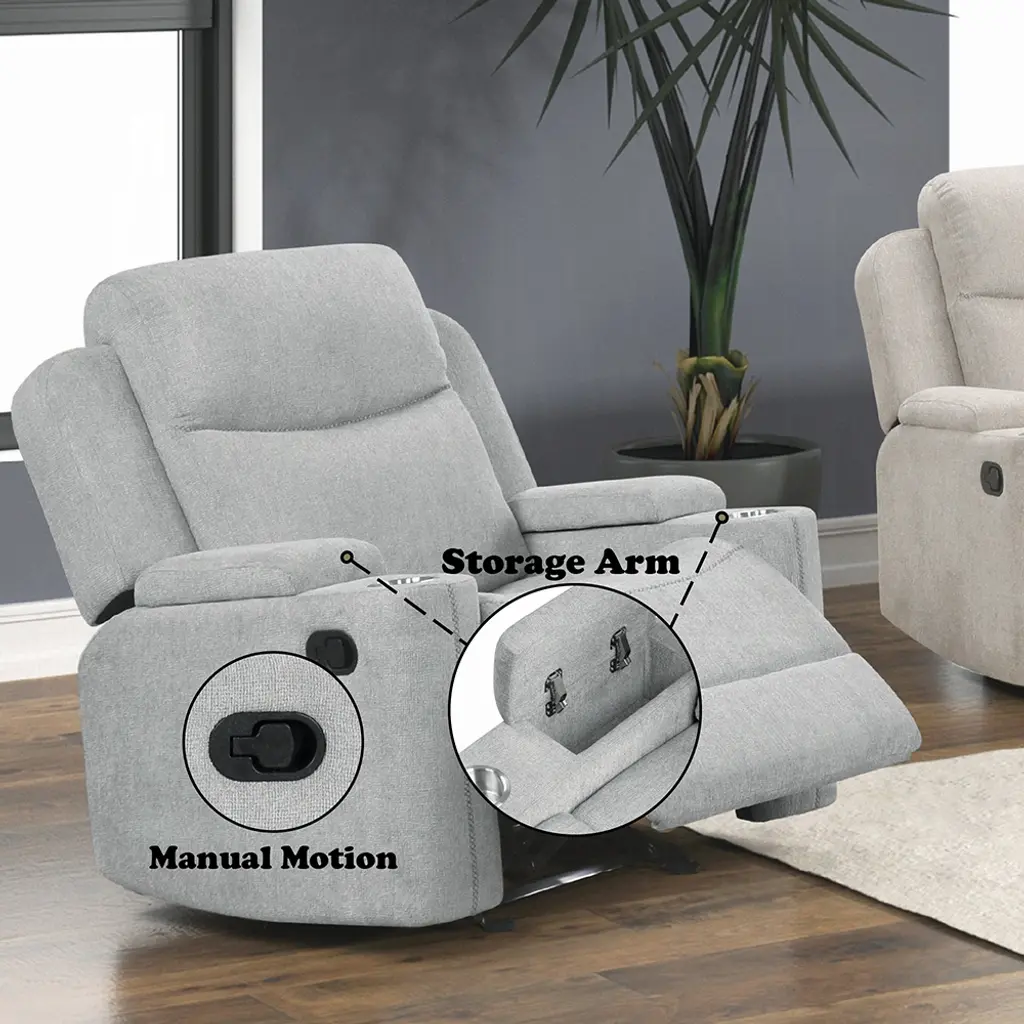 Introducing the Galya Motion Sofa Collection, where contemporary design meets ultimate comfort. Upholstered in sumptuous light gray chenille, this collection offers a soft, inviting texture that enhances any living space. The thoughtful addition of storage arms provides convenient space for your essentials, ensuring your relaxation is uninterrupted. With its sleek lines and plush cushioning, the Galya Collection transforms your home into a haven of modern elegance and functionality. Experience the perfect blend of style and practicality with the Galya Motion Sofa Collection.