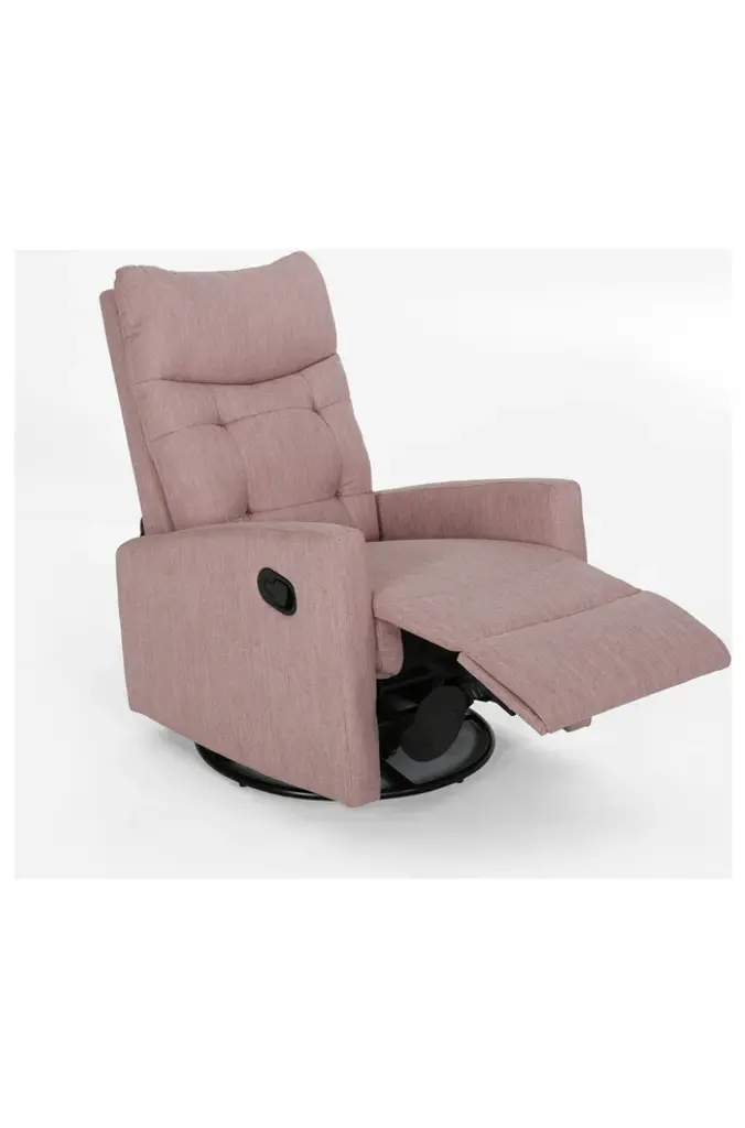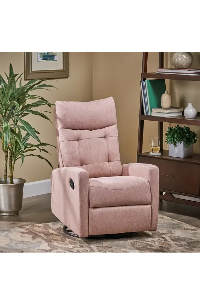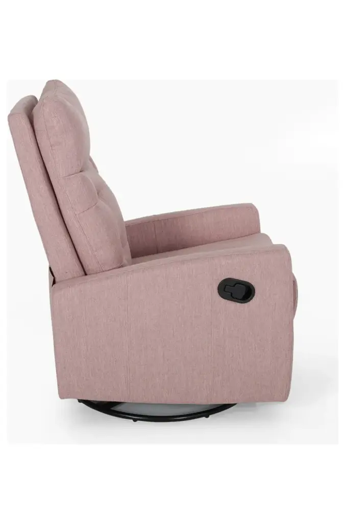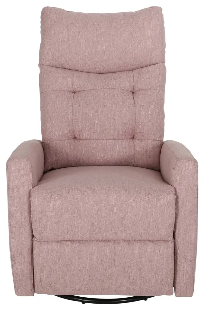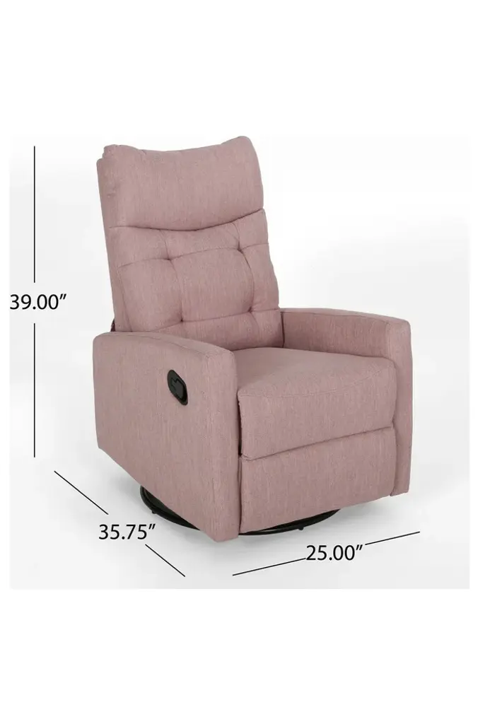 Create a corner of utmost coziness starting from our push-back recliner that features both gliding and swivel functions. From its tufted design to its plush seating, this contemporary piece brings both elegance and comfort to your home. Our recliner's many functions allow this chair to be extremely versatile, ranging from a perfect nursery recliner to the ideal place to relax in your living room. With its minimalistic style and soft colors, our practical recliner will blend seamlessly with any home decor.CONTEMPORARY: This recliner chair features all the major points of the contemporary style. Featuring a tufted backrest and clean, straight lines, this chair offers a minimalistic look that is highly functional for your home.PUSH-BACK RECLINER: This recliner is a push-back recliner that allows you to lay back and relax after a long day. Simply use your body weight to push the chair back to recline and tilt your body weight forward and upwards to bring it back to the upright position.GLIDER AND SWIVEL FUNCTIONS: With a wonderfully relaxing gliding feature and a convenient swivel function, our recliner offers the ultimate comfort. Ideal for discovering the perfect position that is most comfortable for you, this recliner will quickly become your new favorite seat in the house.VERSATILE: This recliner chair is not only perfect for nurseries, but for your living room and reading nooks as well. Curl up with your favorite book or enjoy the gentle rocking motion while you relax in your room before going to bed.ASSEMBLY REQUIRED: Some assembly is required for this recliner. All of the instructions and tools needed for assembly are included.Includes: One (1) Recliner ChairFrame Material: IronCushion Material: FabricFabric Composition: 100% PolyesterFrame Finish: BlackCushion Color: Light BlushHand-Crafted DetailsAssembly RequiredDimensions: 35.75 inches deep x 25.00 inches wide x 39.00 inches highReclined Dimensions: 63.00 inches deep x 25.00 inches wide x 30.50 inches highSeat Dimensions: 20.50 inches deep x 18.25 inches wide x 19.00 inches highArm Height: 22.25 inches