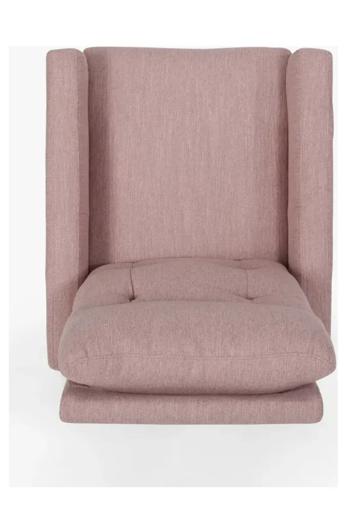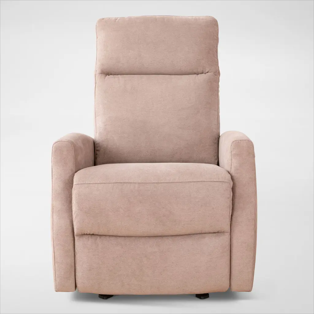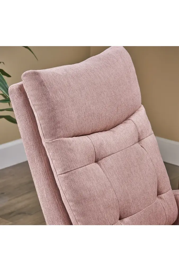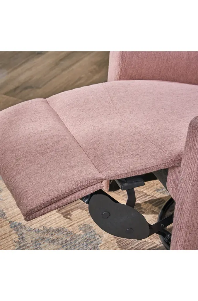 Create a corner of utmost coziness starting from our push-back recliner that features both gliding and swivel functions. From its tufted design to its plush seating, this contemporary piece brings both elegance and comfort to your home. Our recliner's many functions allow this chair to be extremely versatile, ranging from a perfect nursery recliner to the ideal place to relax in your living room. With its minimalistic style and soft colors, our practical recliner will blend seamlessly with any home decor.CONTEMPORARY: This recliner chair features all the major points of the contemporary style. Featuring a tufted backrest and clean, straight lines, this chair offers a minimalistic look that is highly functional for your home.PUSH-BACK RECLINER: This recliner is a push-back recliner that allows you to lay back and relax after a long day. Simply use your body weight to push the chair back to recline and tilt your body weight forward and upwards to bring it back to the upright position.GLIDER AND SWIVEL FUNCTIONS: With a wonderfully relaxing gliding feature and a convenient swivel function, our recliner offers the ultimate comfort. Ideal for discovering the perfect position that is most comfortable for you, this recliner will quickly become your new favorite seat in the house.VERSATILE: This recliner chair is not only perfect for nurseries, but for your living room and reading nooks as well. Curl up with your favorite book or enjoy the gentle rocking motion while you relax in your room before going to bed.ASSEMBLY REQUIRED: Some assembly is required for this recliner. All of the instructions and tools needed for assembly are included.Includes: One (1) Recliner ChairFrame Material: IronCushion Material: FabricFabric Composition: 100% PolyesterFrame Finish: BlackCushion Color: Light BlushHand-Crafted DetailsAssembly RequiredDimensions: 35.75 inches deep x 25.00 inches wide x 39.00 inches highReclined Dimensions: 63.00 inches deep x 25.00 inches wide x 30.50 inches highSeat Dimensions: 20.50 inches deep x 18.25 inches wide x 19.00 inches highArm Height: 22.25 inches