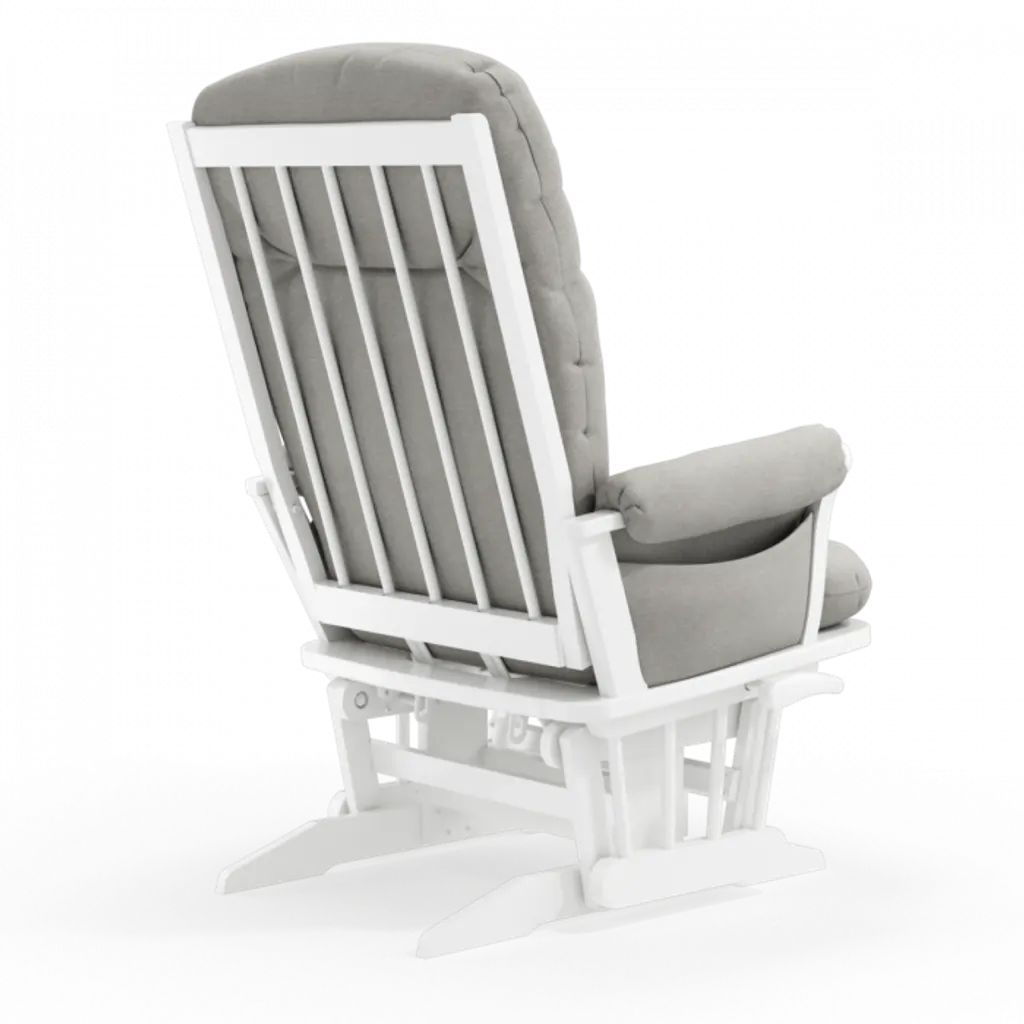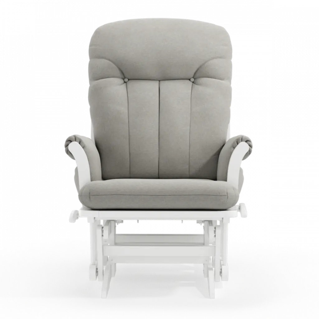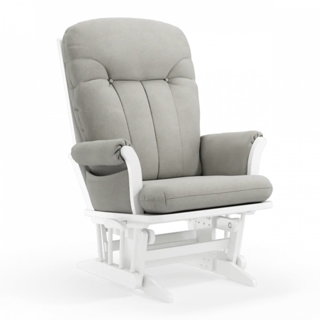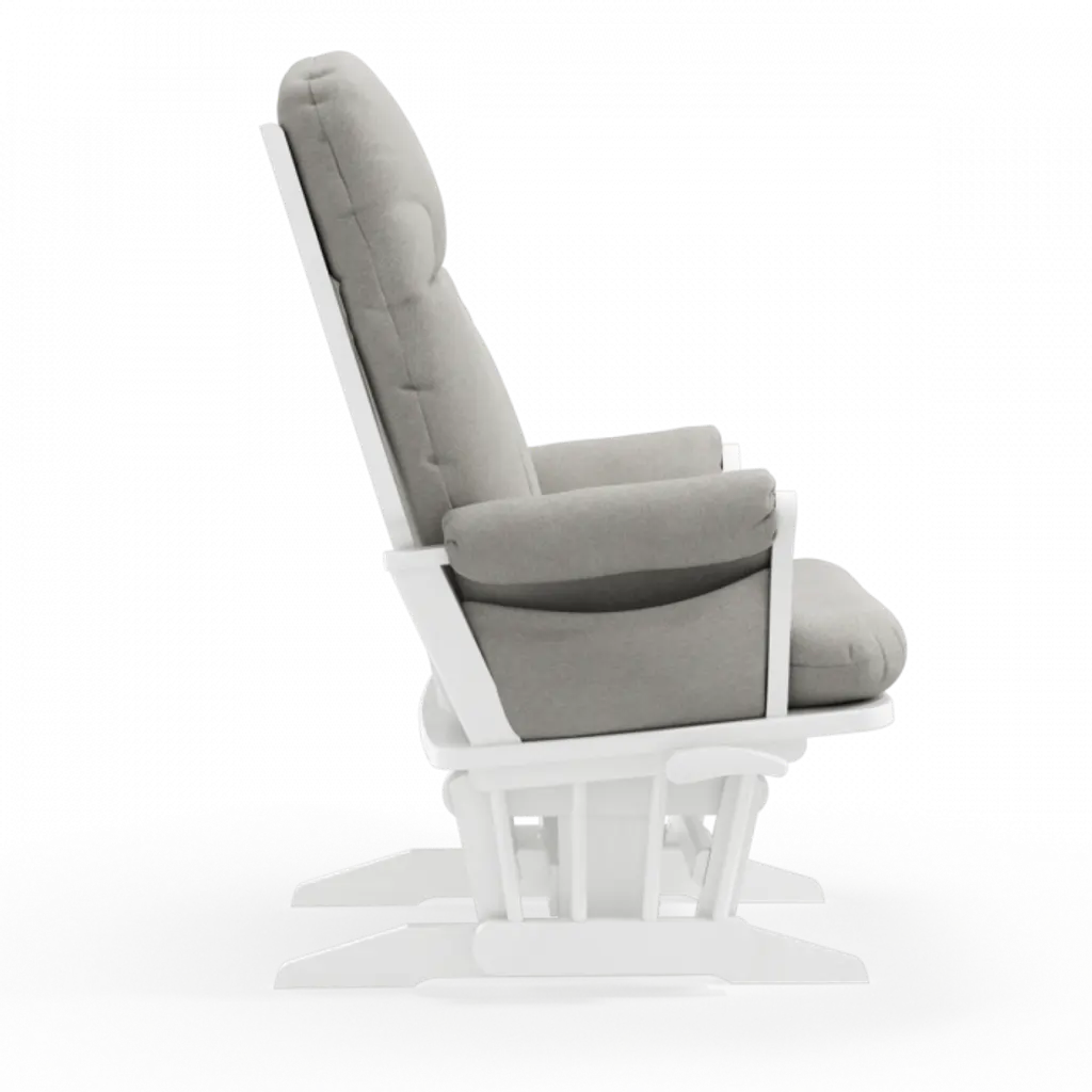 Compared to our regular glider chairs, the seat is 3 inches wider, the back 3 inches higher, and the cushion 0.5 inches thicker. Ideal for people 6 feet and over. Perfectly designed to support your back. High backrest that supports the head really well. Armrest height ideal for nursing and supporting baby over long periods of time. Matching ottoman available.