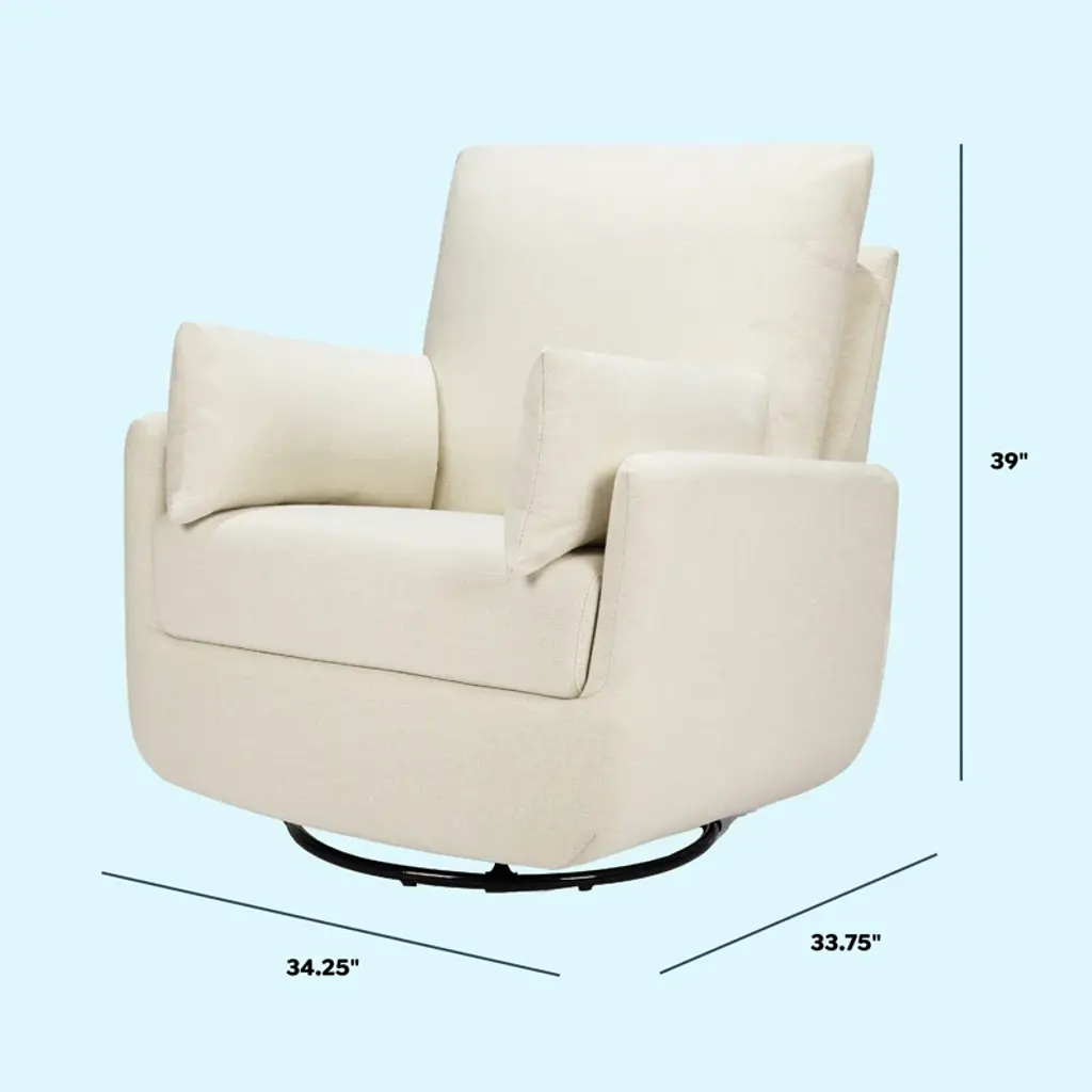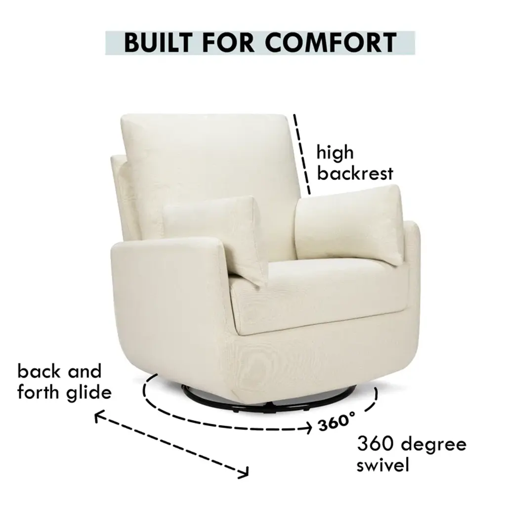 The Juno Swivel Glider is a modern unique U-shaped glider featuring cushions on each side to provide exceptional support and comfort while feeding, reading, or snuggling with your little one. Mom and Dad can rest easy in this comfortable and durable glider that glides forward and backward as well as swivels. With its unique design, this glider adds a touch of playfulness to any nursery and the versatile design can easily transition to your home in the later years.